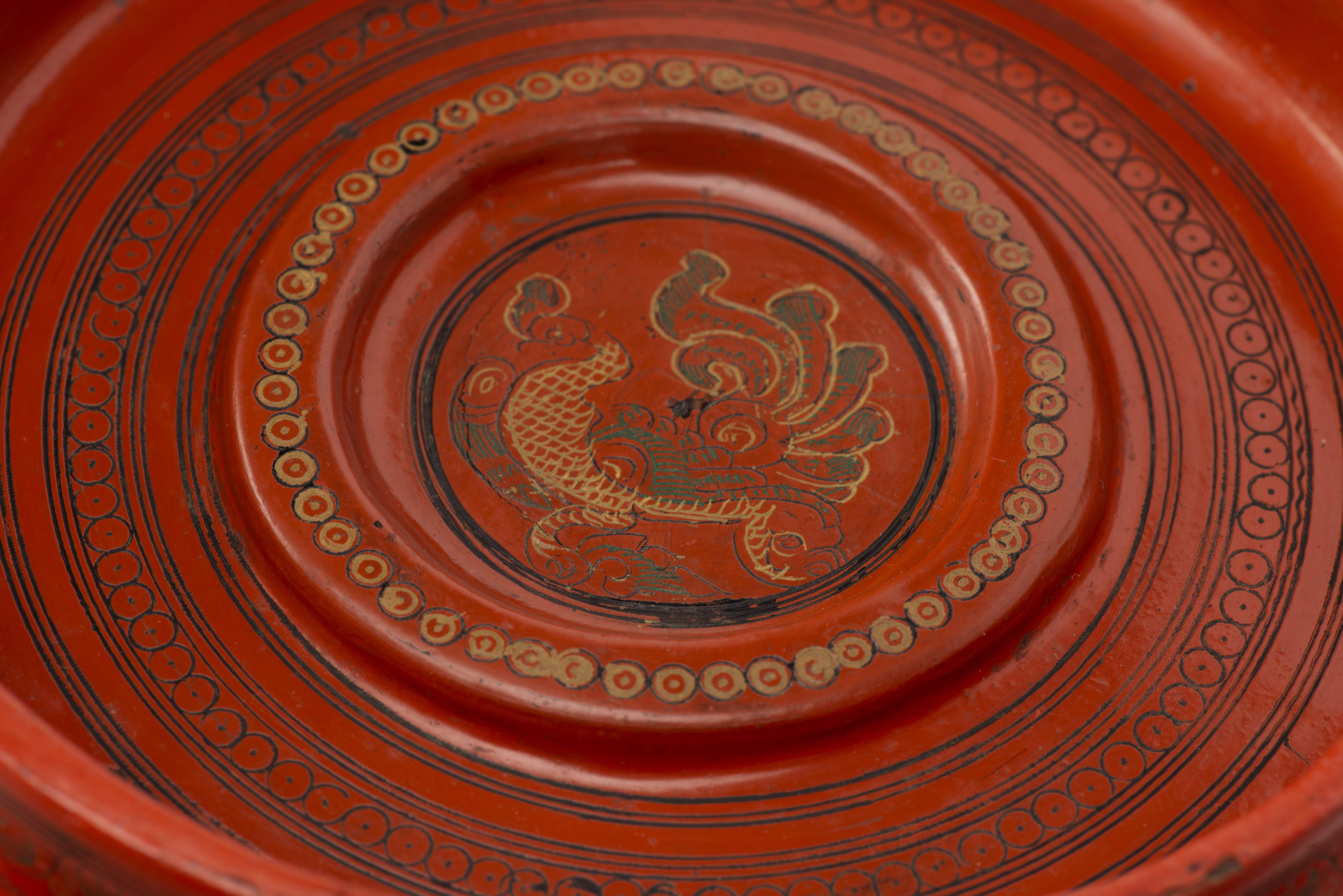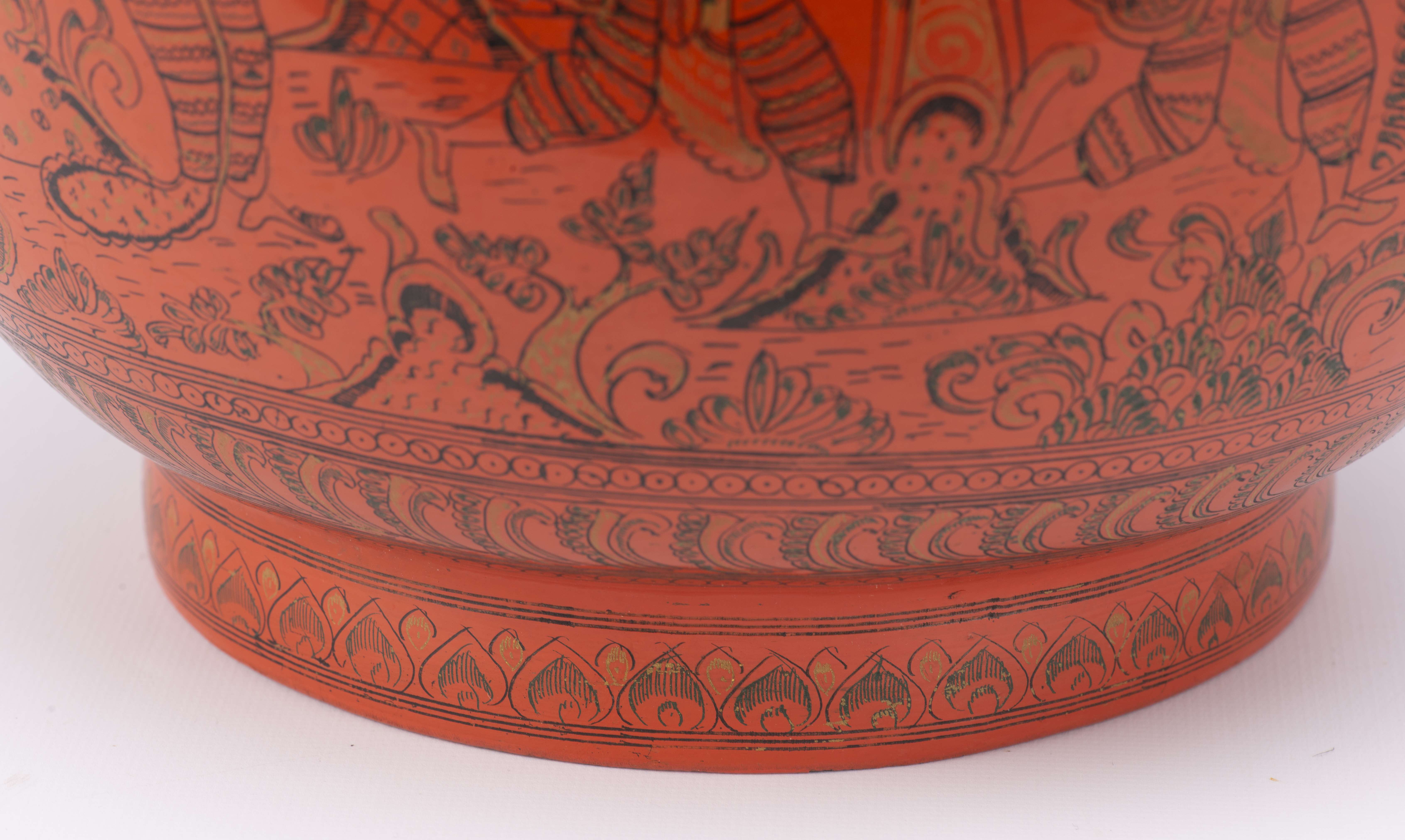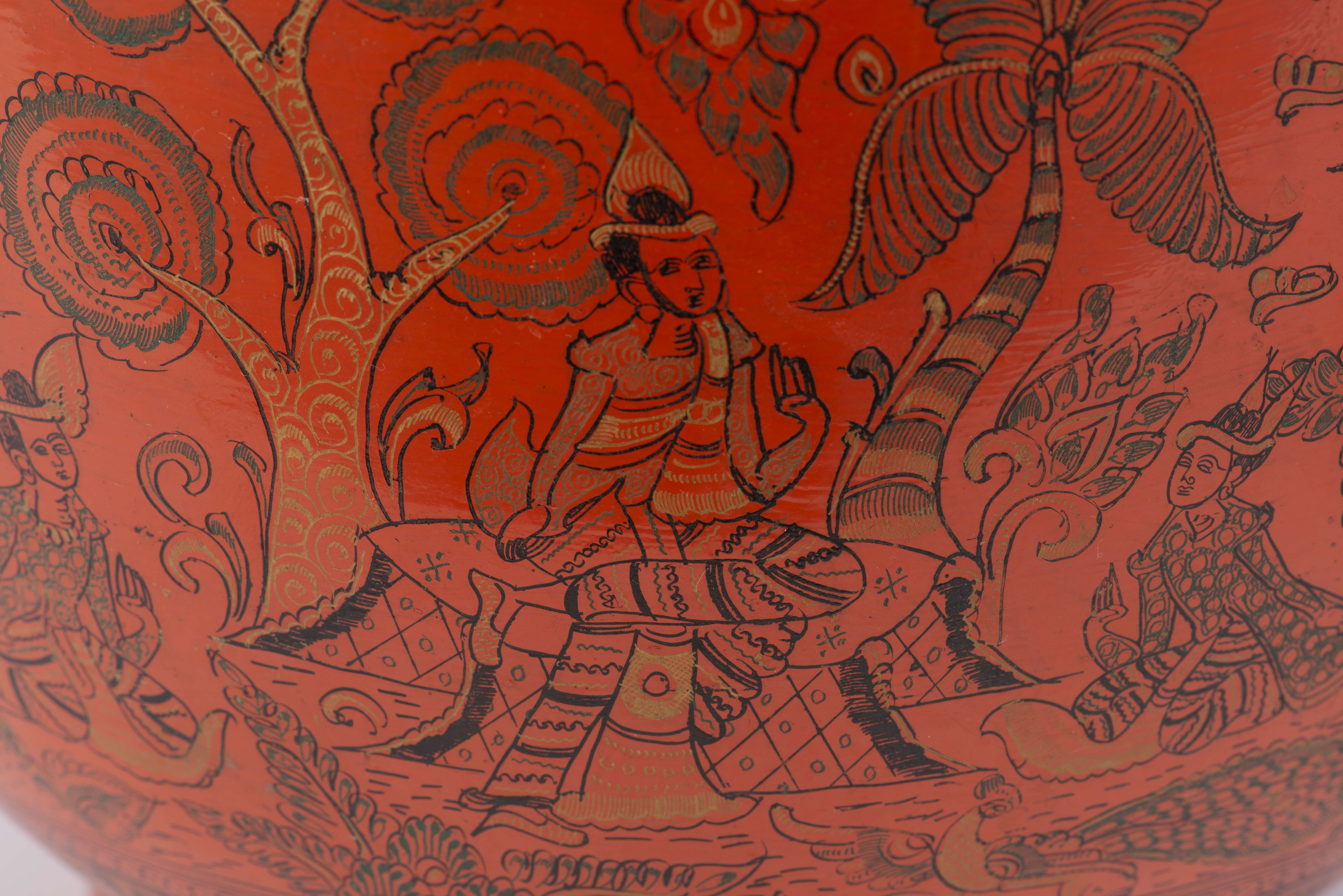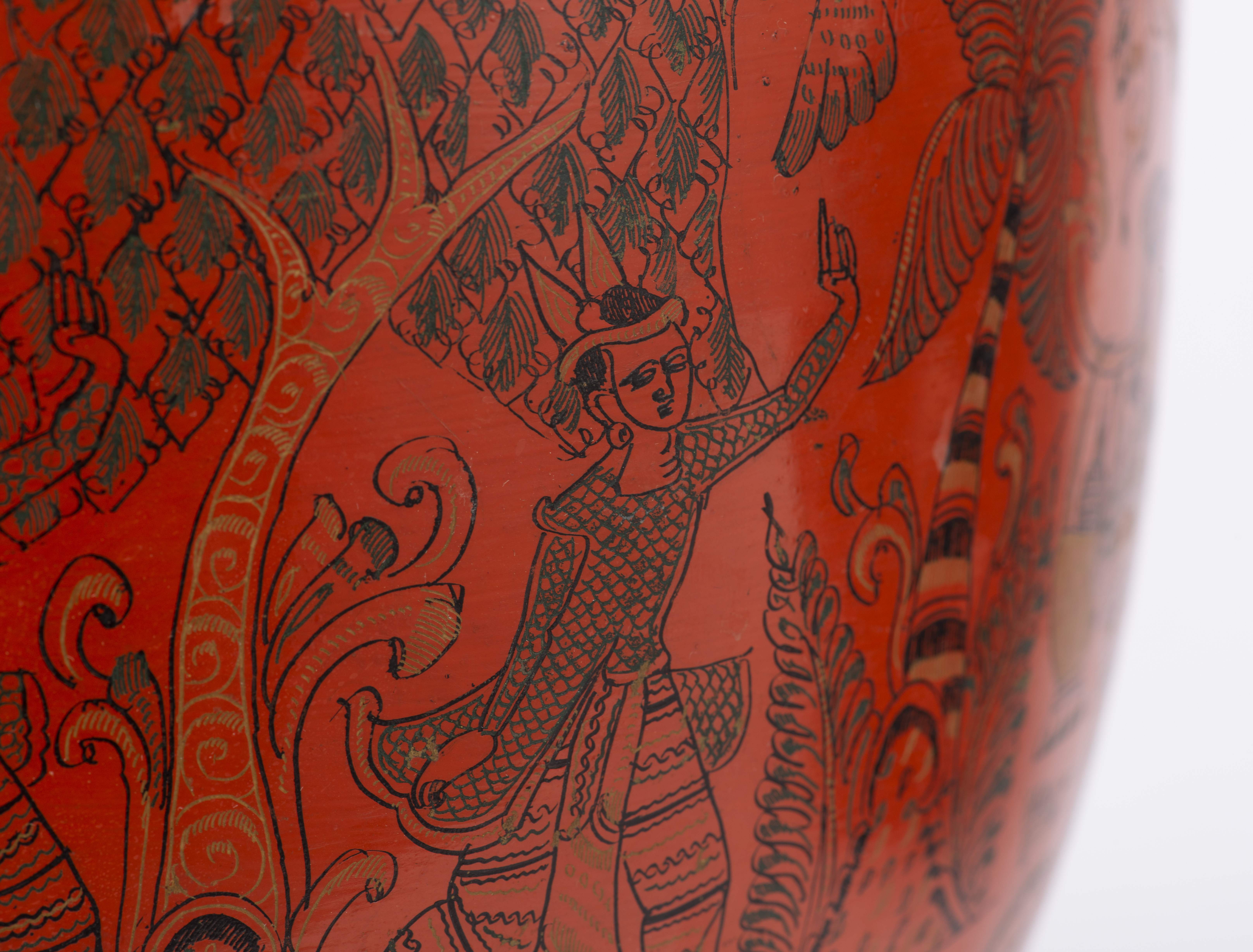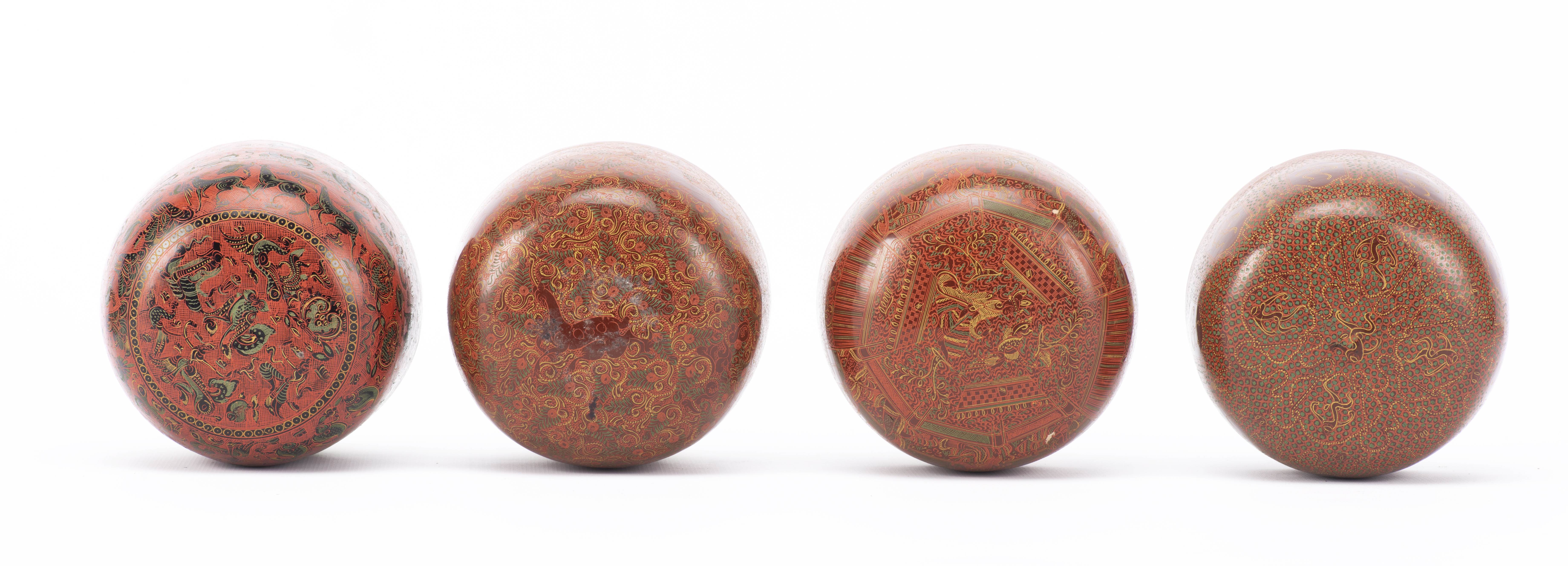 - quatre bols souples en laque de Birmanie à décor de scènes de personnages et animaux en jaune, vert, rouge et noir sur champ orange.