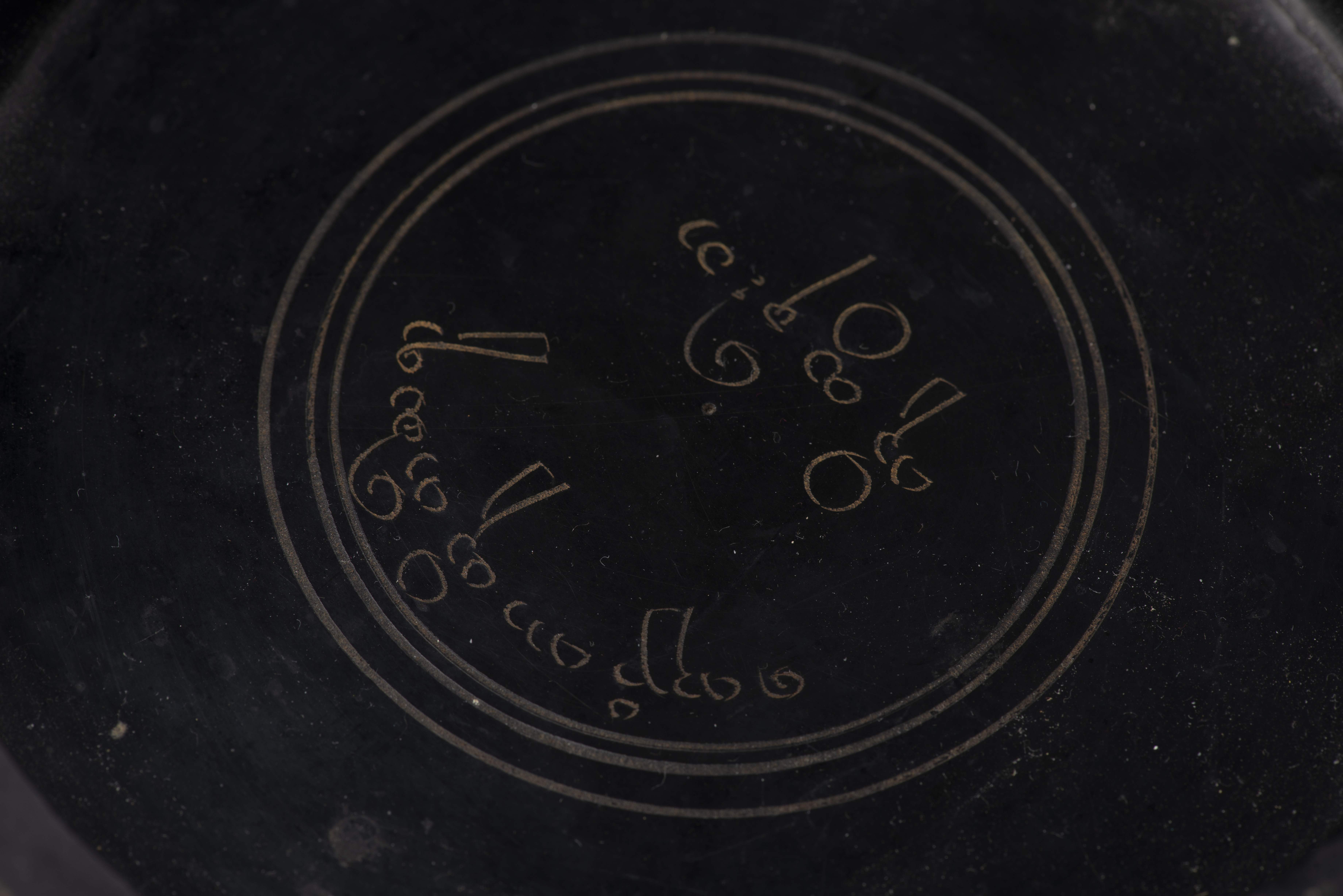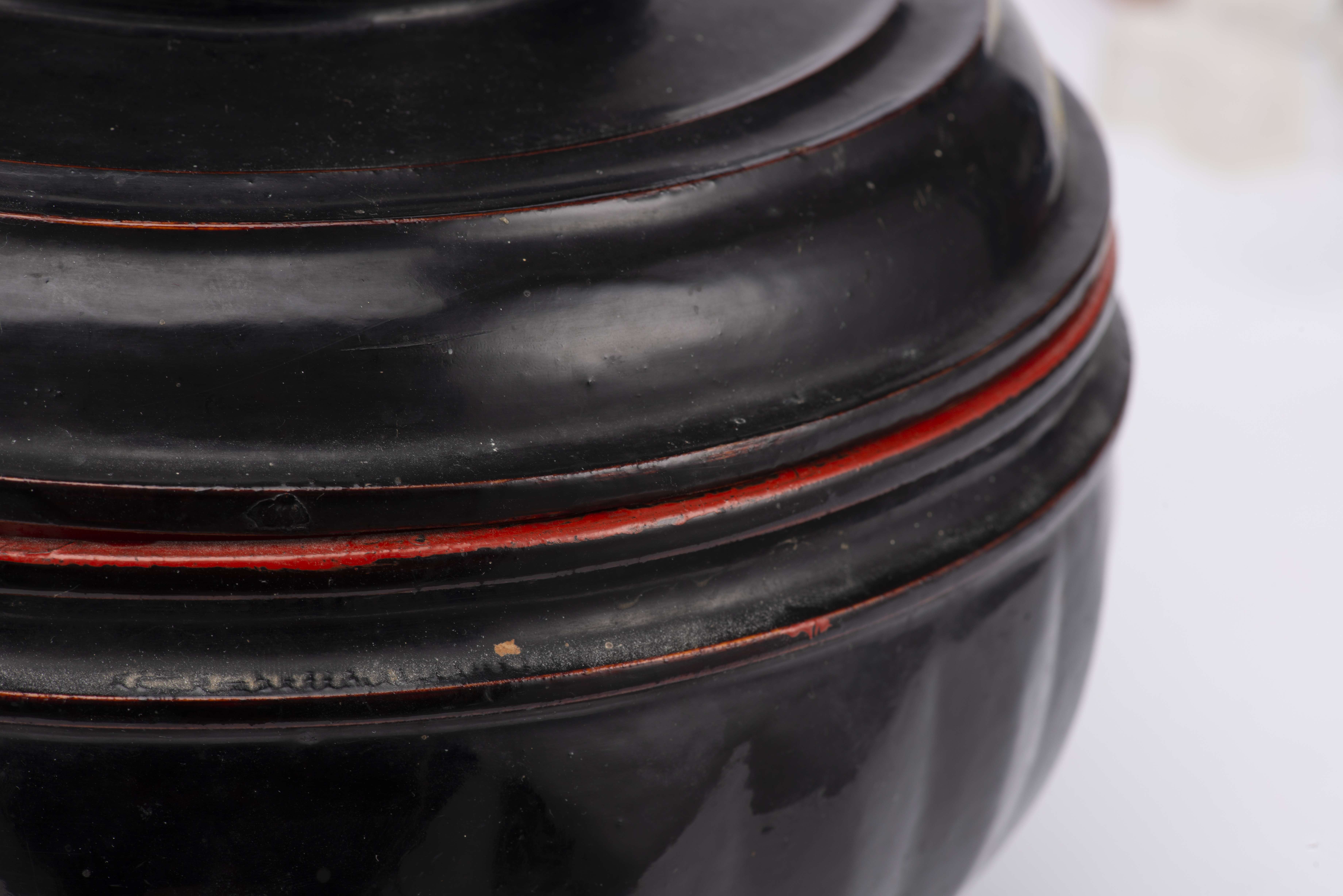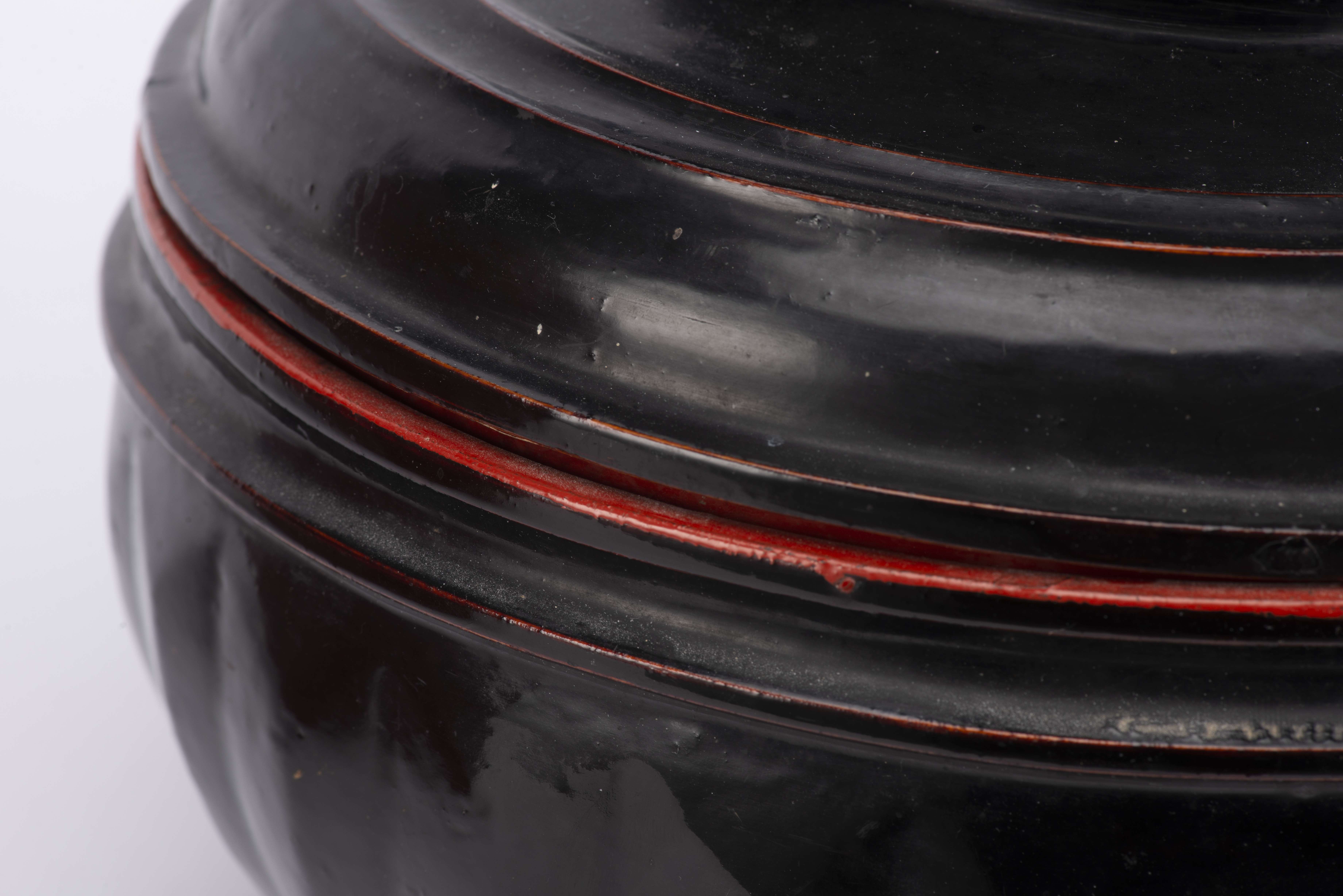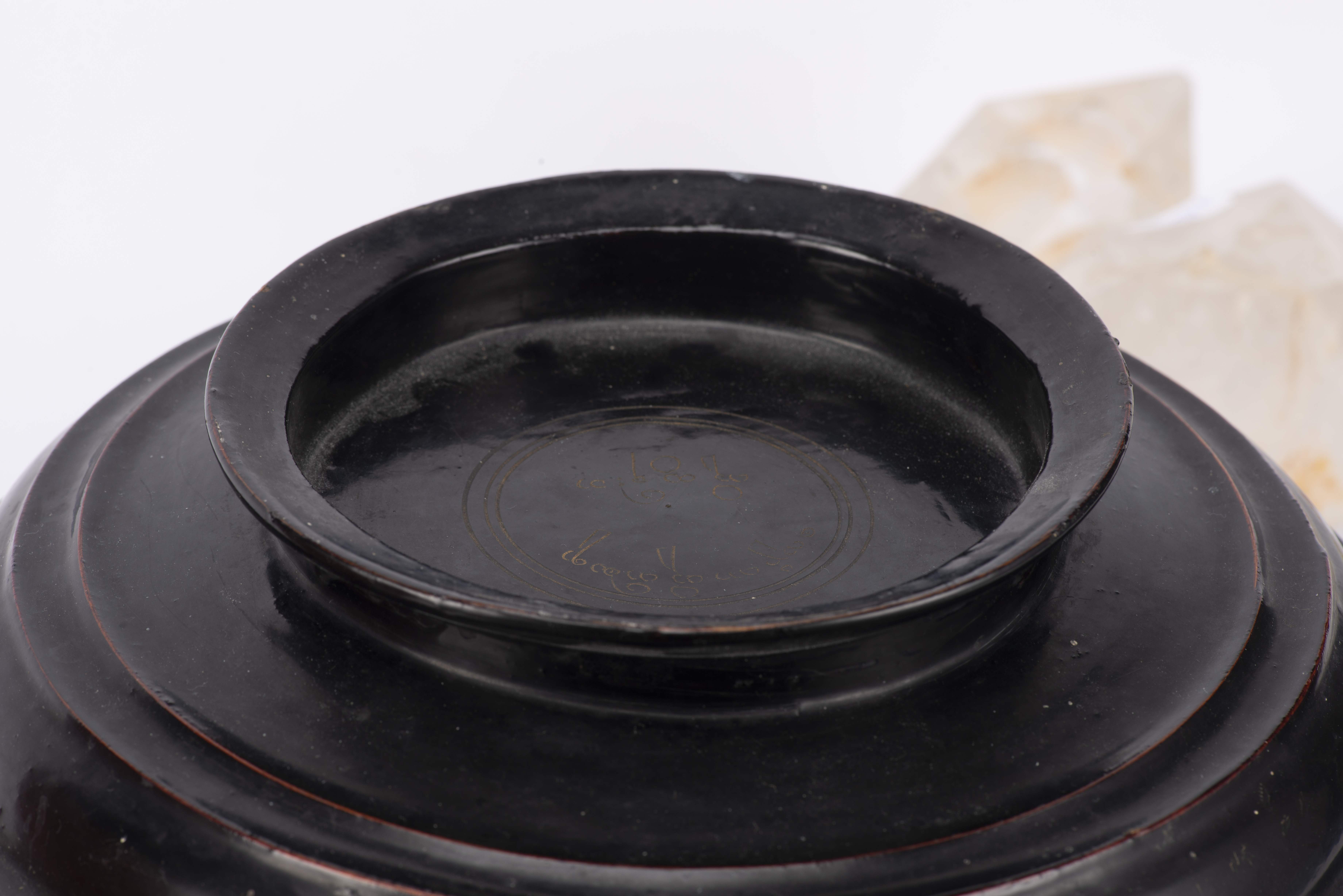 - grand bol noir à couvercle à cannelures en forme de pétales, intérieur rouge orangé, signé au centre sous la base et au centre du couvercle.