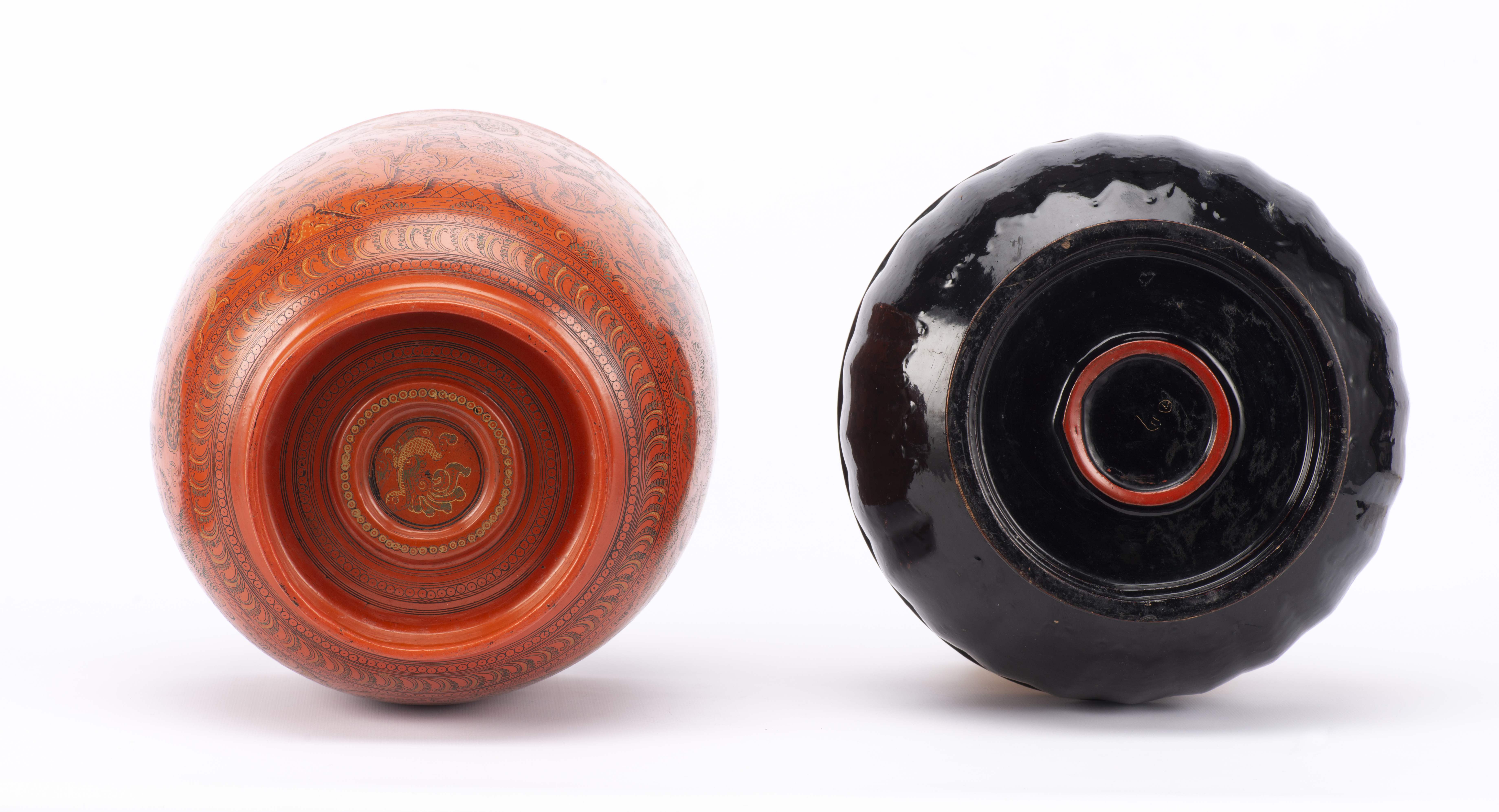 - deux boîtes cylindriques à 1 compartiment intérieur et laque jaune et orange sur l'extérieur à décor de nuages.