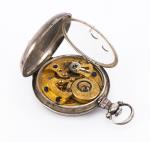 BOVET FLEURIER Montre de poche pour le Marché chinois, signé Bovet Fleurier , 1849-1900. Environ Ø 47mm, mouvement gravé et doré, cache-poussière avec motif rayonnant, cadran signé en chinois Bovet "Poway" 破有 sur le cadran blanc et chiffres romains noirs, avec bouton pressoir d'ouverture du couvercle arrière sur l'ardillon, grandes aiguille des secondes centrale et aiguilles en acier bleuï.