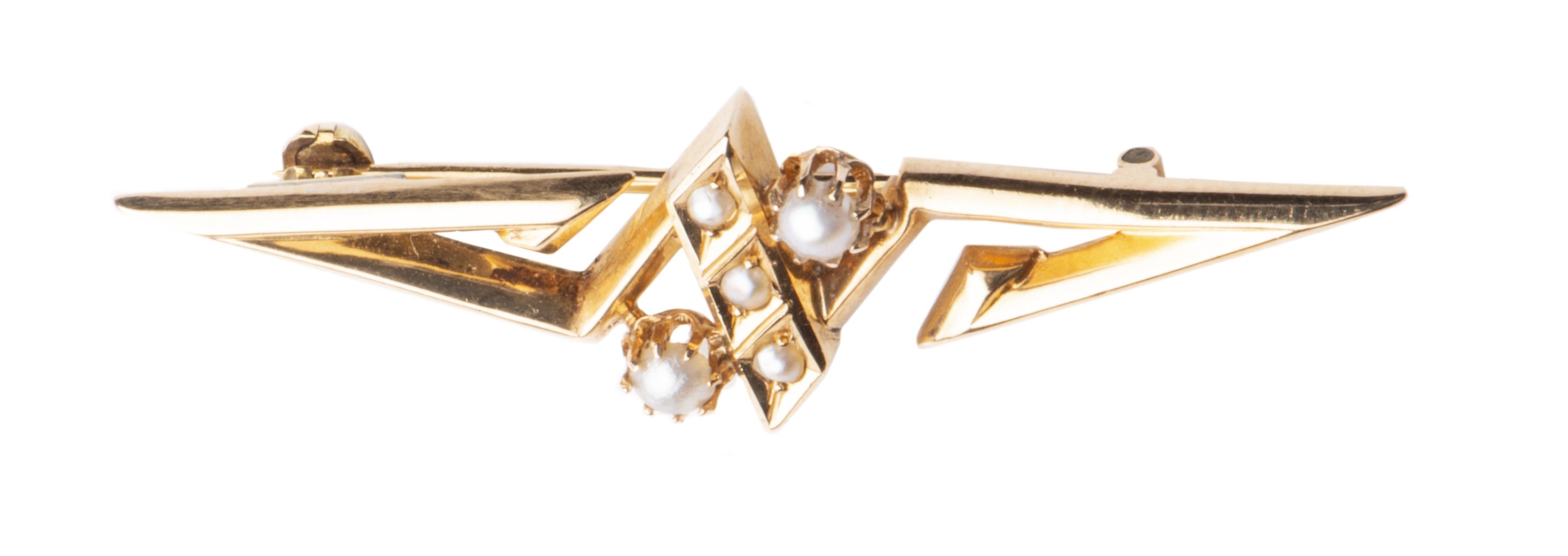 Broche en or jaune .750 en doubles pointes triangulaires et 5 perles
