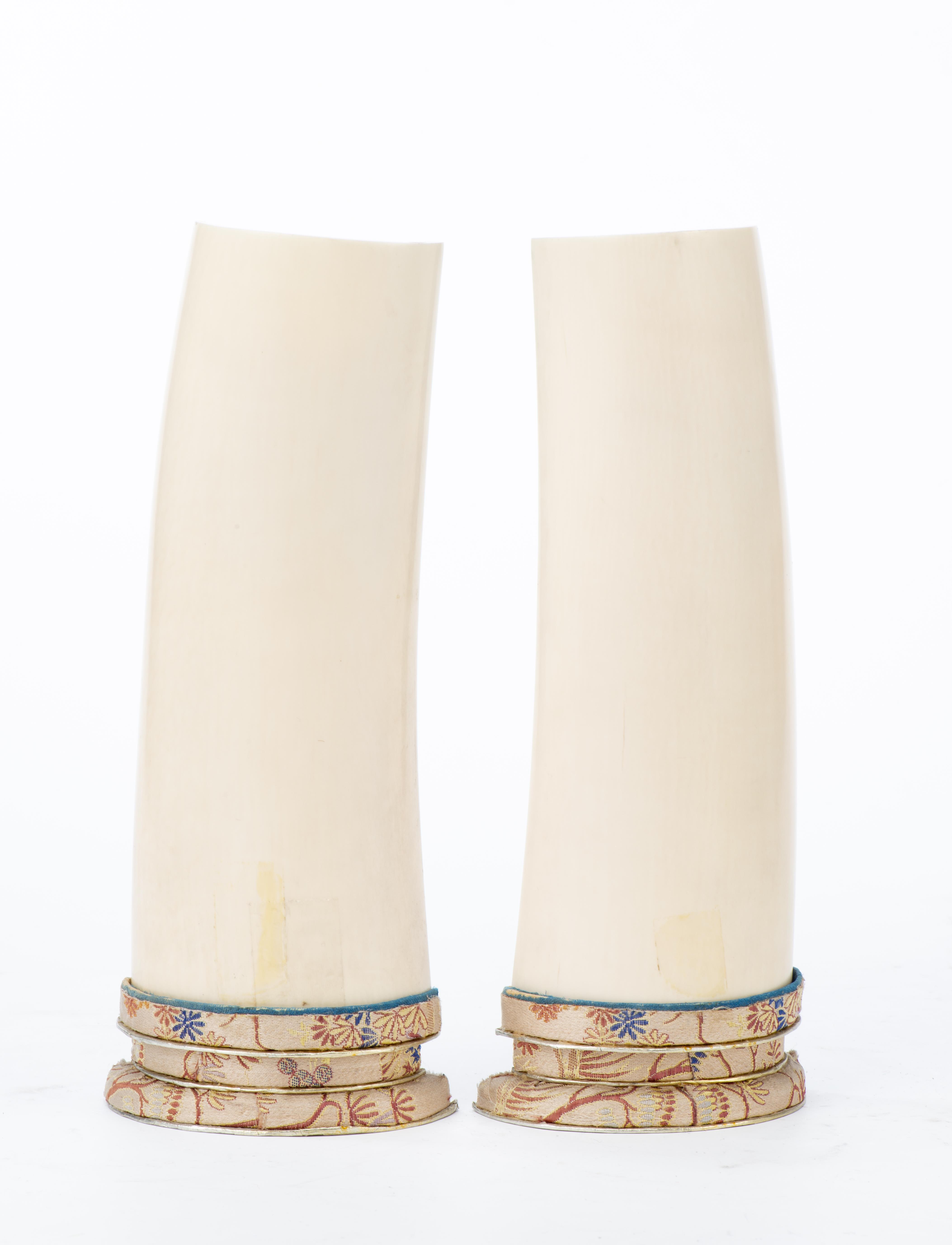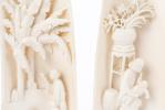 Deux sculptures en ivoire de Chine de parties de 2 demi-défenses en ivoire sculpté représentant des scènes de la la vie quotidienne d'une mère tenant son enfant dans les bras devant un pot de fleurs et d'une mère avec son enfant marchant dans un jardin devant des bananiers.