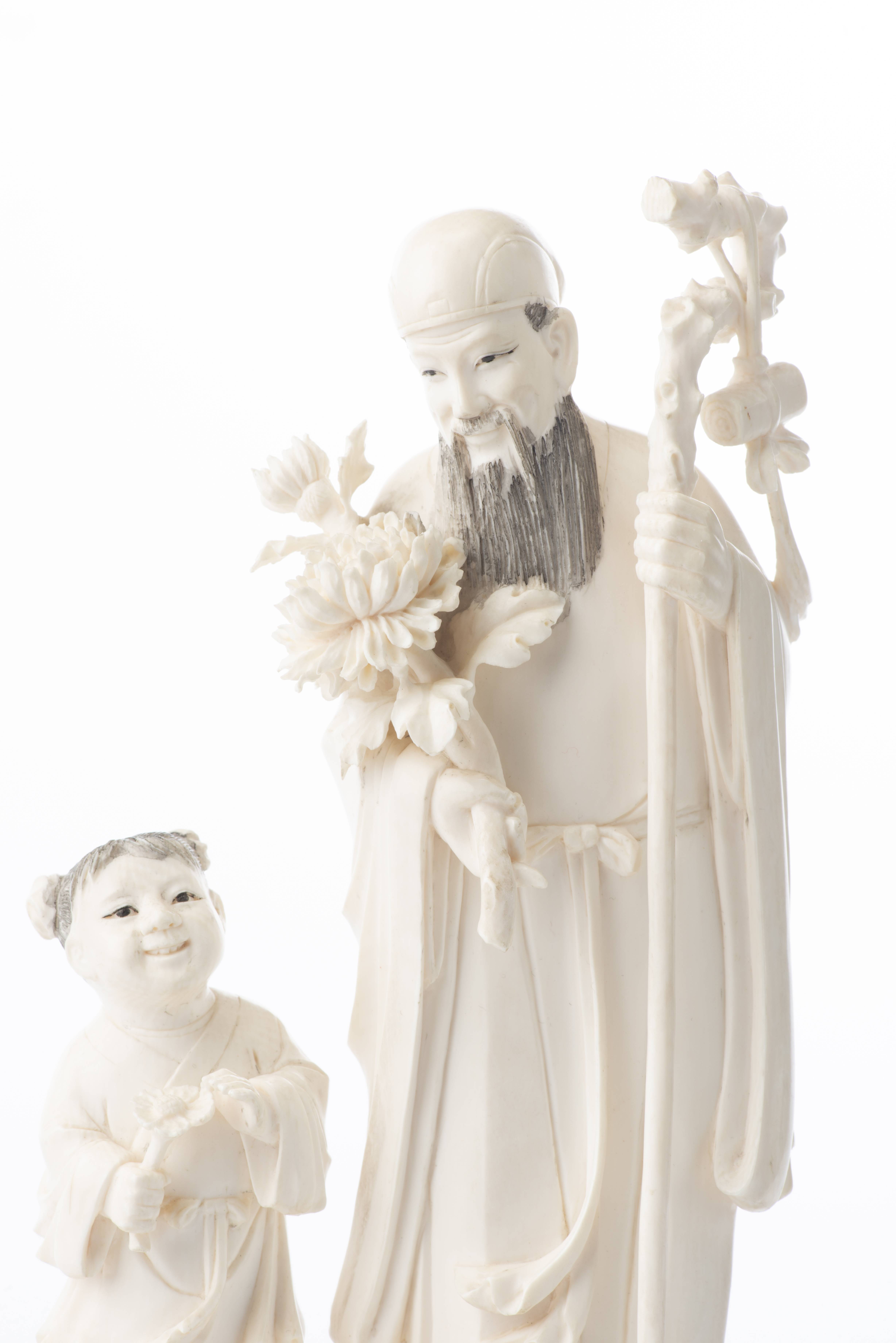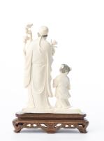 CHINE XXe, Sculpture en ivoire représentant un homme et un enfant sur son socle en bois.