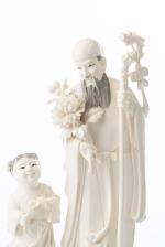 CHINE XXe, Sculpture en ivoire représentant un homme et un enfant sur son socle en bois