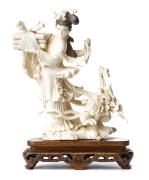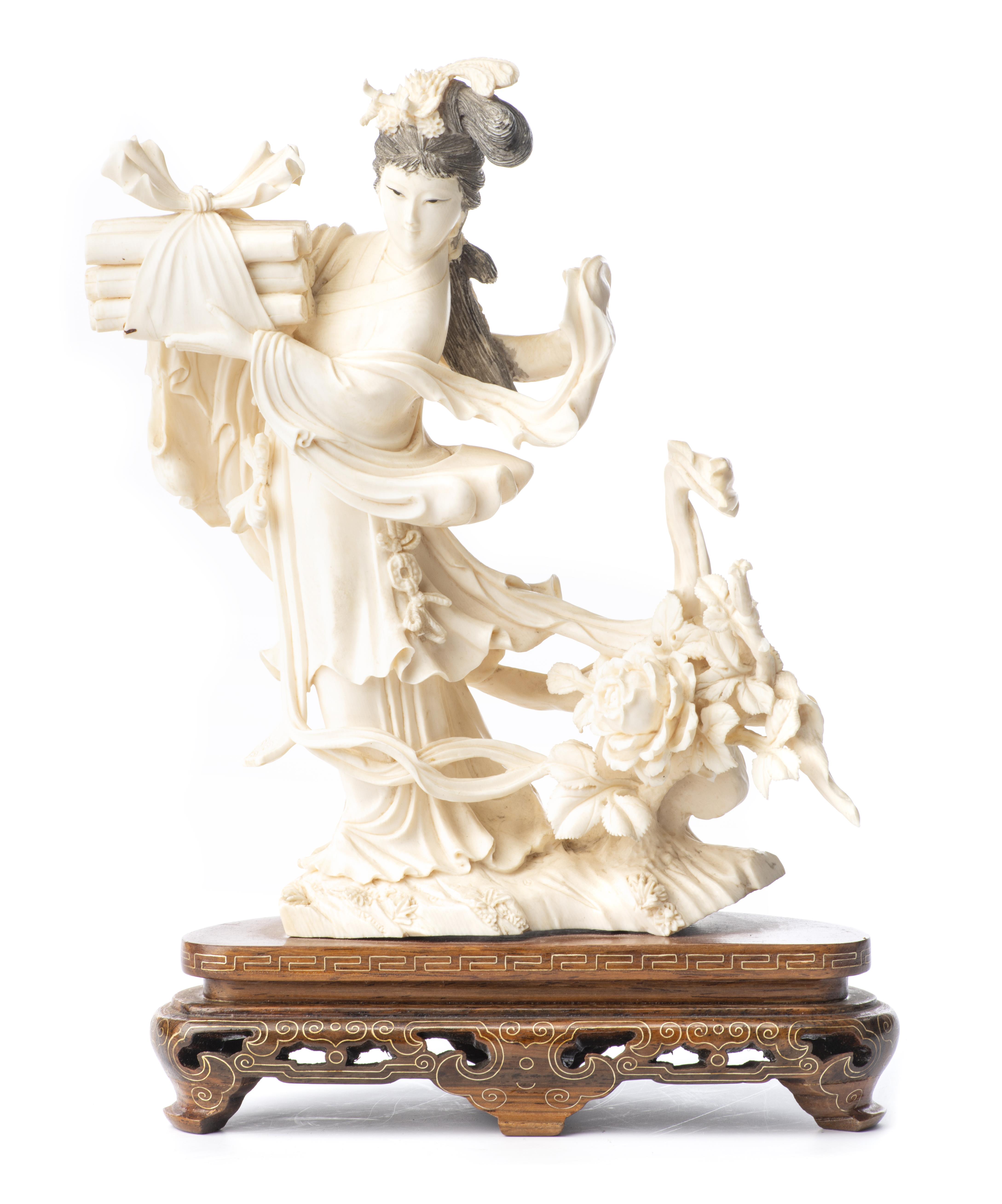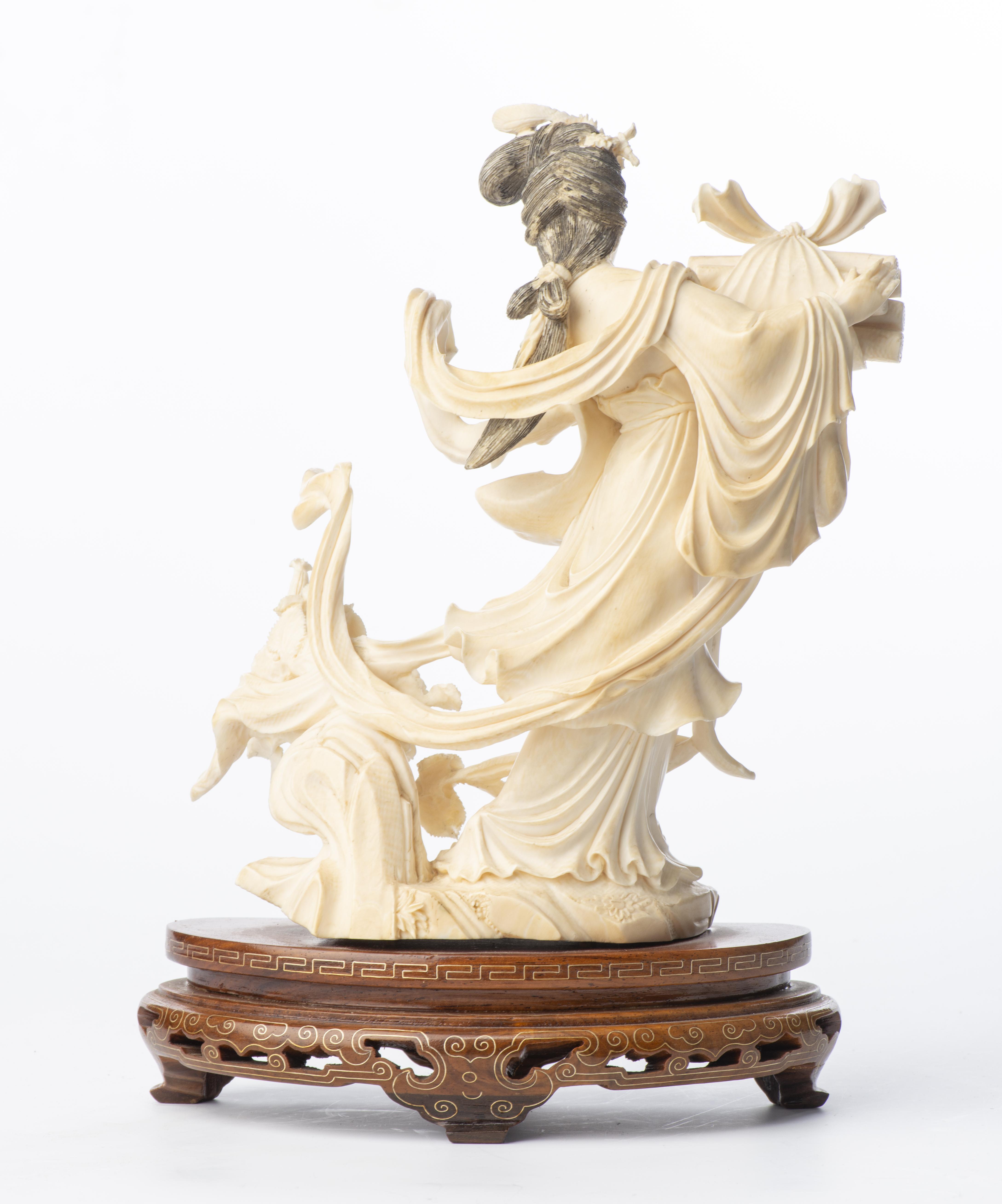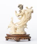CHINE XXe, Sculpture en ivoire représentant une femme en costume traditionnel sur son socle en bois