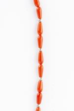 Collier en perles argentées et perles de corail ovale, pendant en corail sculpté figurant deux poissons