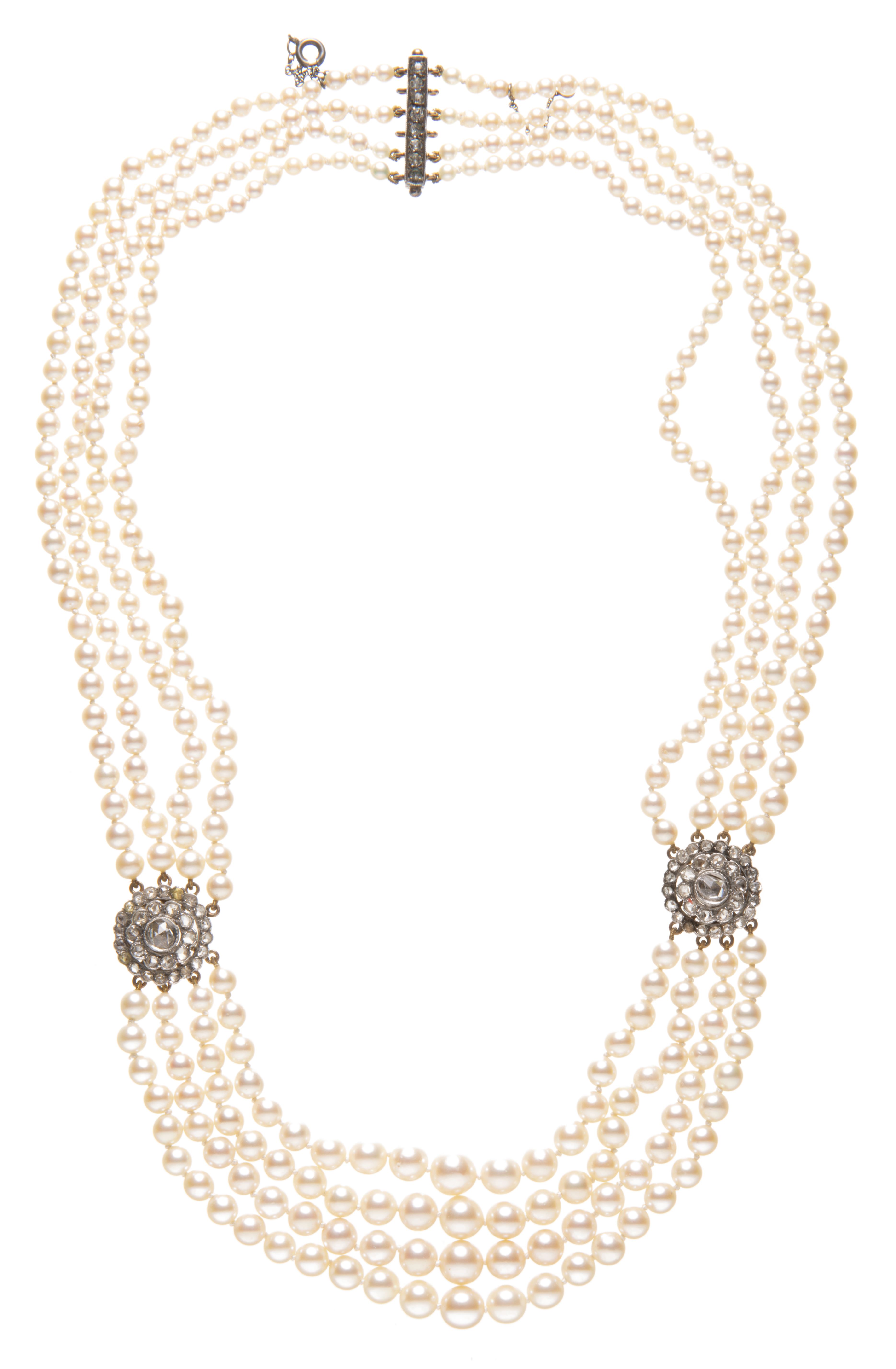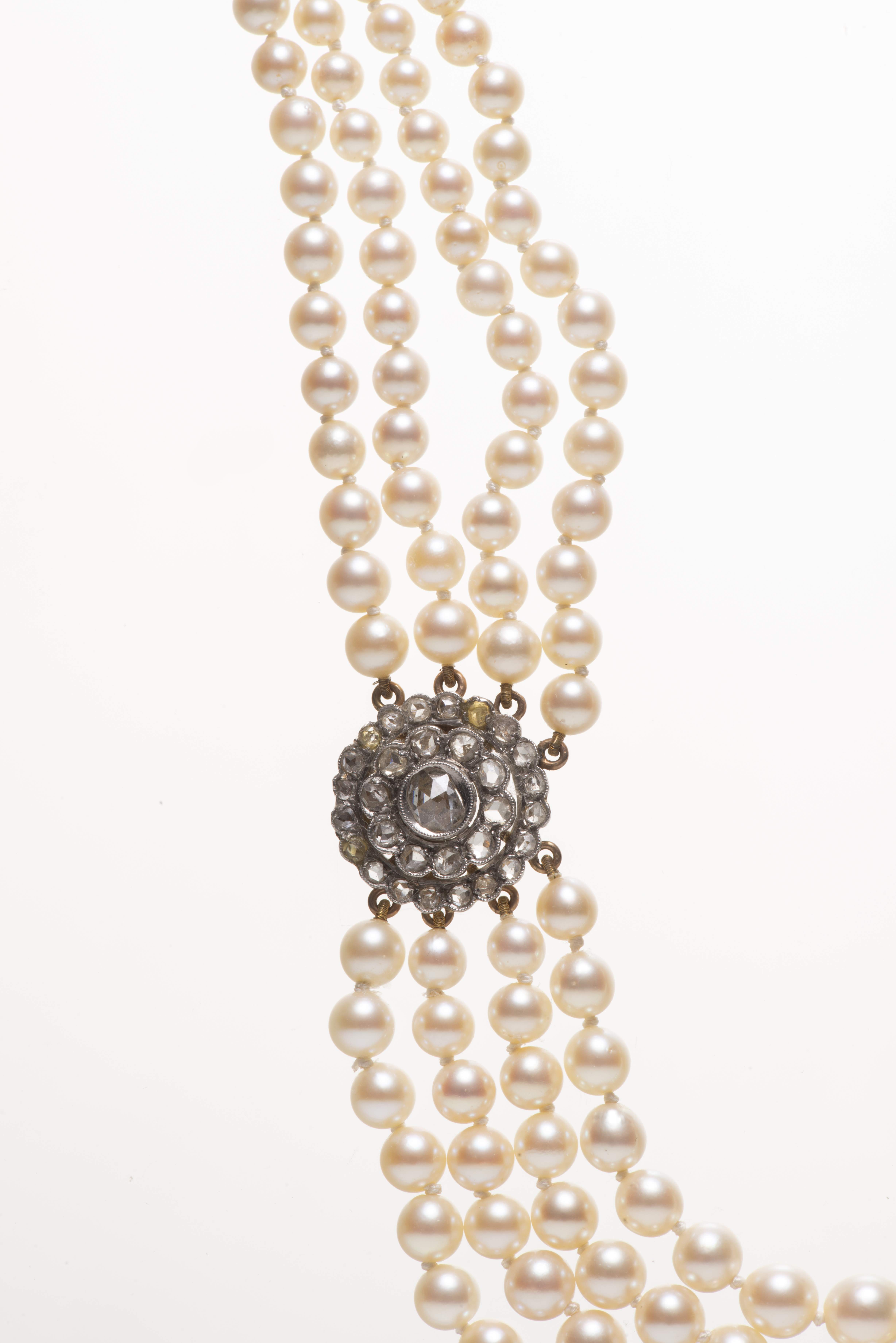 Collier à quatre rangs de perles de culture de 0.3 à 0.6 cm de diamètre, avec fermoir à 8 diamants de taille brillant sertis à griffes, de part et d'autre 1 clip rond avec diamants de taille rose sur or jaune et blanc .750.