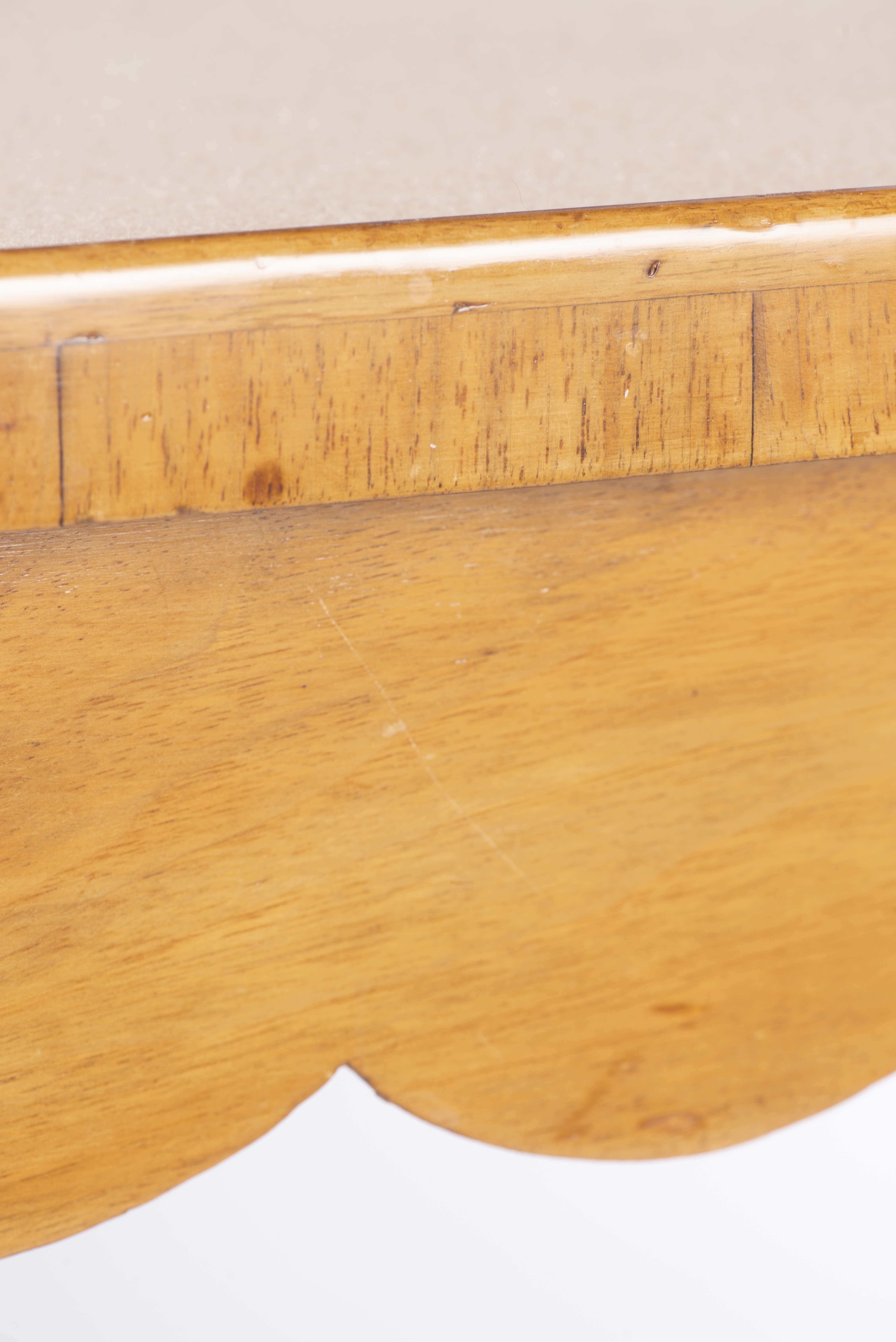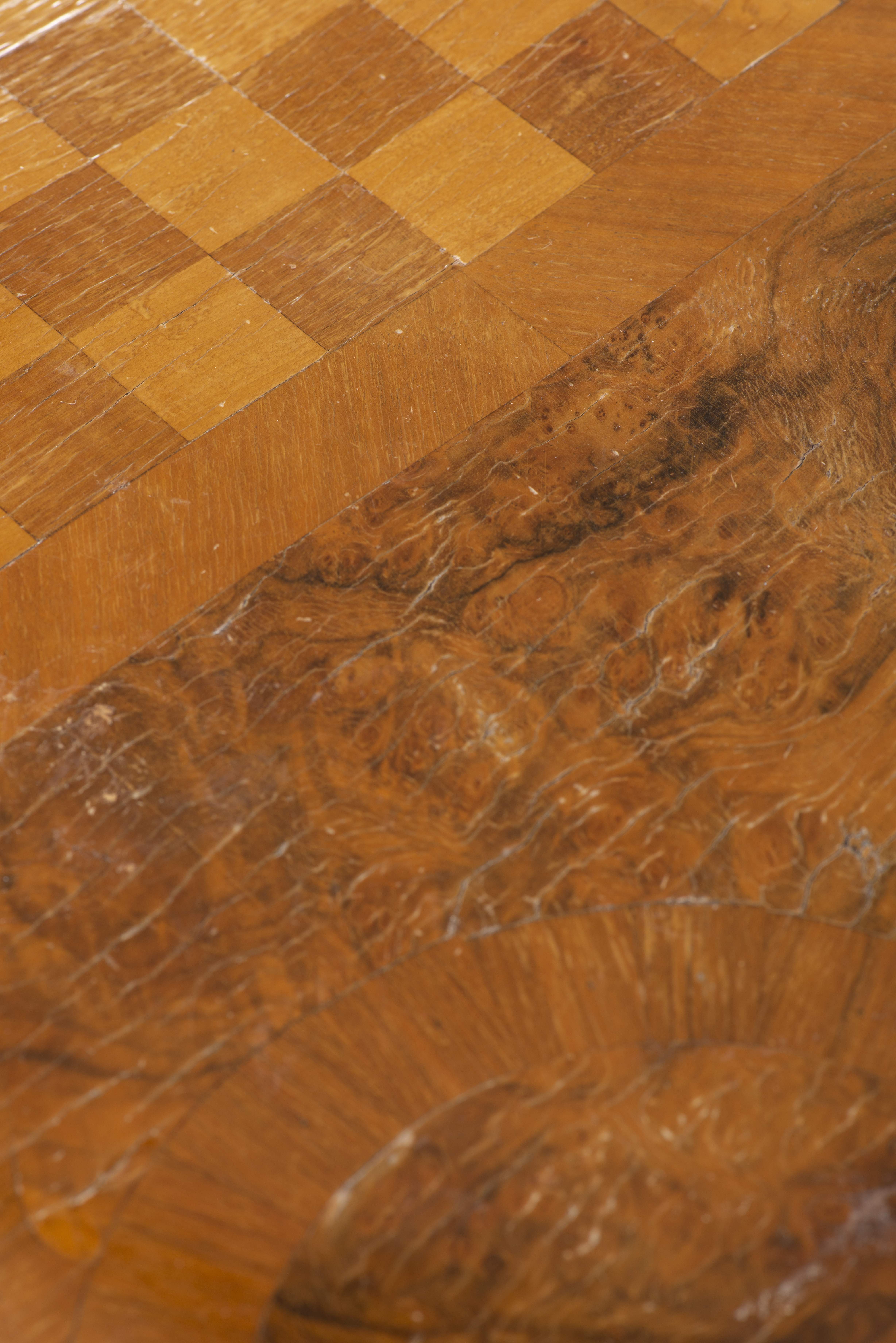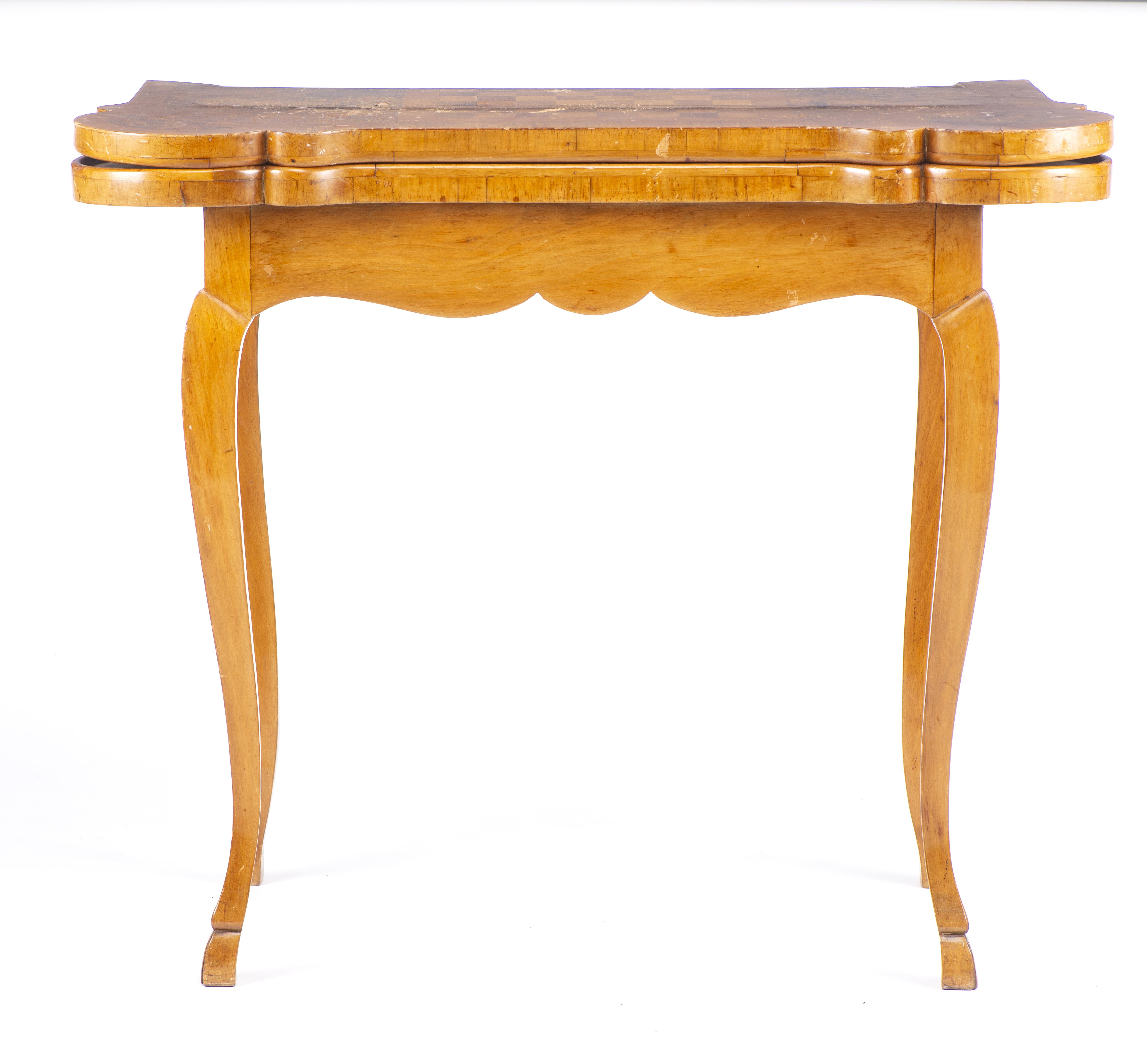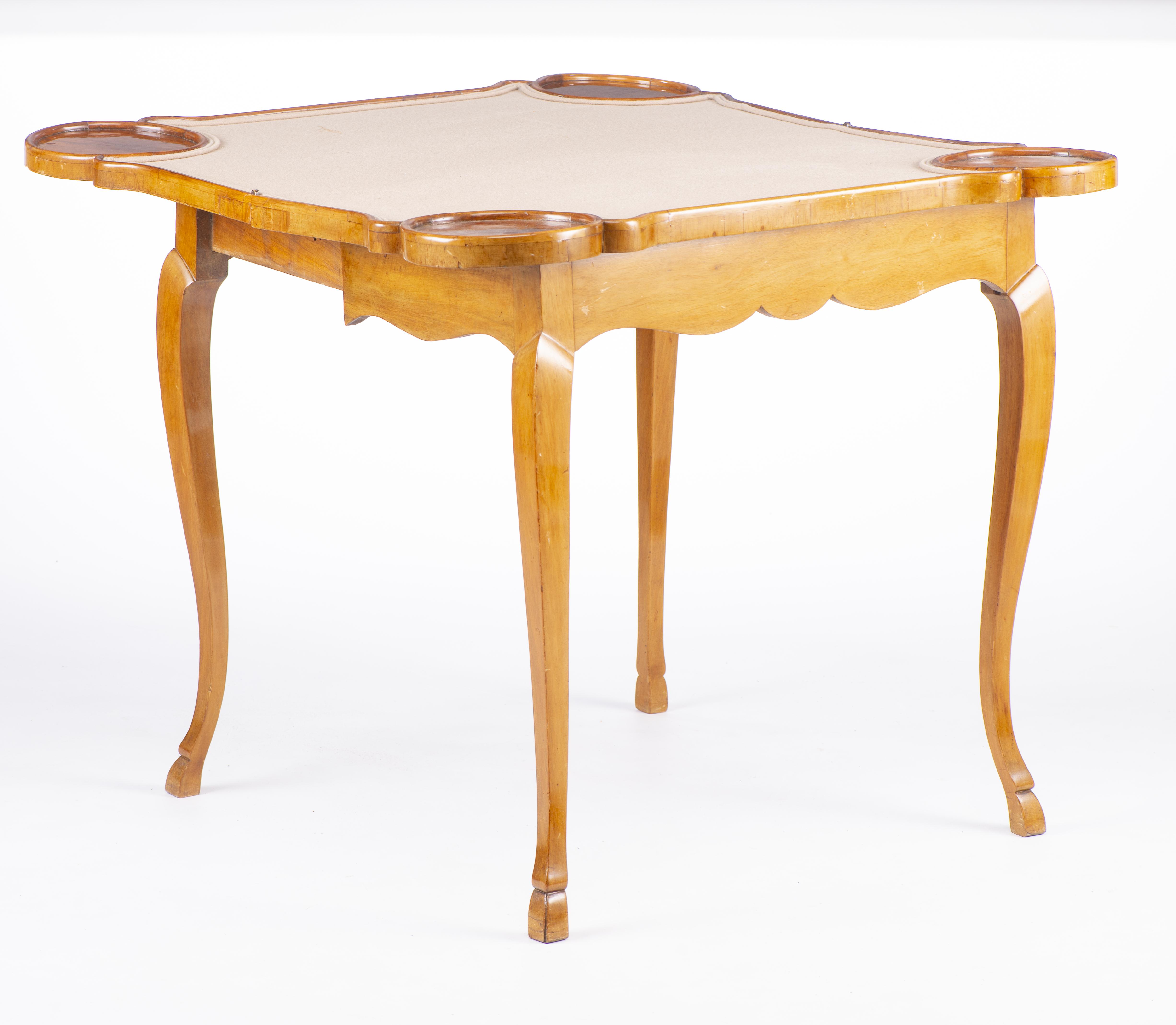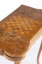 Console - table de bridge baroque bernoise sur pieds sabots, à quatre coins en cercle, plateau à placage de ronce de noyer et bois de rose figurant un échiquier. Recouverte d'un velours de jeu beige une fois dépliée.