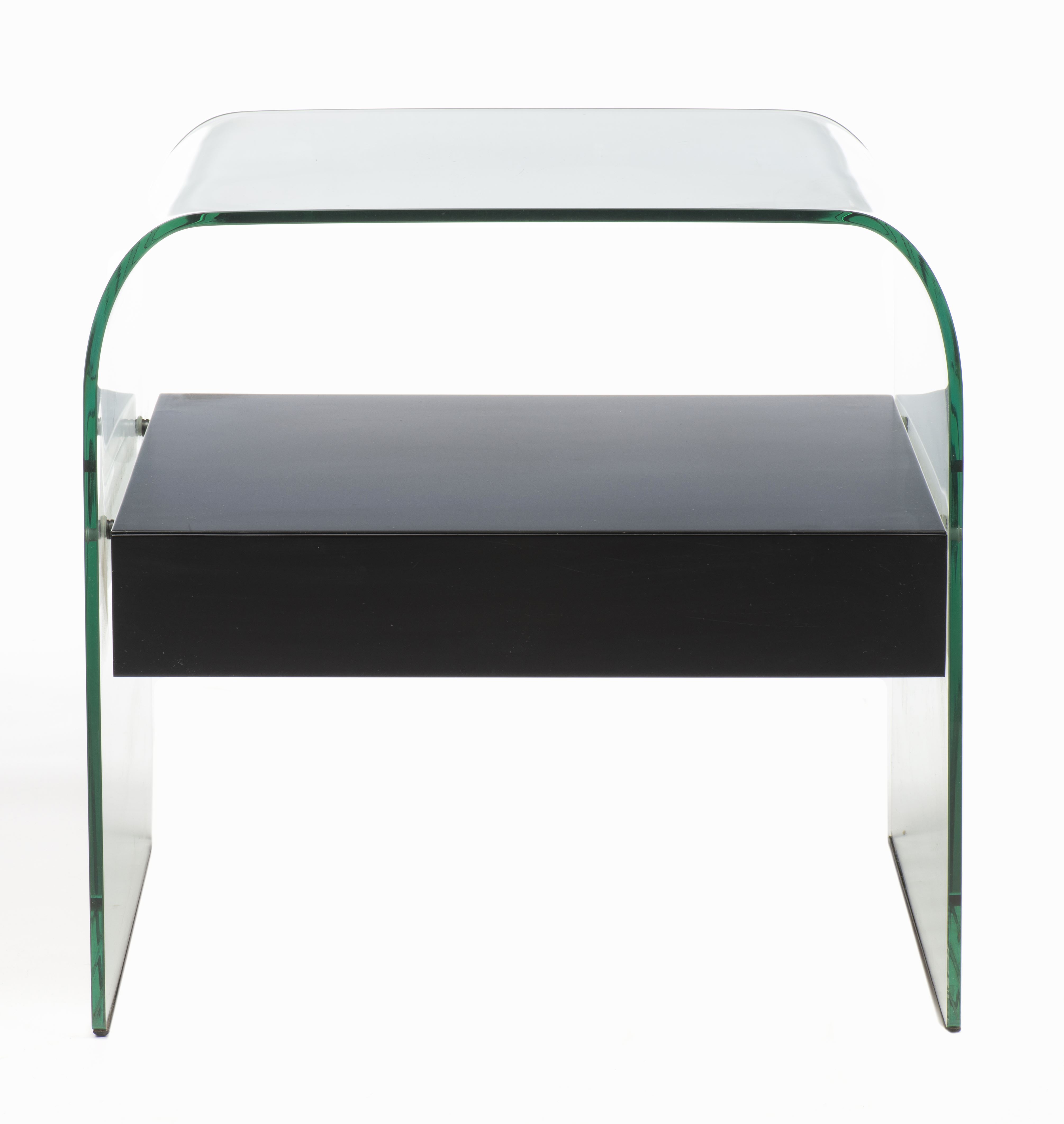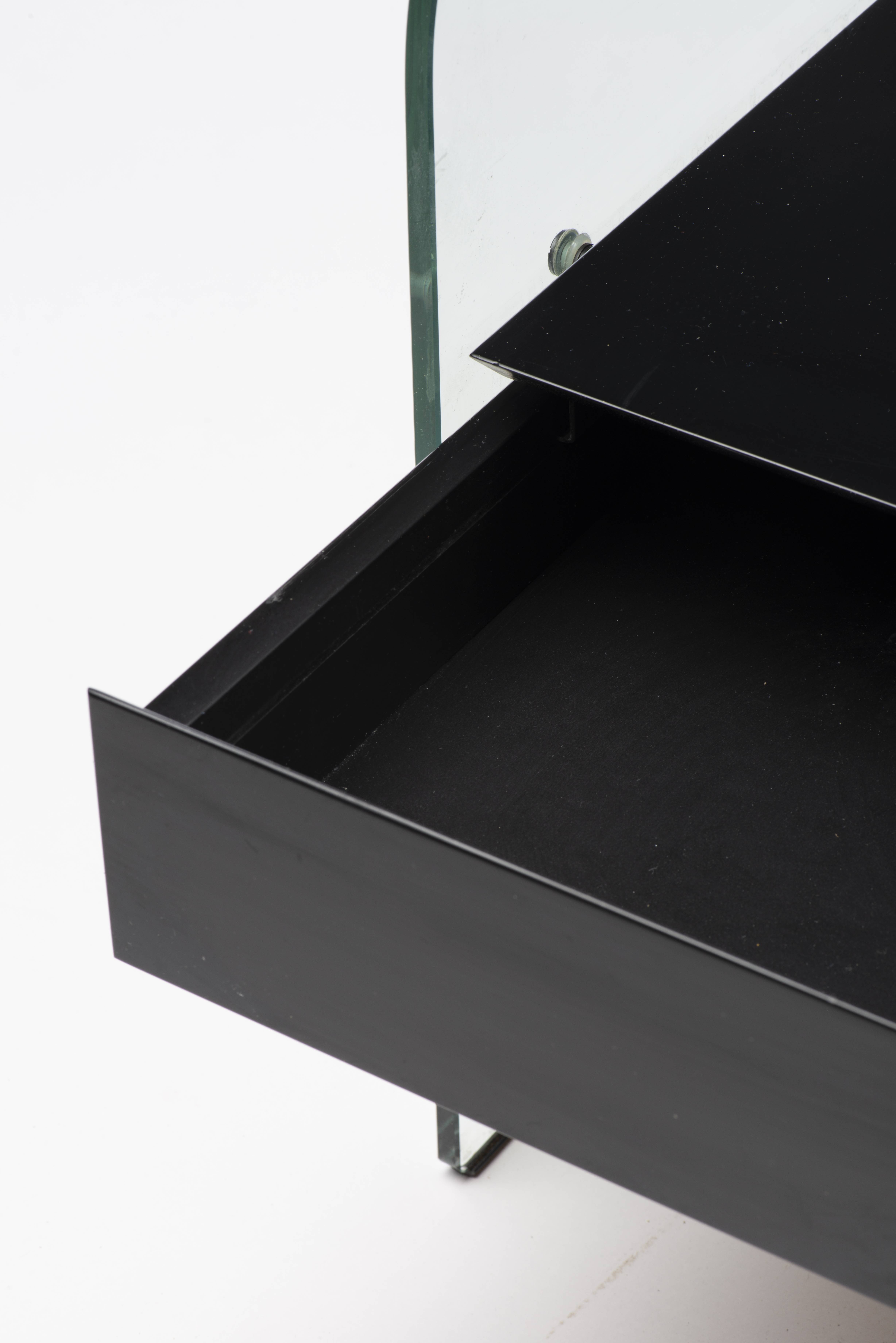 CRS FIAM Pesaro Italy, chevet en verre ceintré en U inversé "Rialto night" transparent de 8 mm avec un tiroir en bois laqué noir 95.
