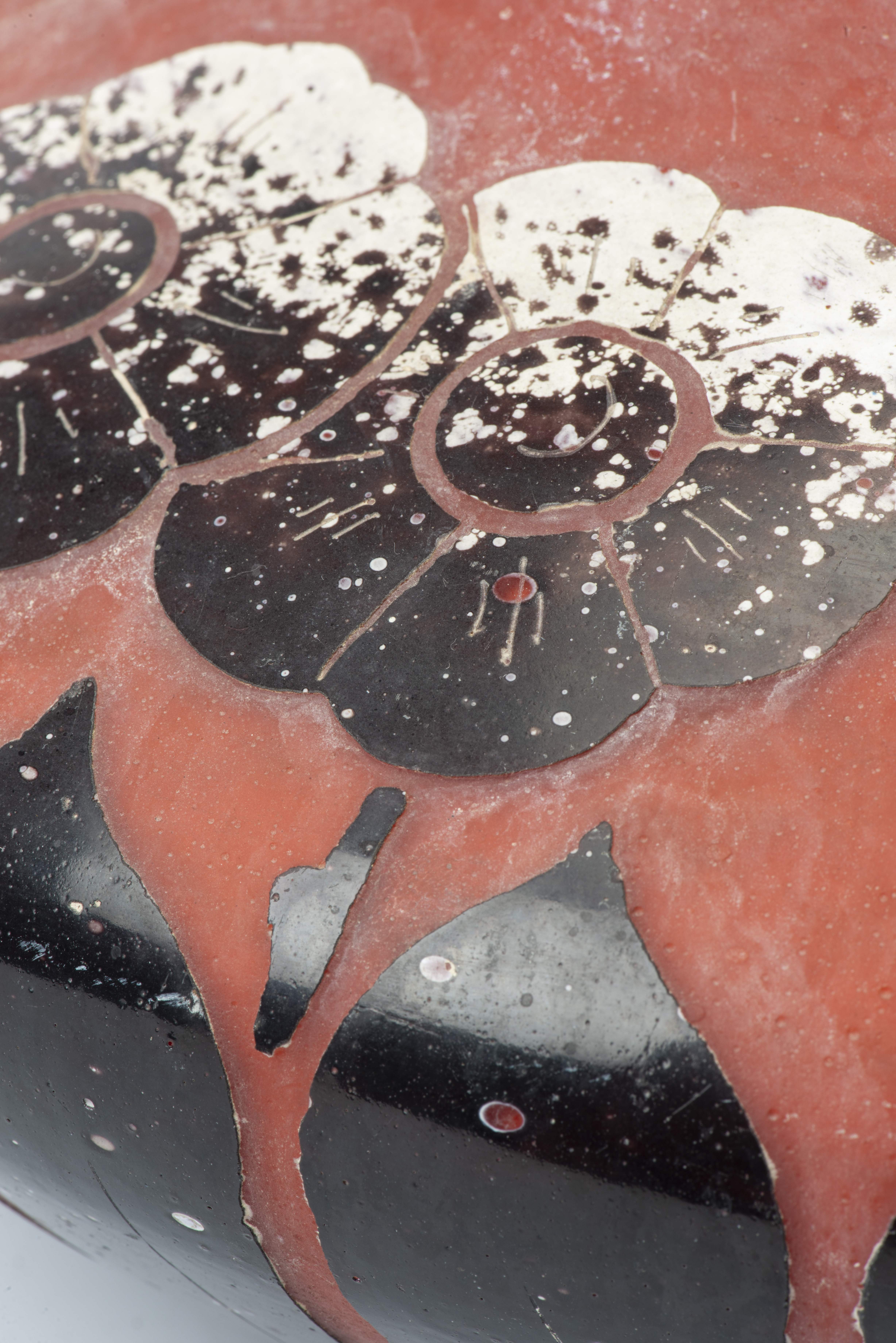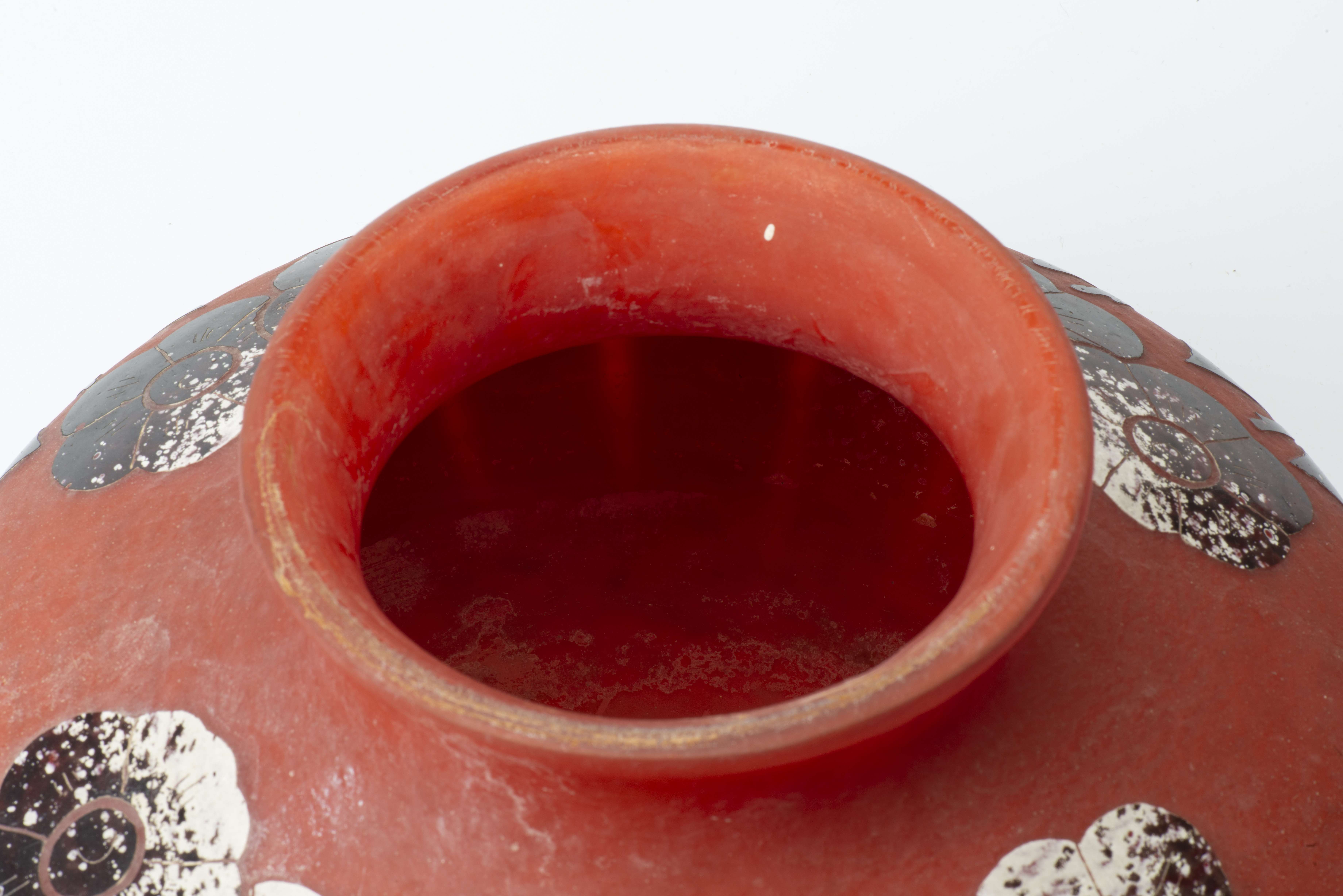 DEGUE, Vase en verre multicouche rouge-orangé, gravé à l'acide d'un décor de fleurs et pétales de couleur grenat stylisé Art Déco, signé "Degué" à la base.
