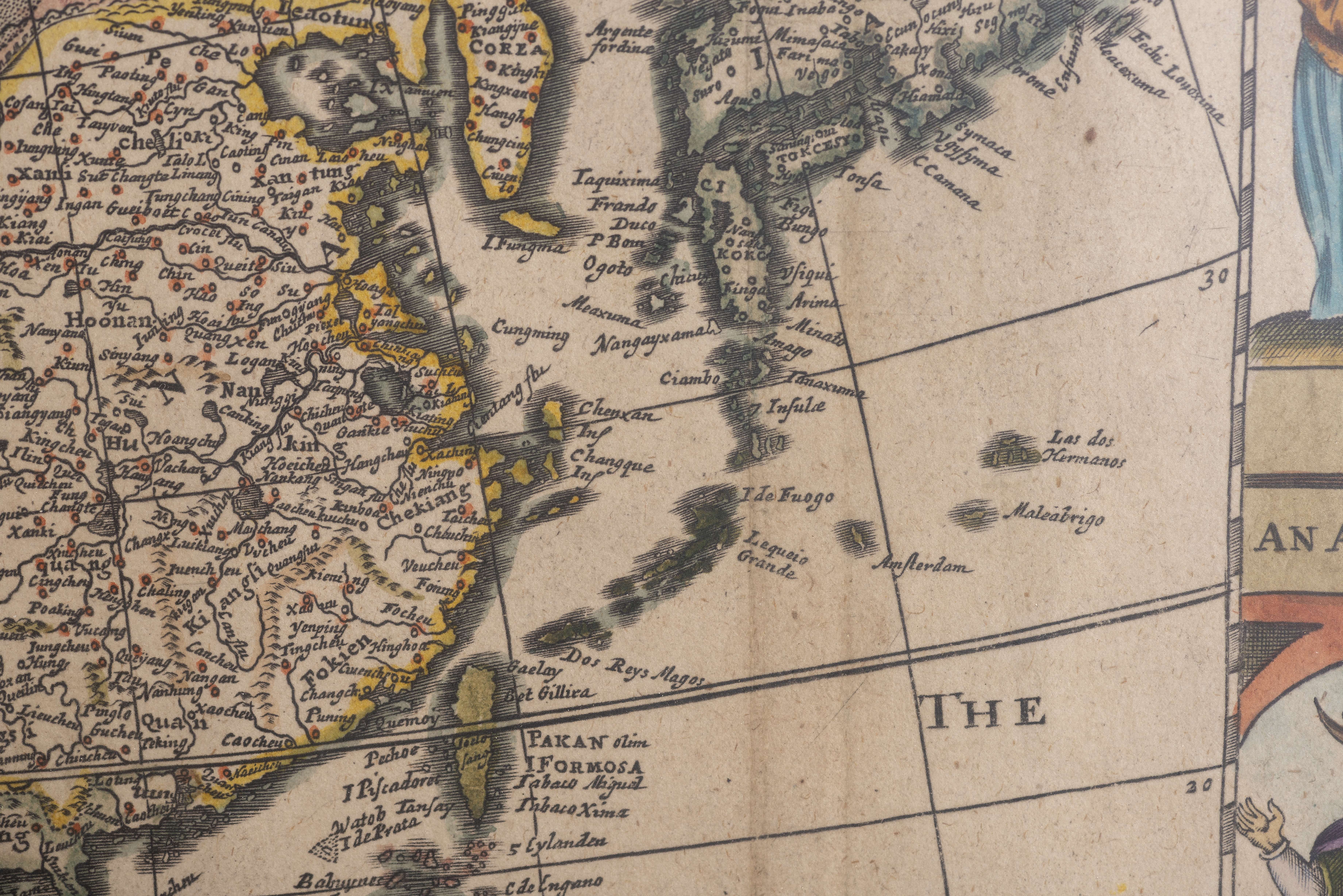 A new Plaine and exact map of Asia discribed by Ni Visscher and rendered into English with the habits of the Countries and Manner of the Cheife Citties, printed colloured and fould by John Overton at the White Horse. c.1700
