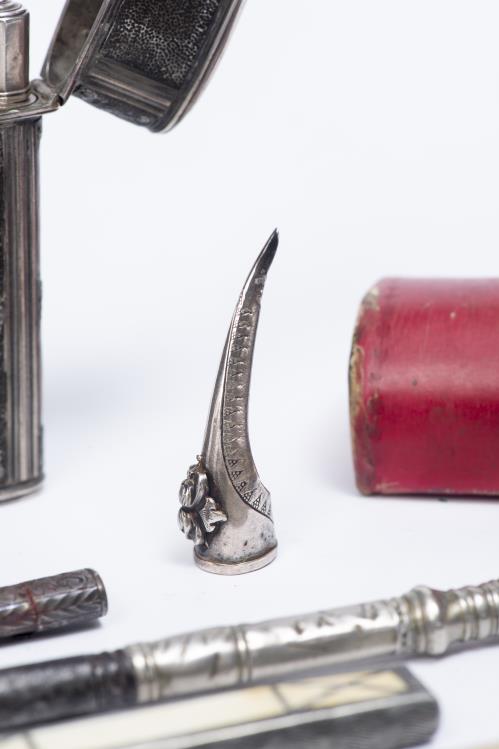 -nécessaire de voyage comprenant des couverts et divers outils dans un étui en métal argenté à décors floraux. H. 9x5 cm