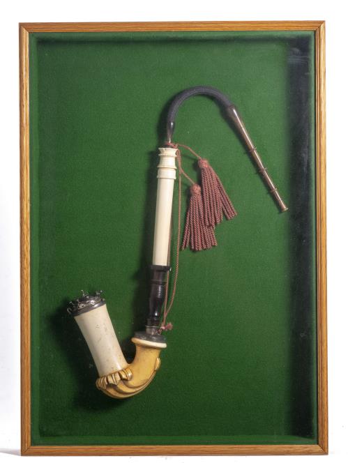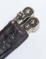-couverts (deux piques et un couteau) en métal argenté et corne dans un étui en cuir brun craquelé. L. 21.3 cm
