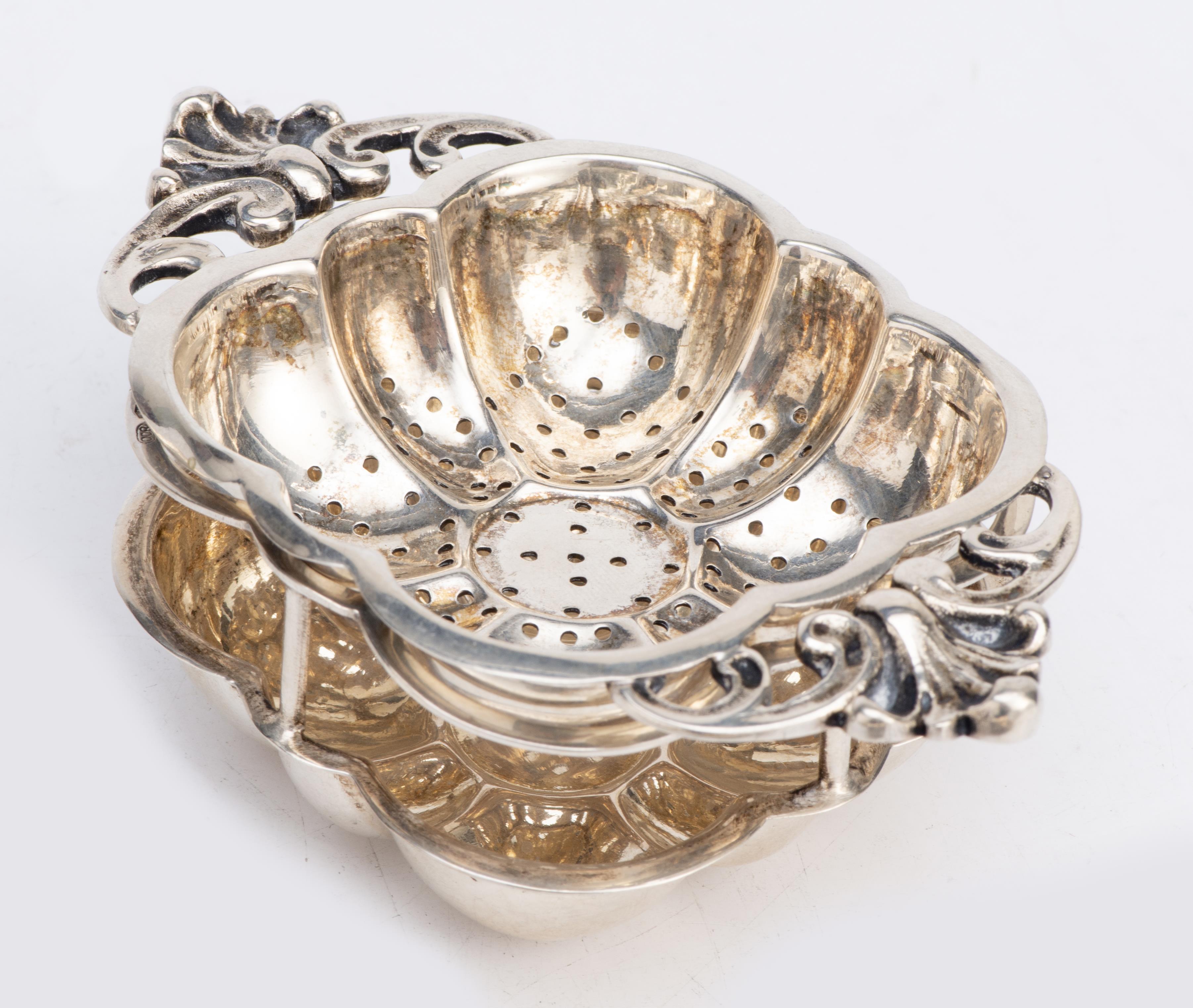Passe-thé polylobé en argent .800, prises à décor de feuille d'acanthe