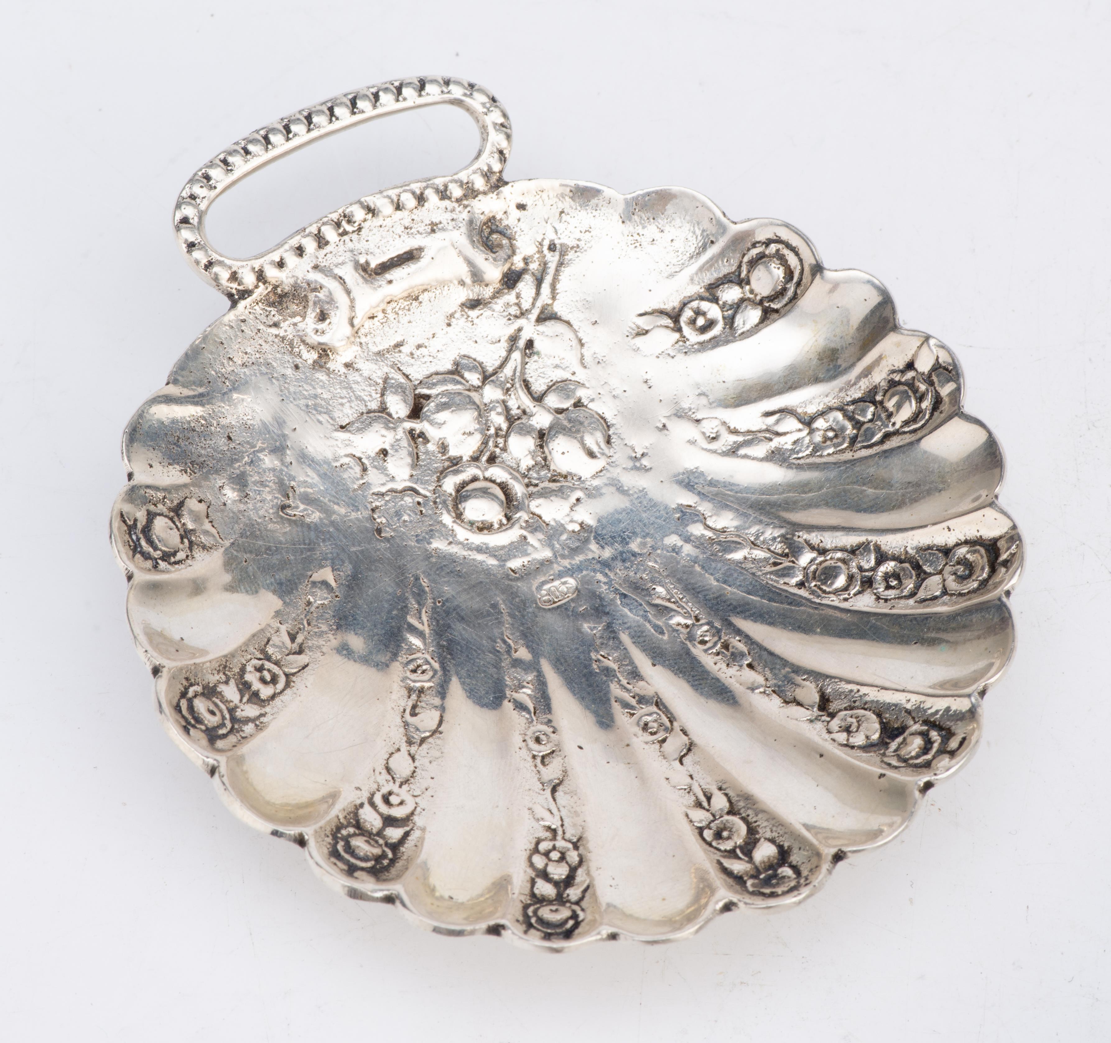 Ensemble de vide-poches en forme de coquillage et passe-thé en argent