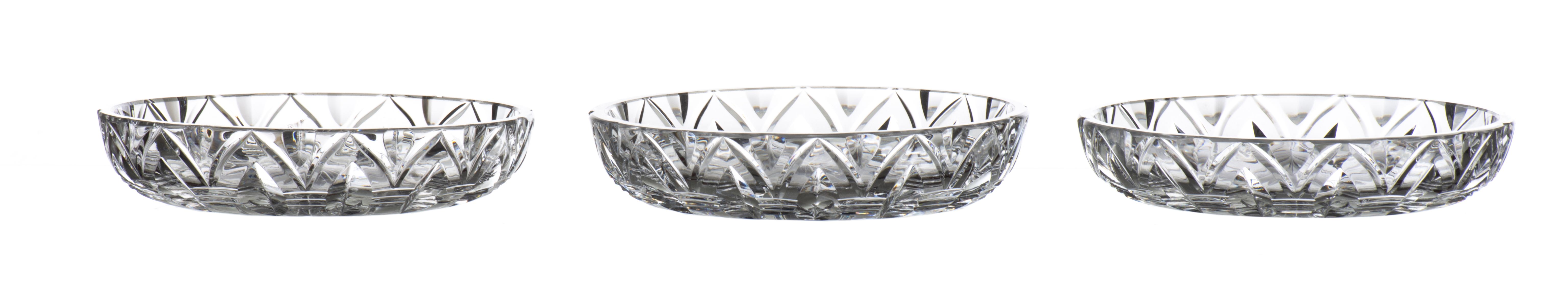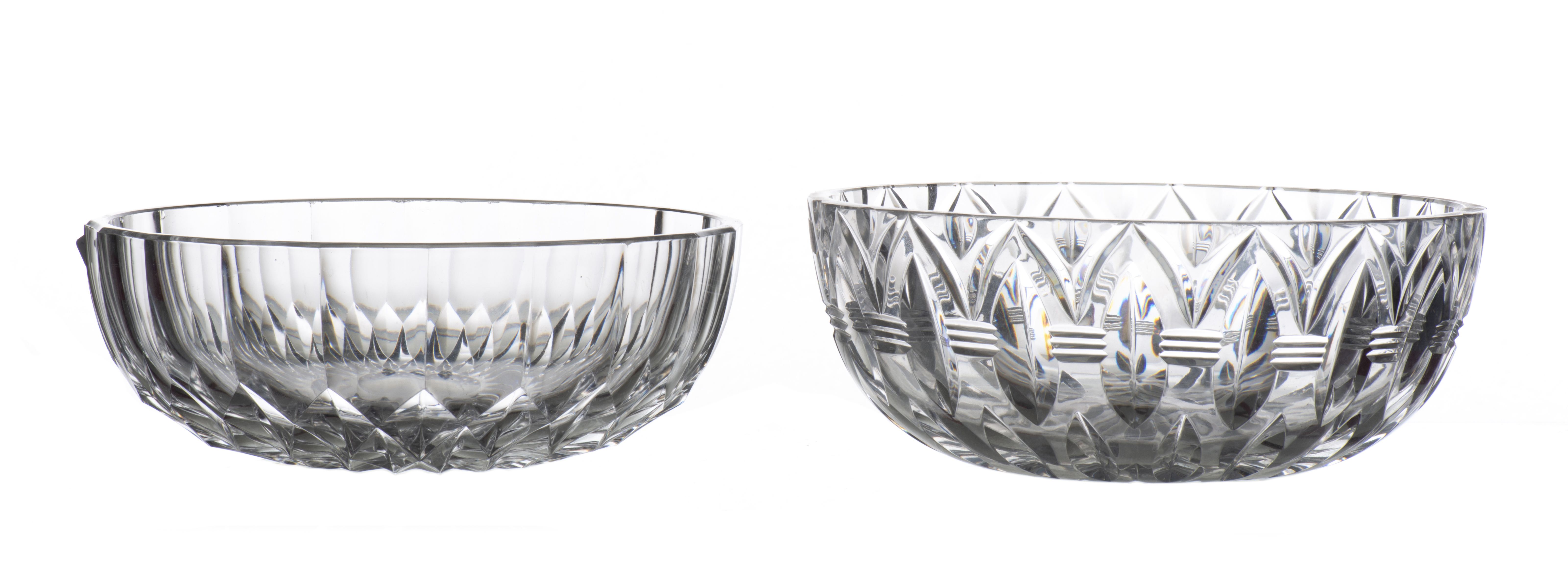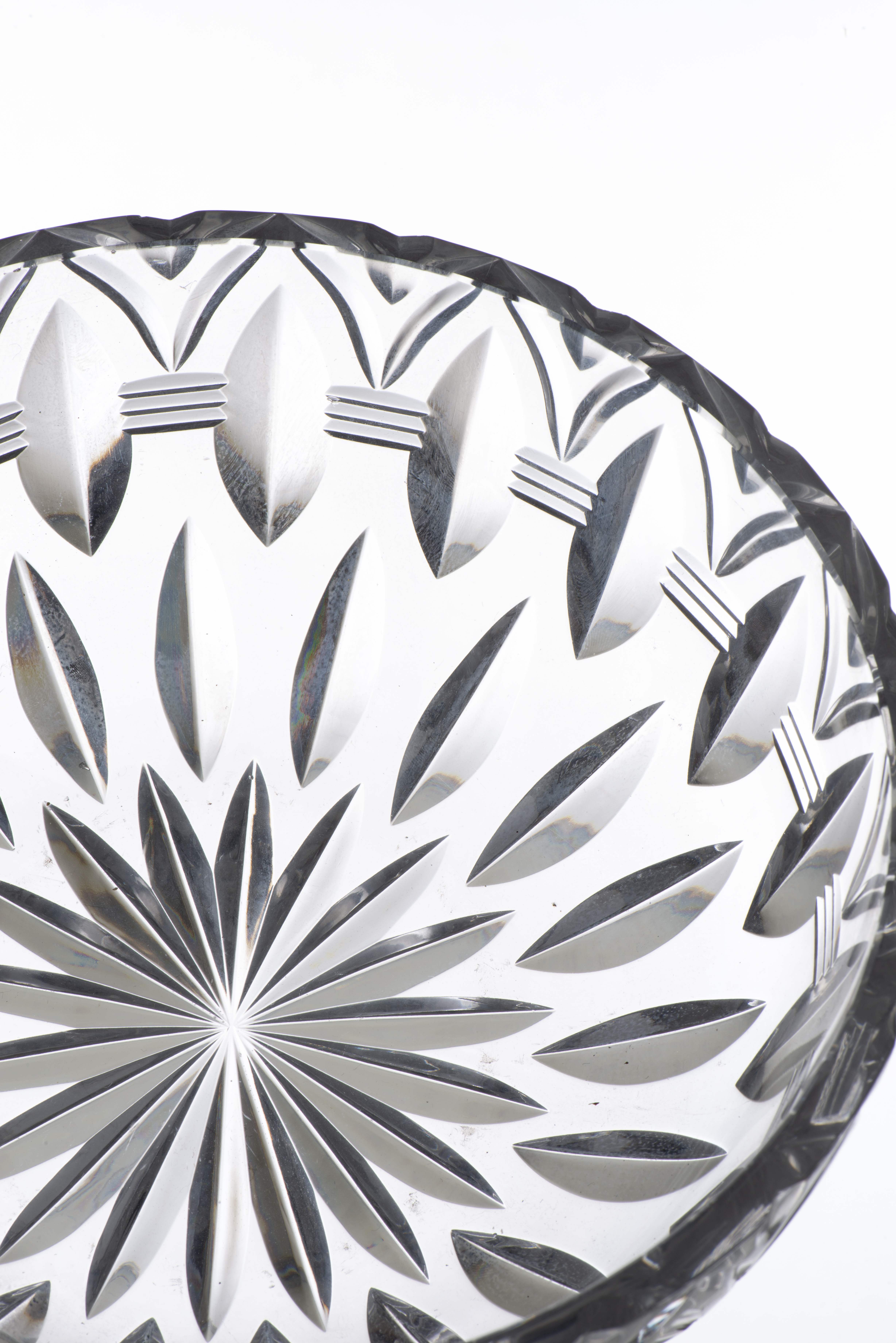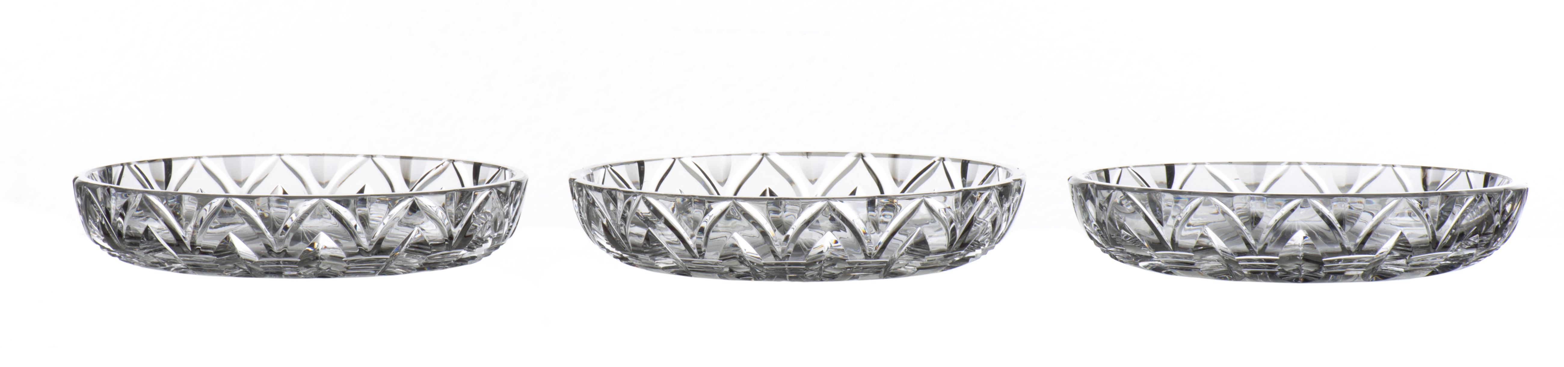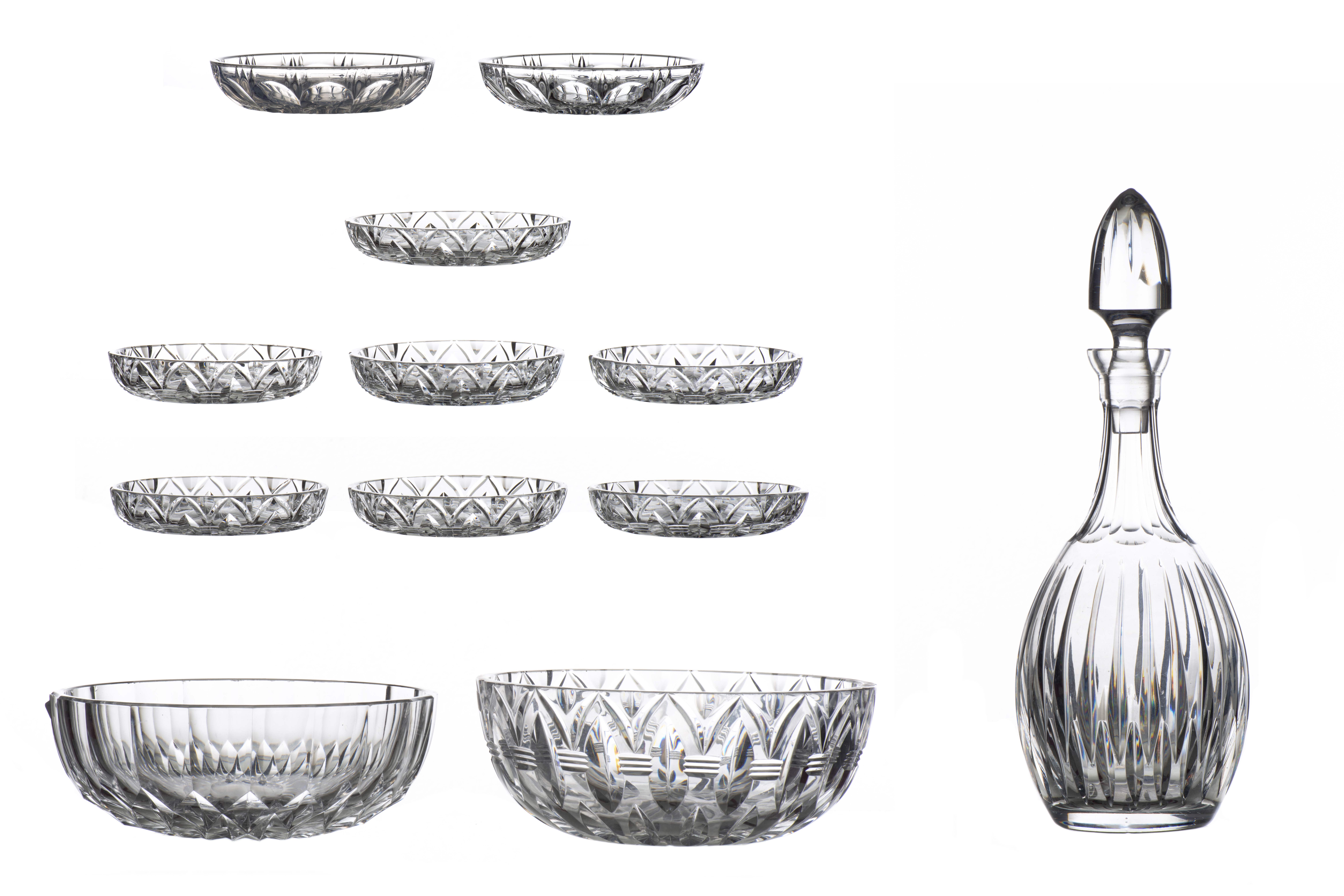 Ensemble en cristal facetté composé de 9 coupelles, 2 saladiers et 1 carafe.