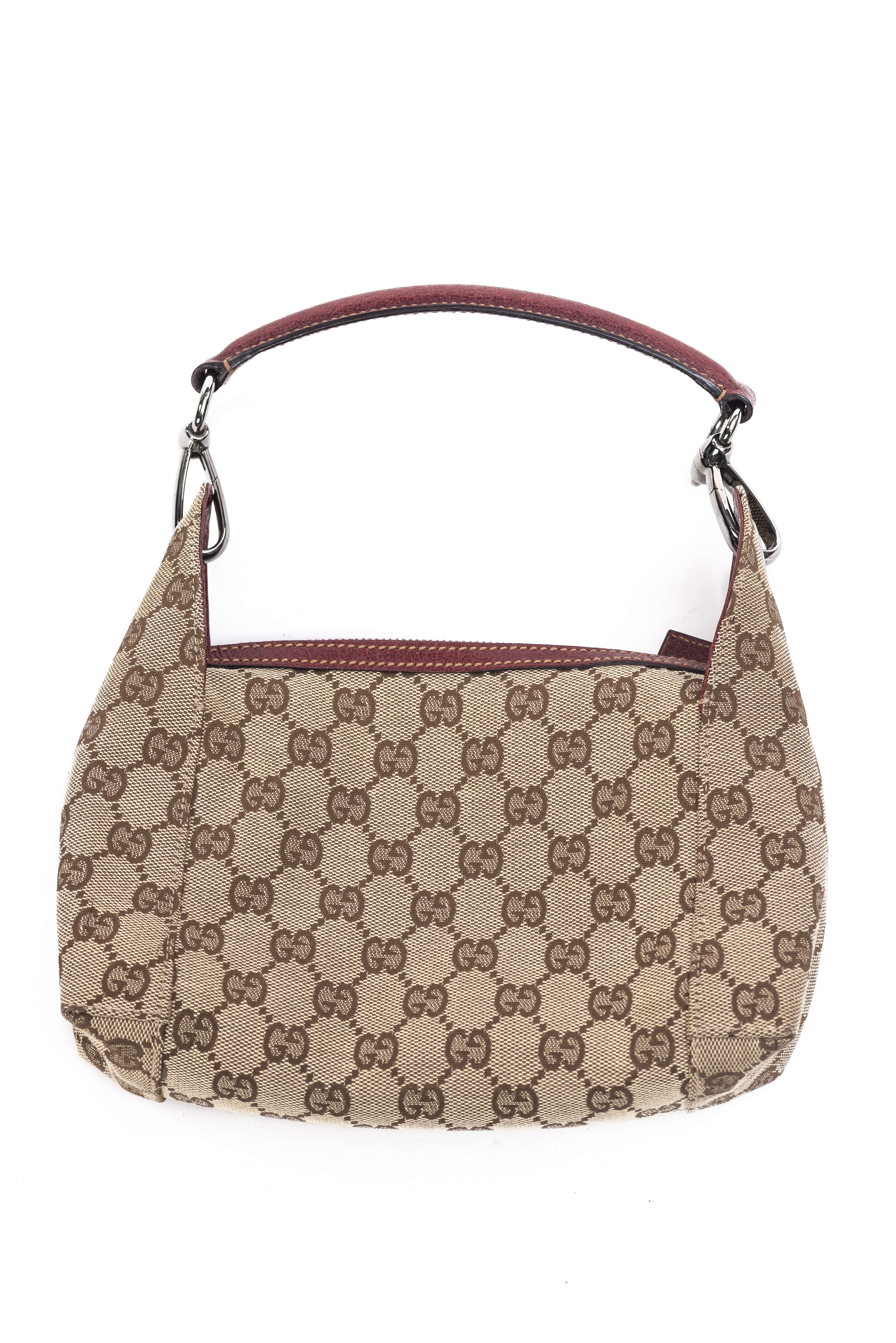 Gucci, sac à main en toile monogrammée beige avec anse en cuir rouge accrochée par des mousquetons en métal chromé