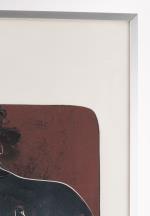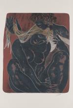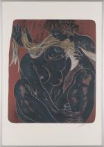 Hans ERNI (1909-2015) "Couple, sa main dans ses cheveux" lithographie en couleurs sur fond lie de vin, num. en bas à gauche 92/150 et signé en bas à droite au crayon.