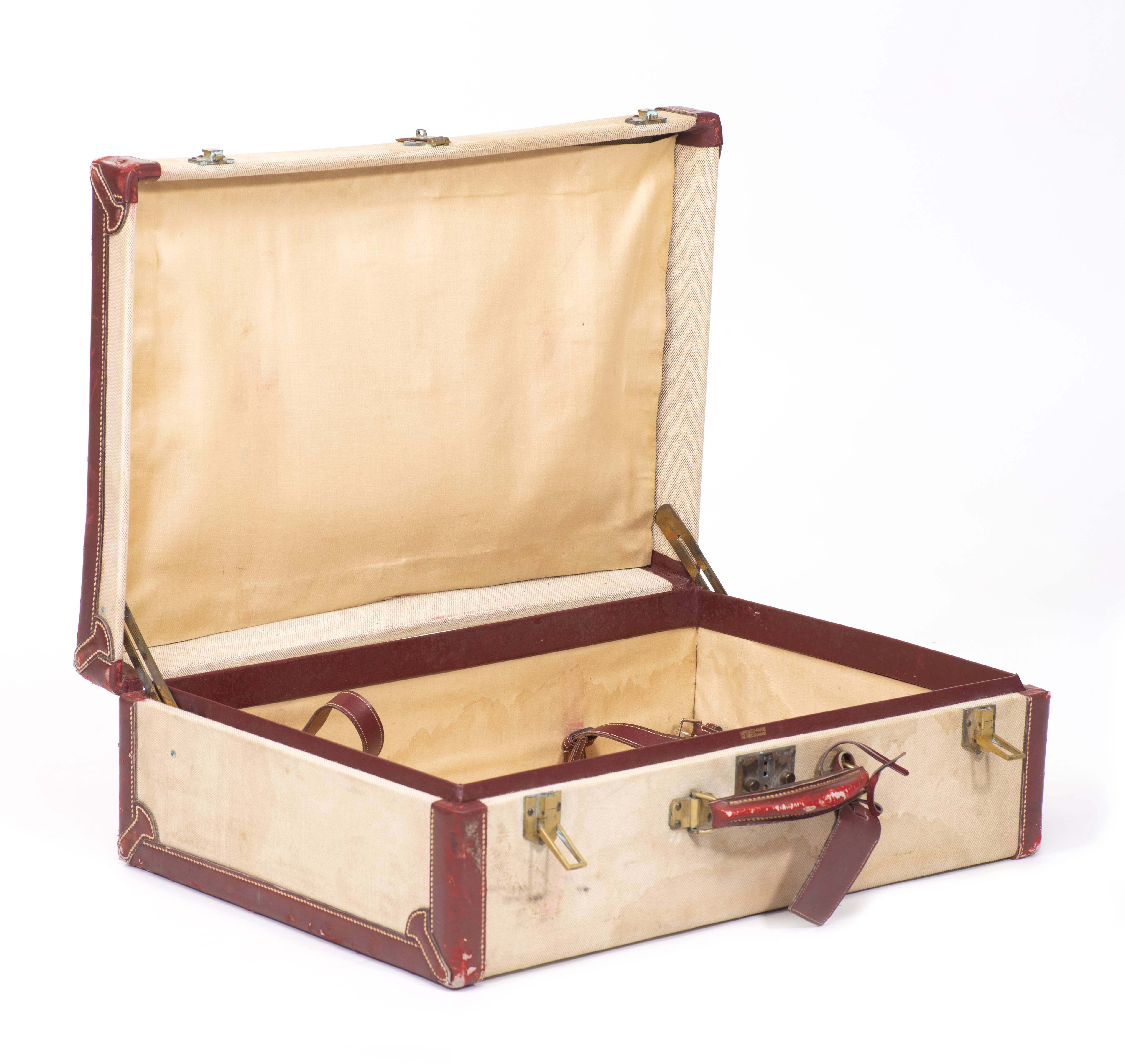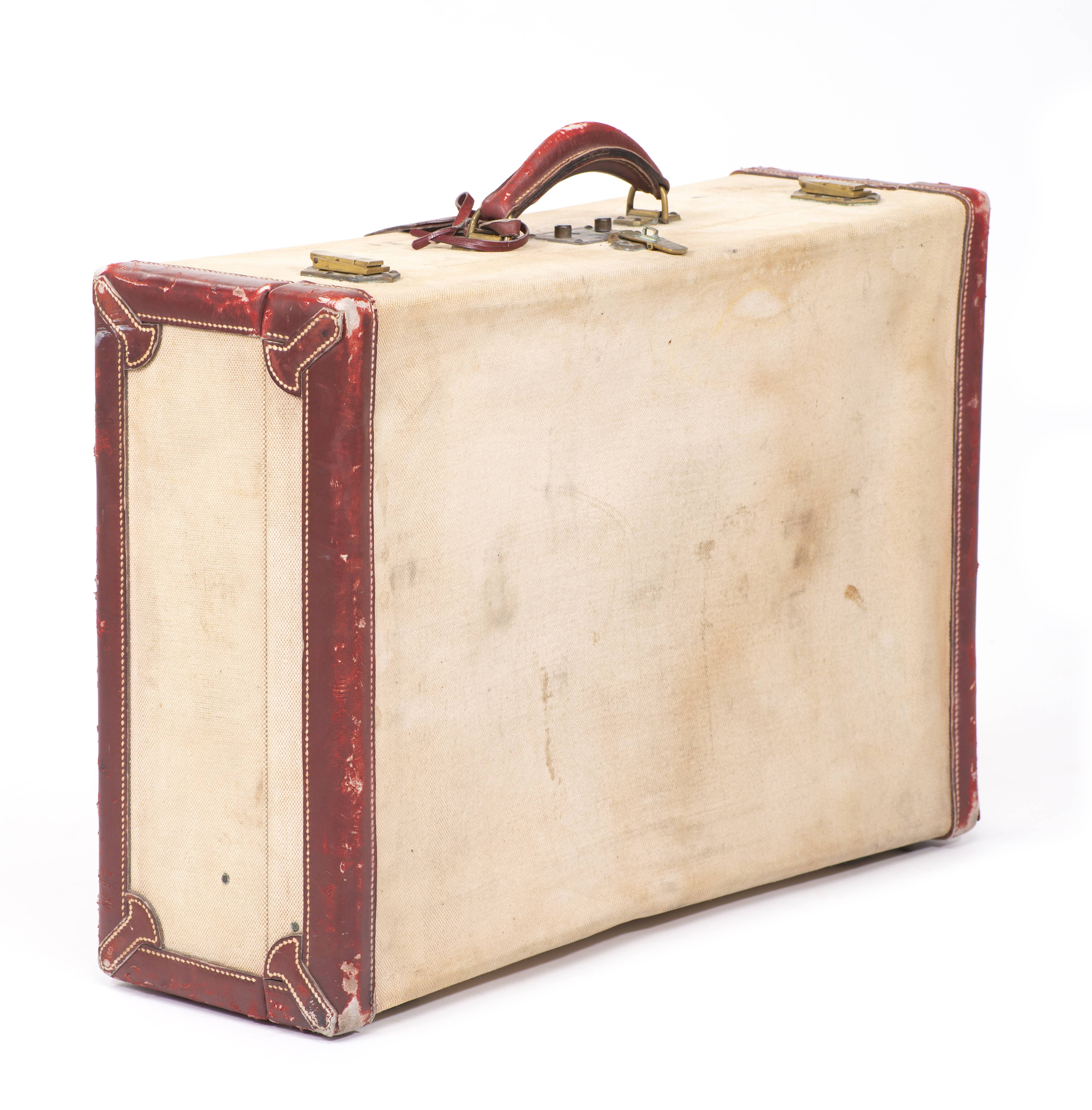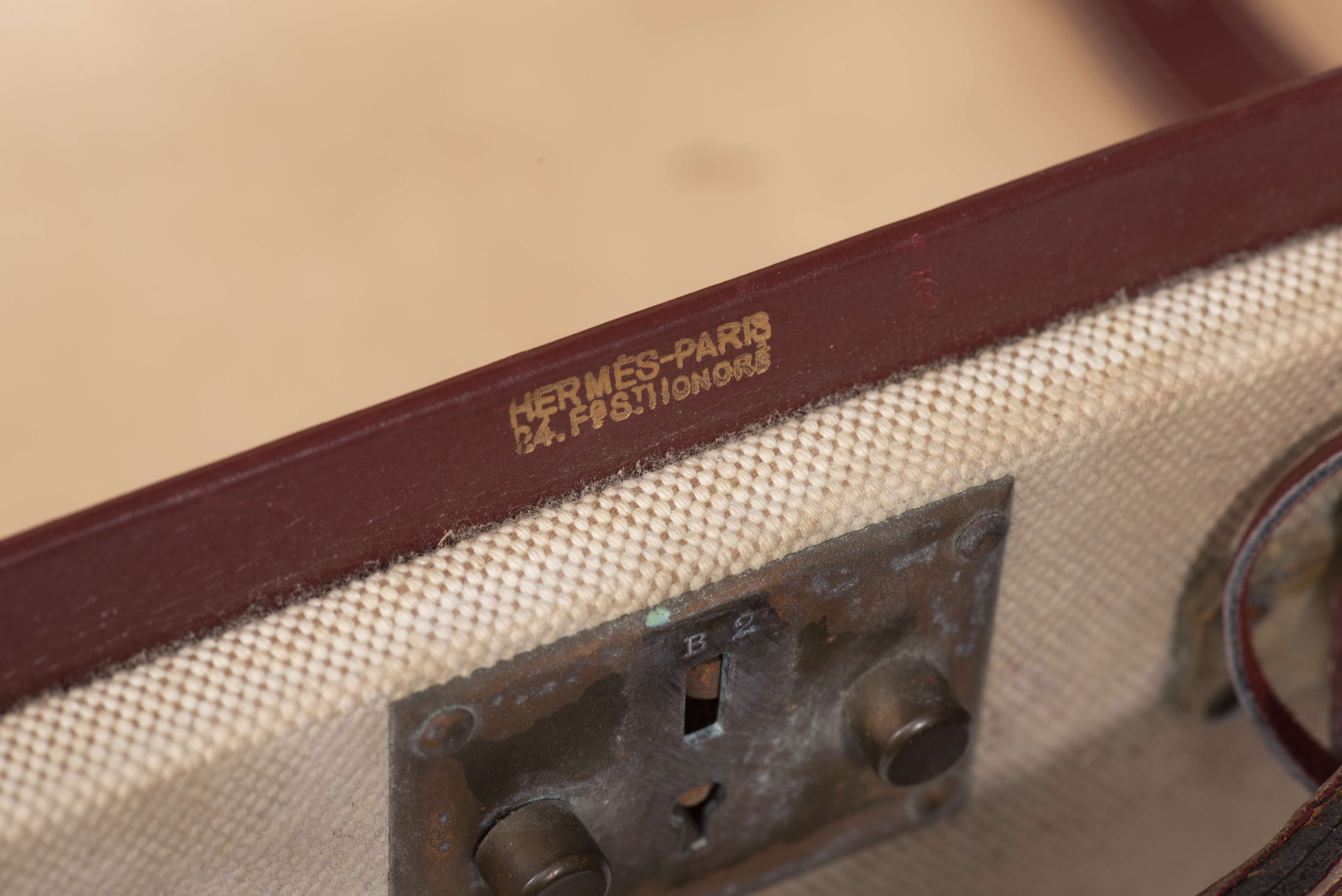 Hermès valise en toile beige et pourtour en cuir rouge avec fermetures en laiton signé Hermès n°A..9.