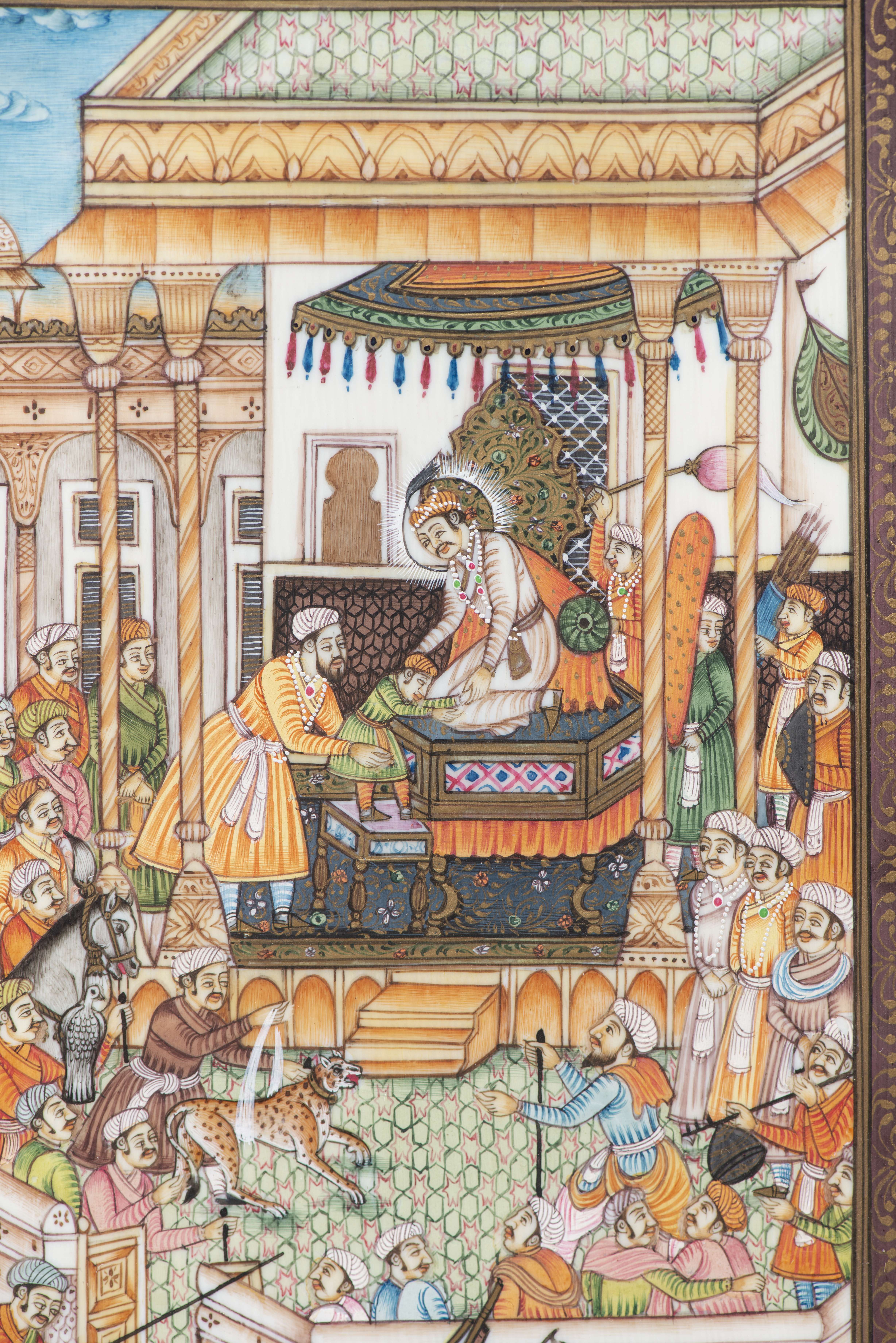 INDE. Deux plaques d'enluminures sur ivoire aquarellées et reprises à l'or