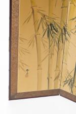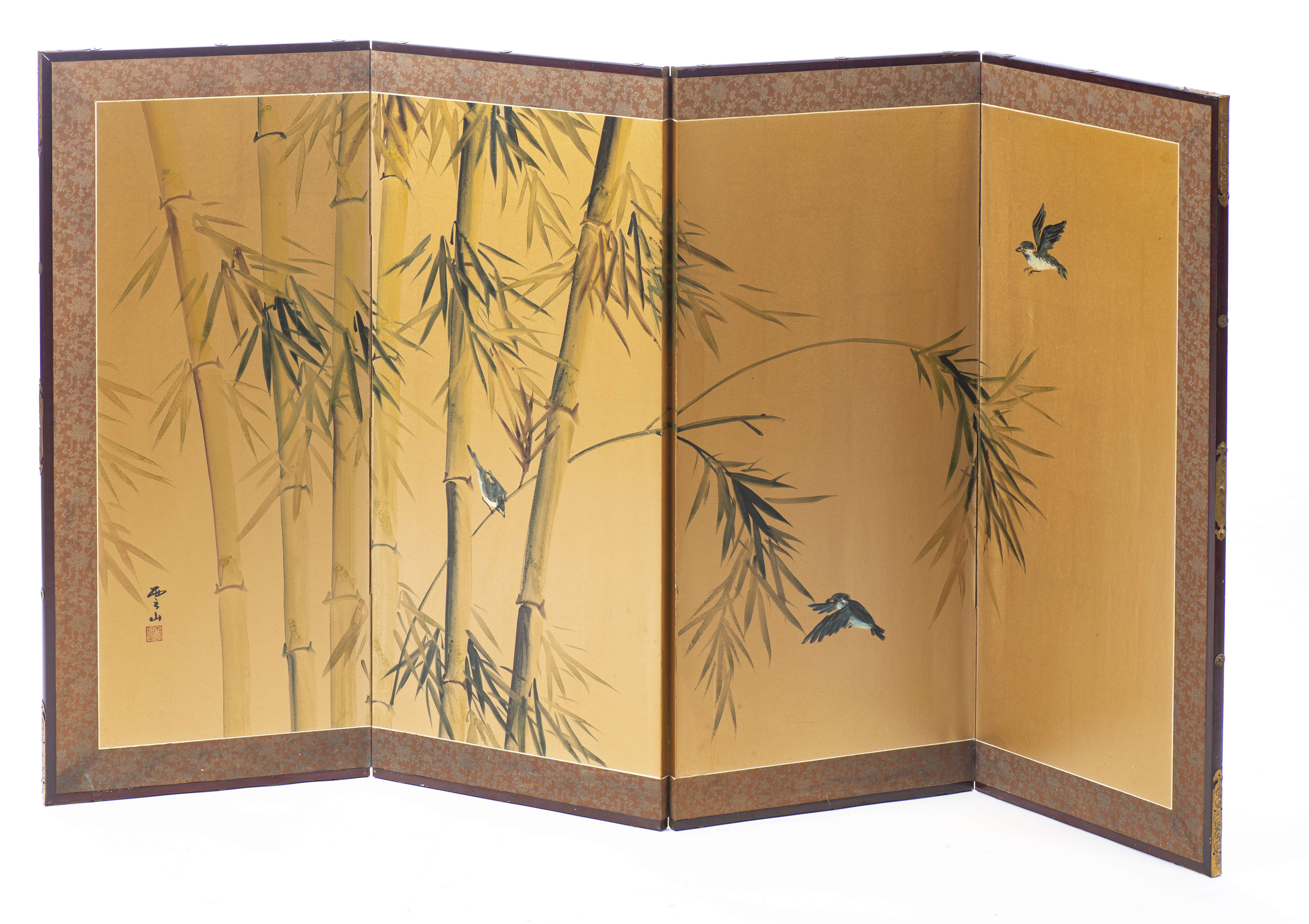 JAPON, Paravent à quatre panneaux à décor d'oiseaux dans les bambous sur fond or. Ère Taishō ou postérieur.