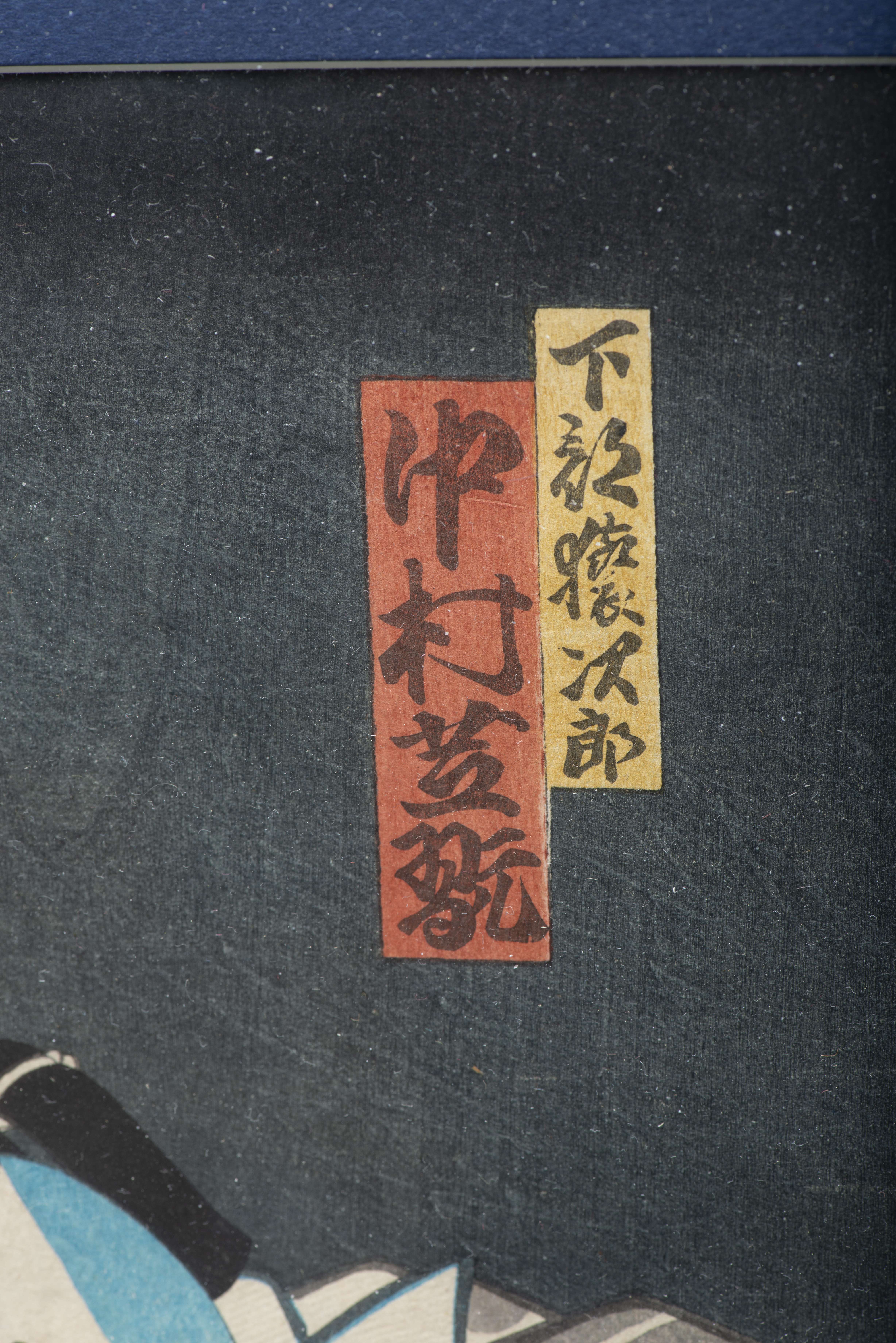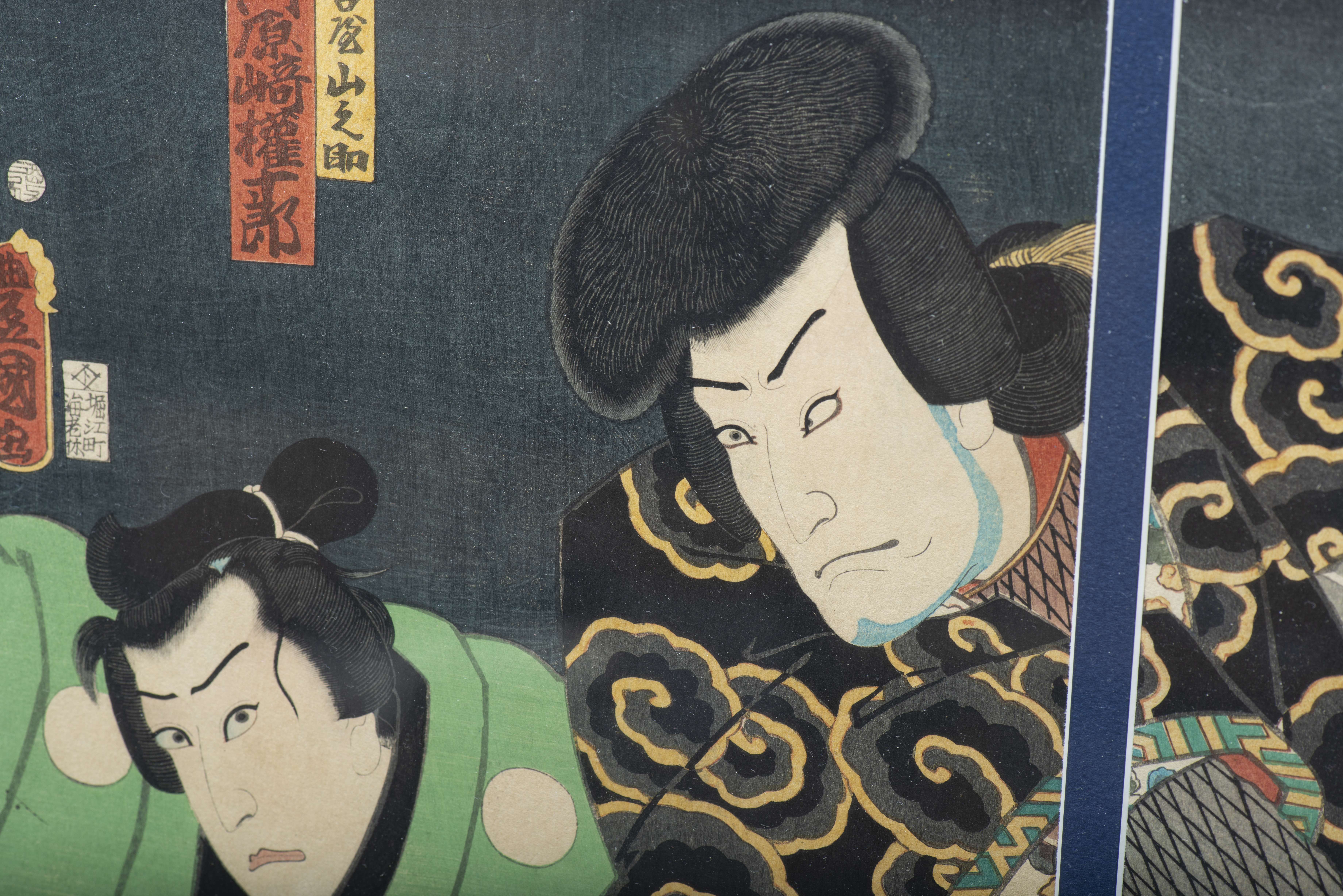 JAPON, Toyokuni III (1786-1865), Tsunoda Kunisada Utagawa, "Nakamura IV en Shinobe Enjiro, BandoKameso en Koike Tetsurato et Kawarasaki Gonjuro en Nagoya Sannosuke" ére Meiji