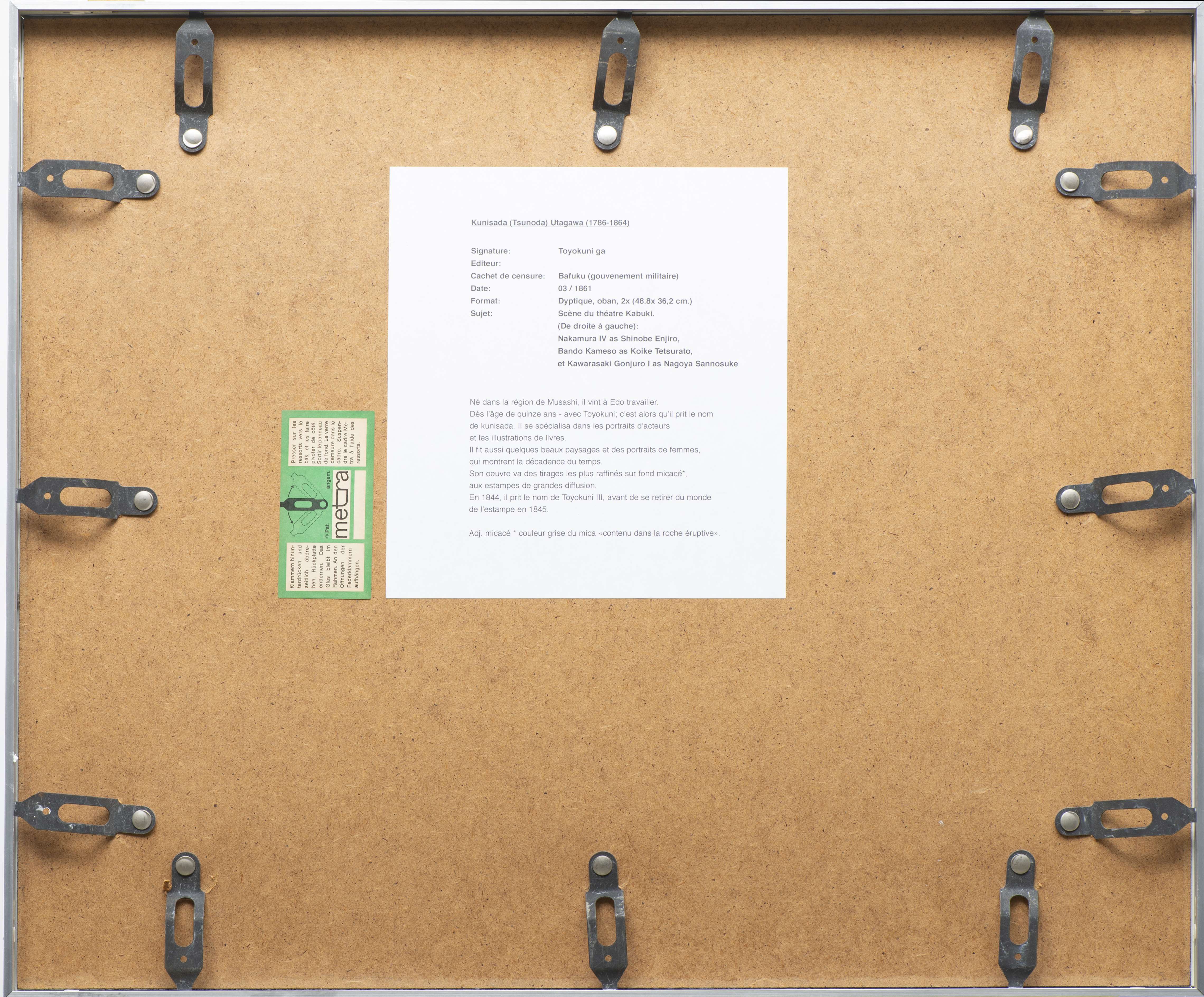 JAPON, Toyokuni III (1786-1865) aussi connu sous le nom de Tsunoda Kunisada Utagawa, diptyque d'une scène de théâtre de Kabuki représentant de droite à gauche "Nakamura IV en Shinobe Enjiro, BandoKameso en Koike Tetsurato et Kawarasaki Gonjuro en Nagoya Sannosuke" Daté 03/1861 avec le cachet de censeur Bafuku (gouvernement militaire).