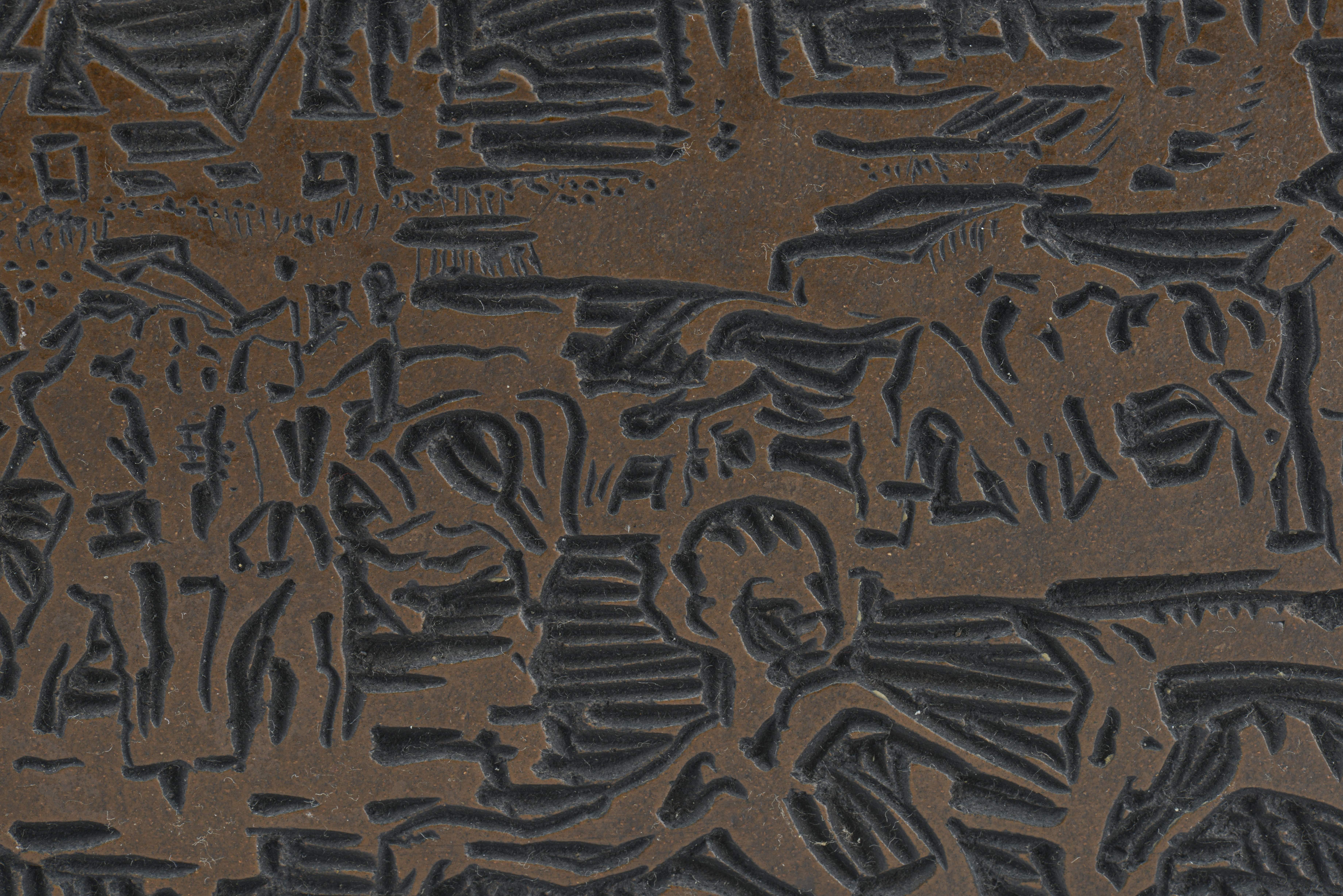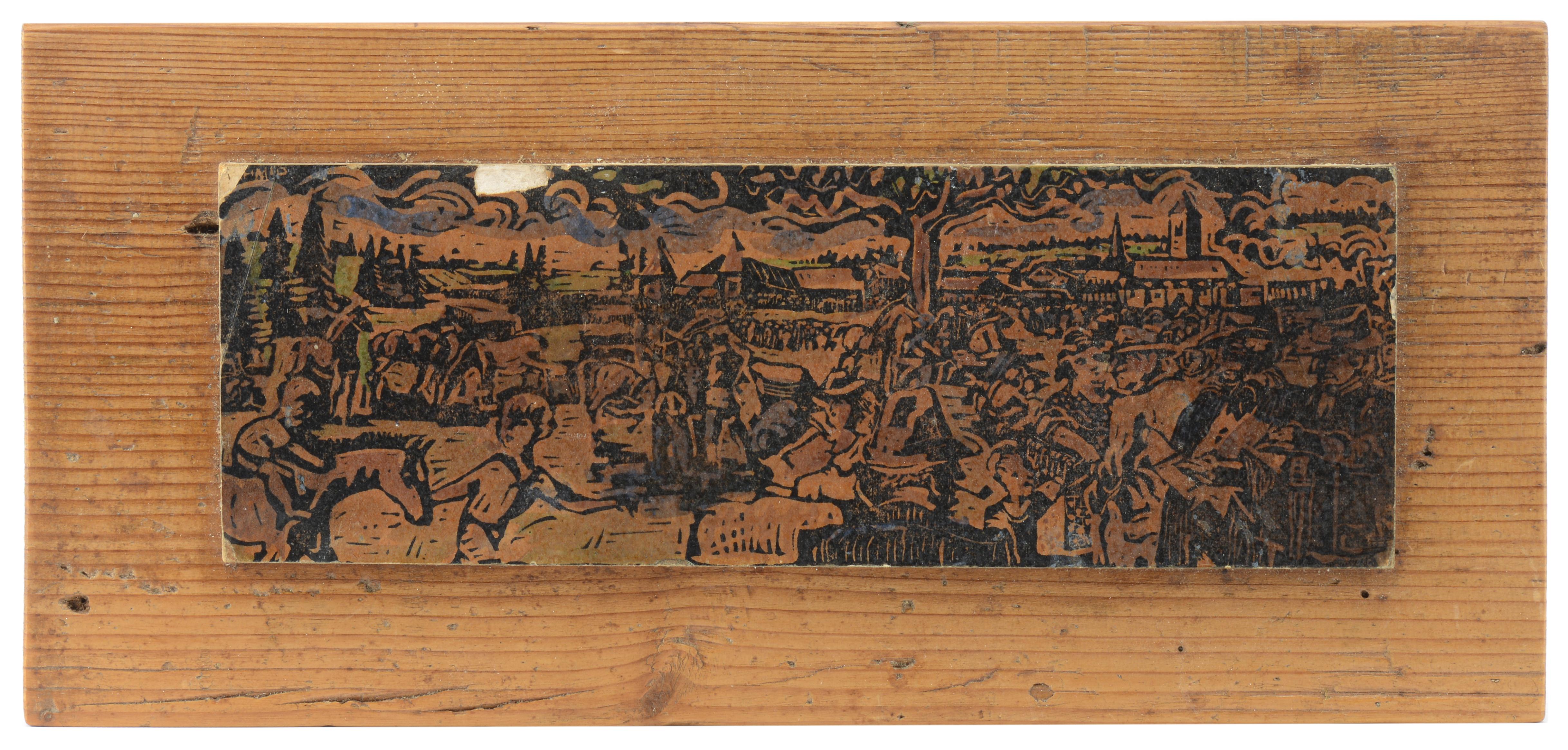 Jean-Pierre SCHMID dit LERMITE (1920-1977) "Marché-concours-43", linogravure en couleur collée sur une plaque de bois, signée en haut à gauche, titré, numéroté 1/2, signé et localisé Saignelégier au dos