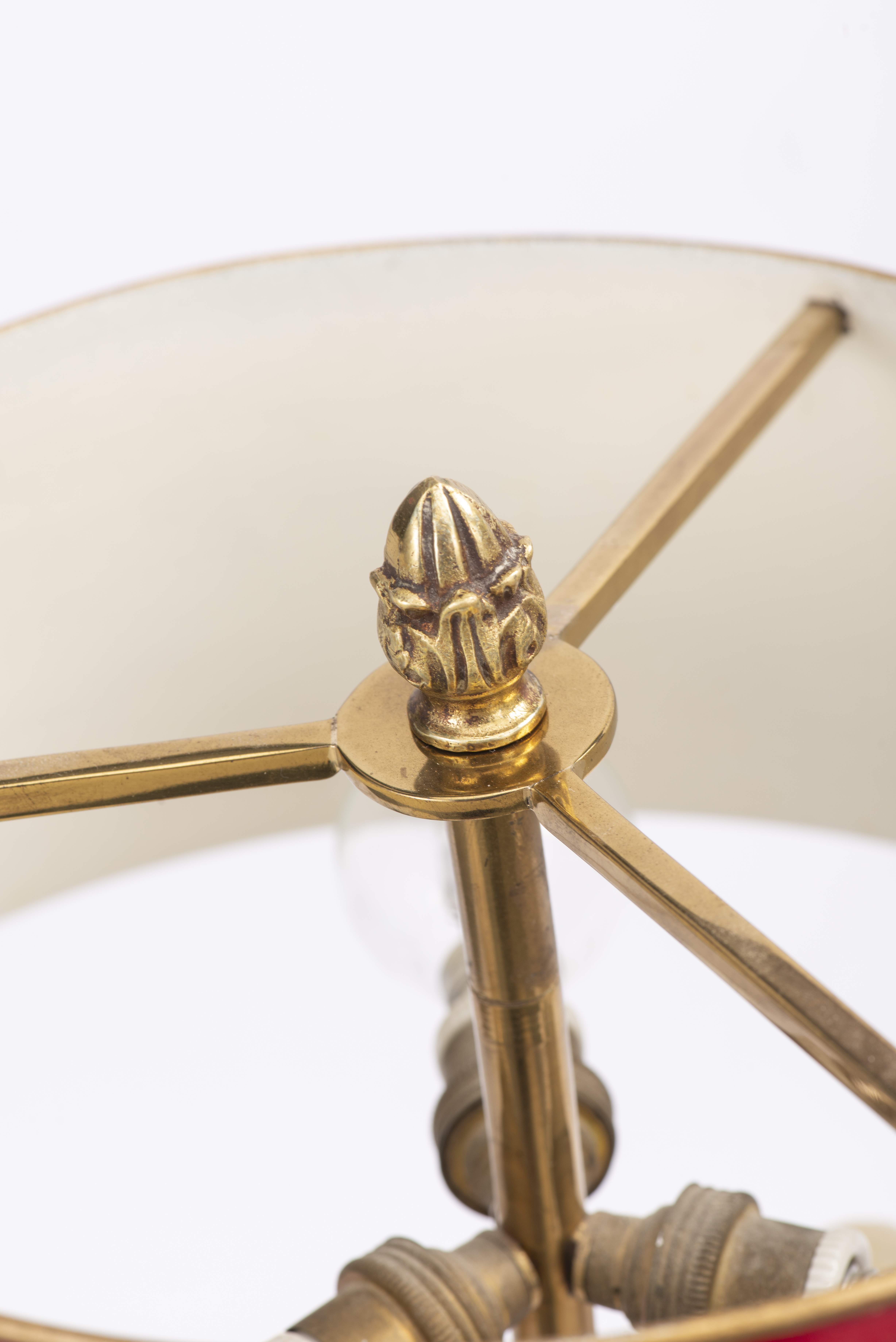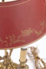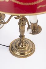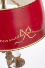Deux lampes bouillottes à trois feux en laiton et abat-jour en métal peint.