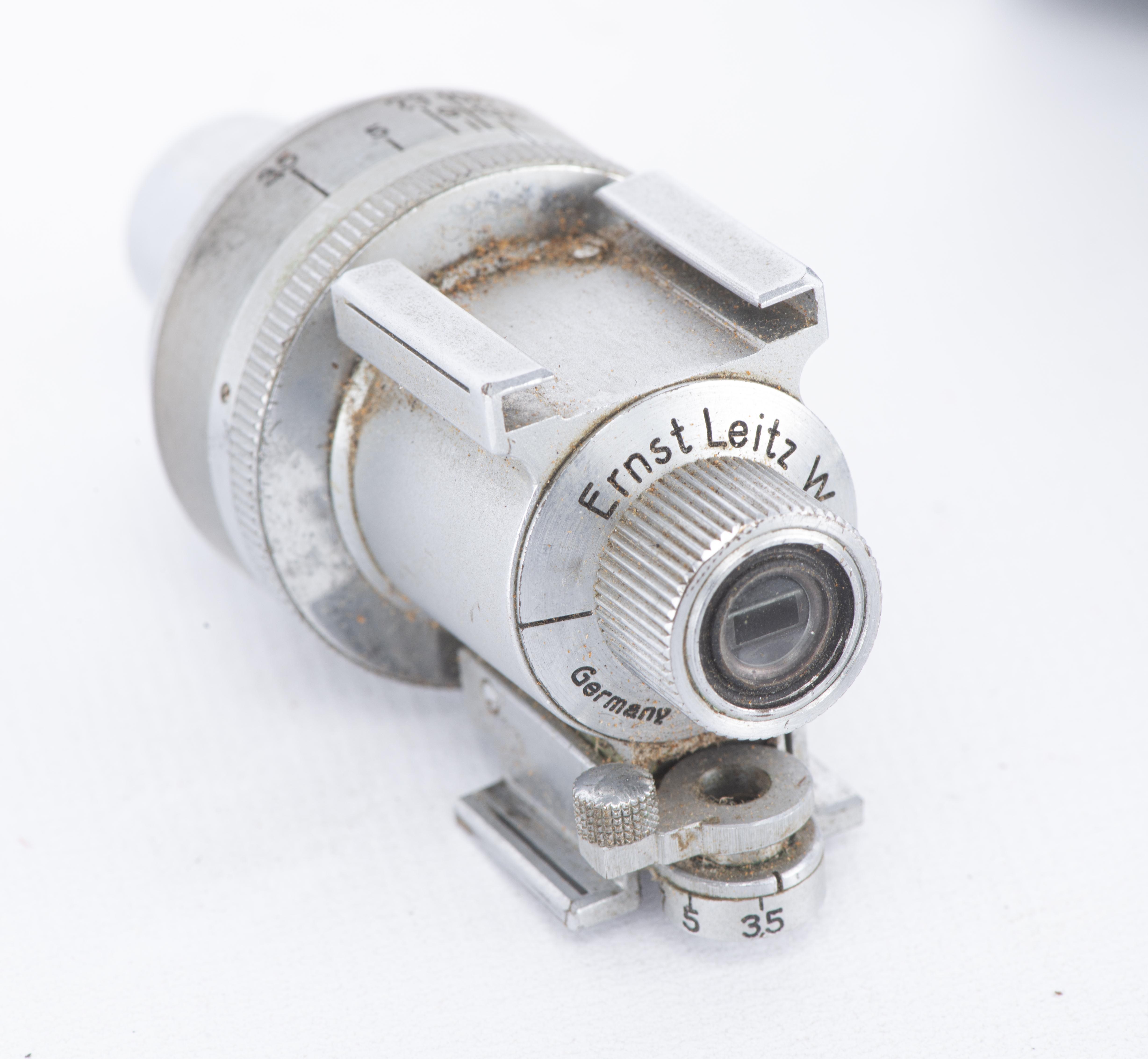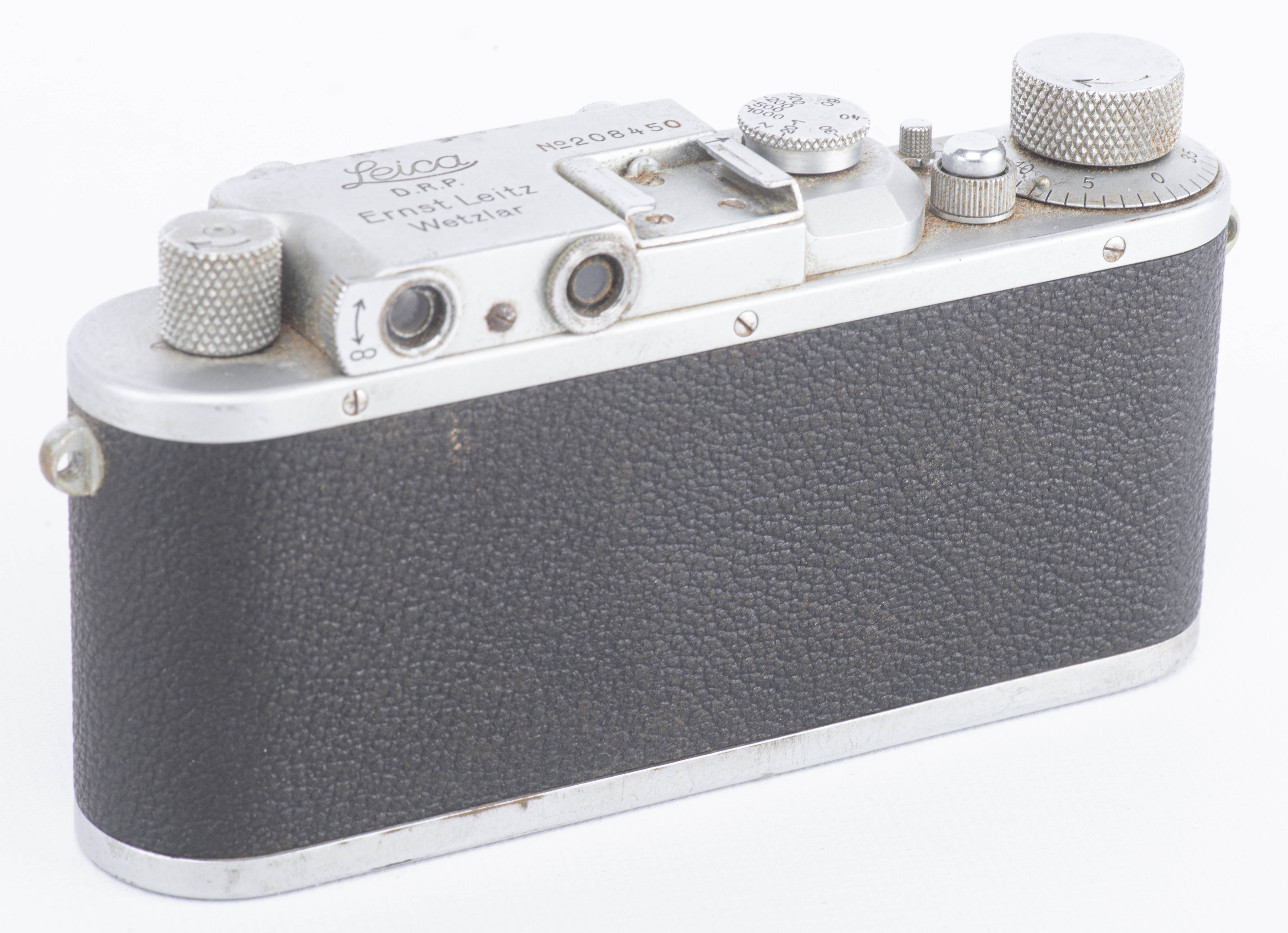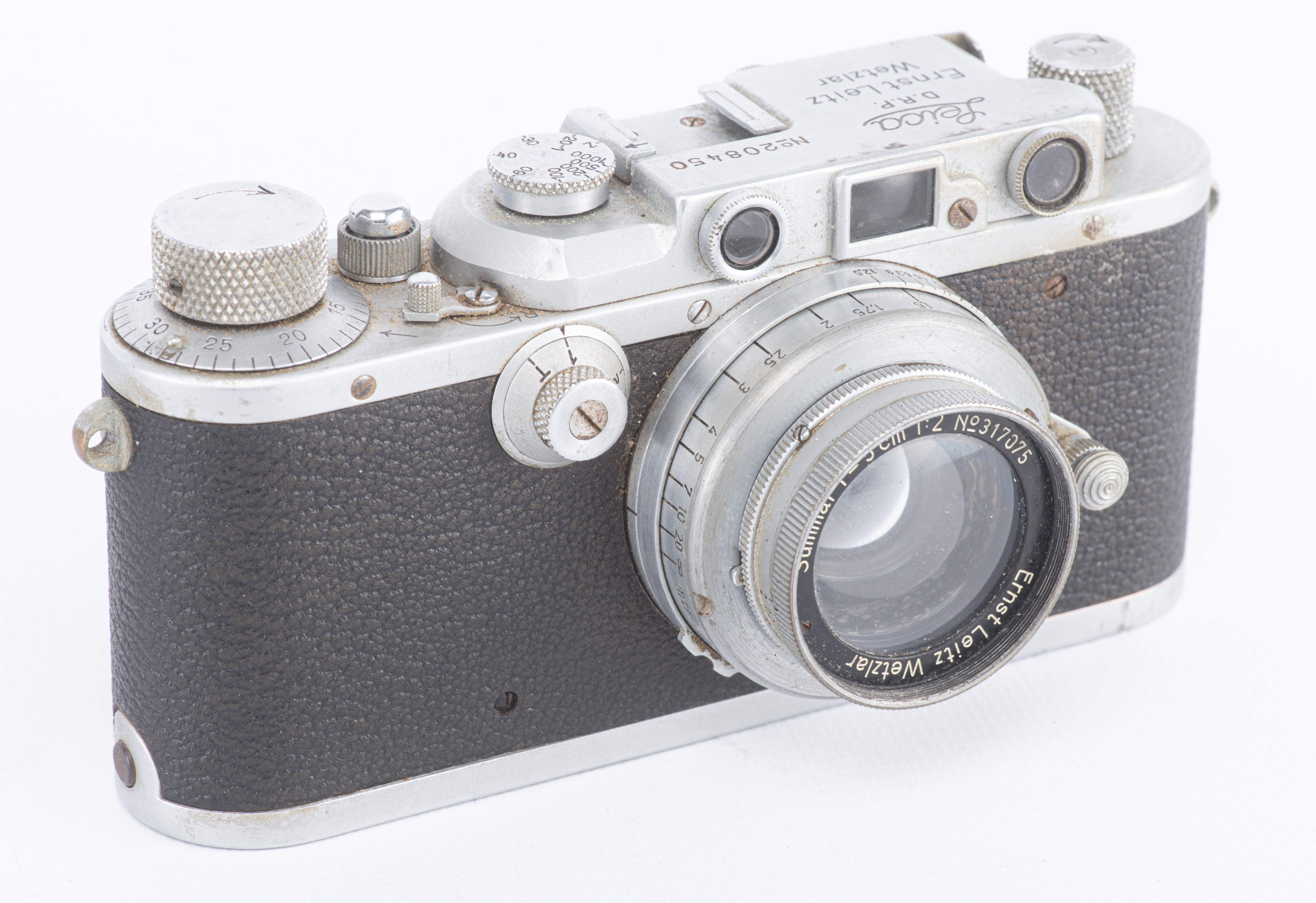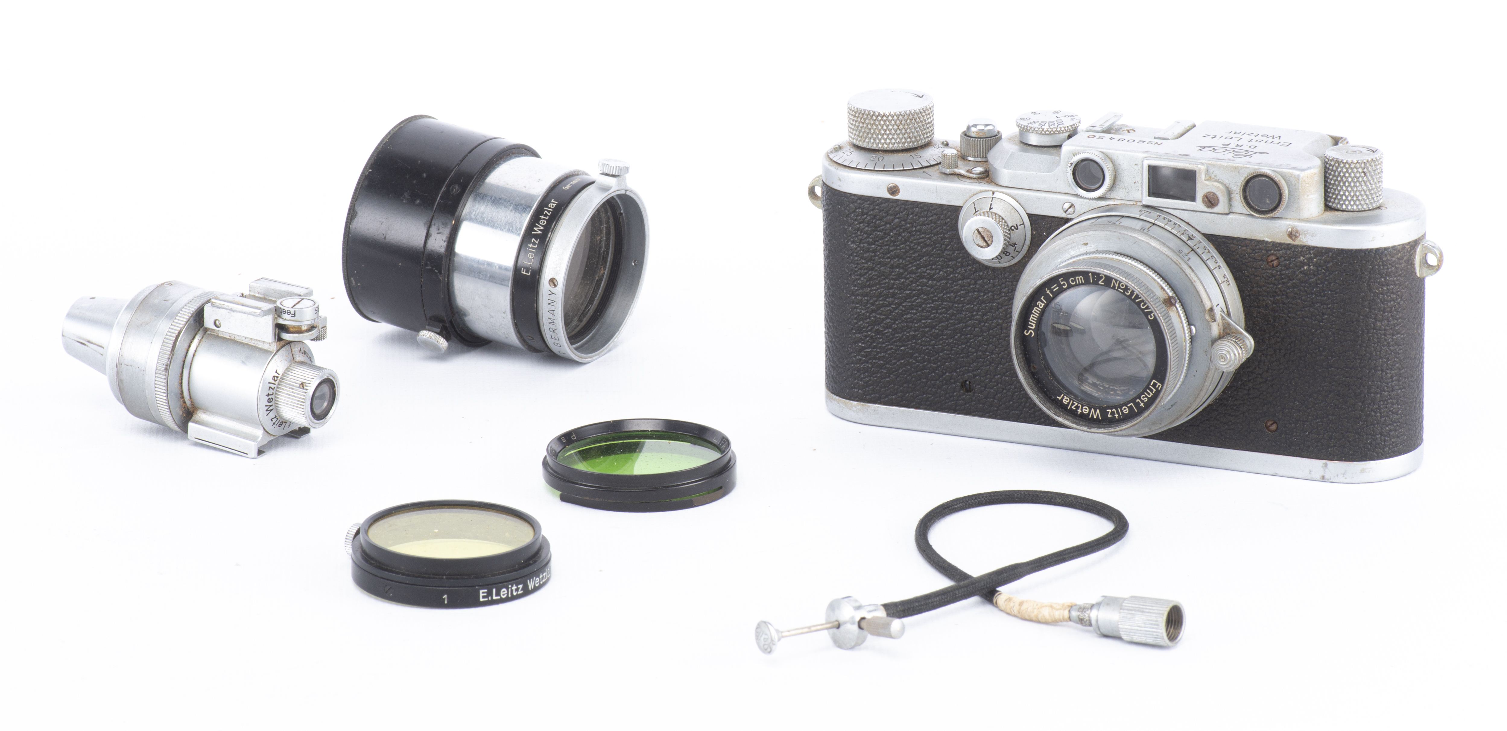 Leitz Leica IIIa (1936-1938) D.R.P. Ernst Leitz Wetzlar boîtier N°208450, optique Summar f = 5 cm 1:2 N°317075 on y joint un viseur, un déclencheur, un pare-soleil, 2 boîtes de filtres.