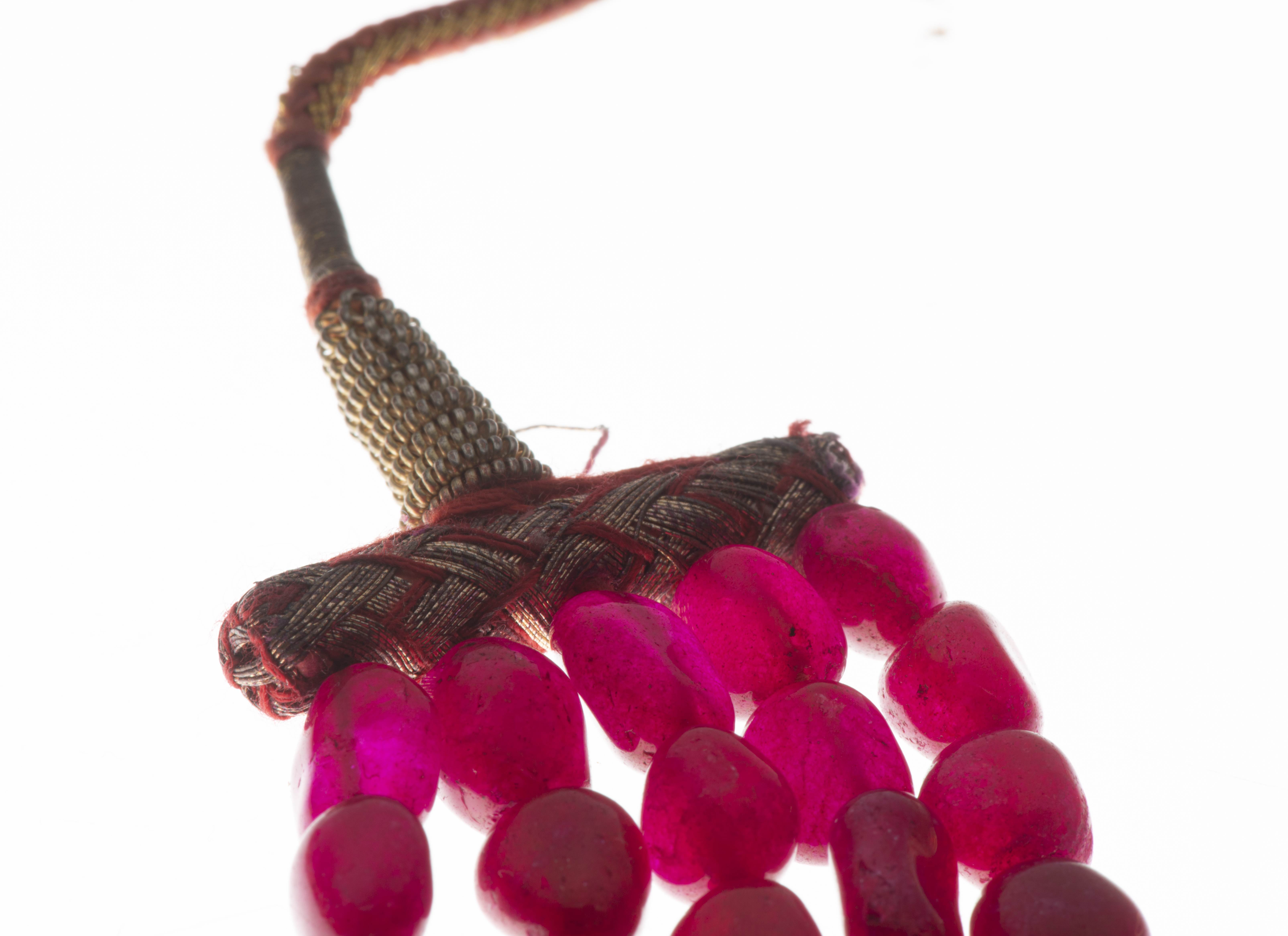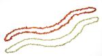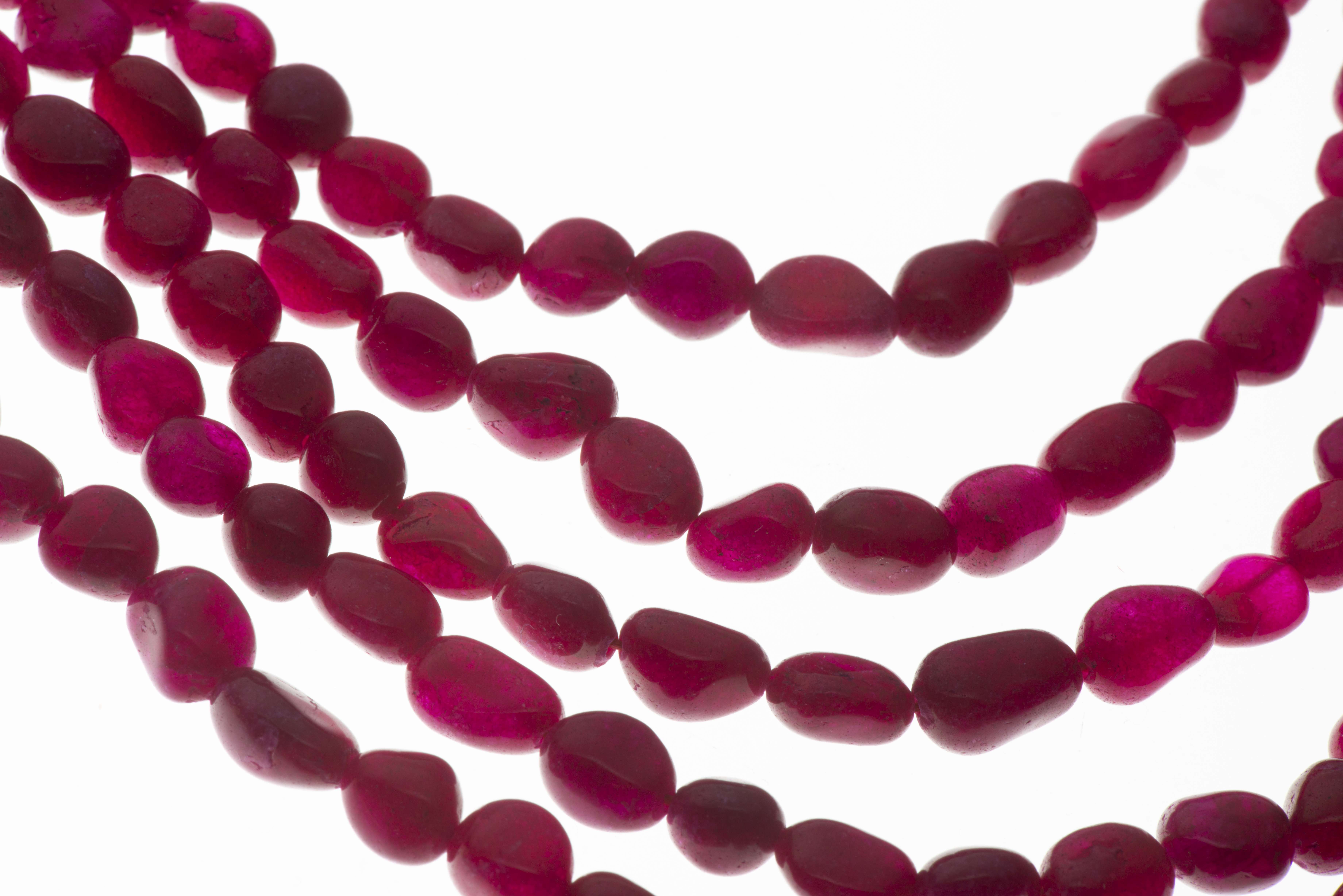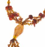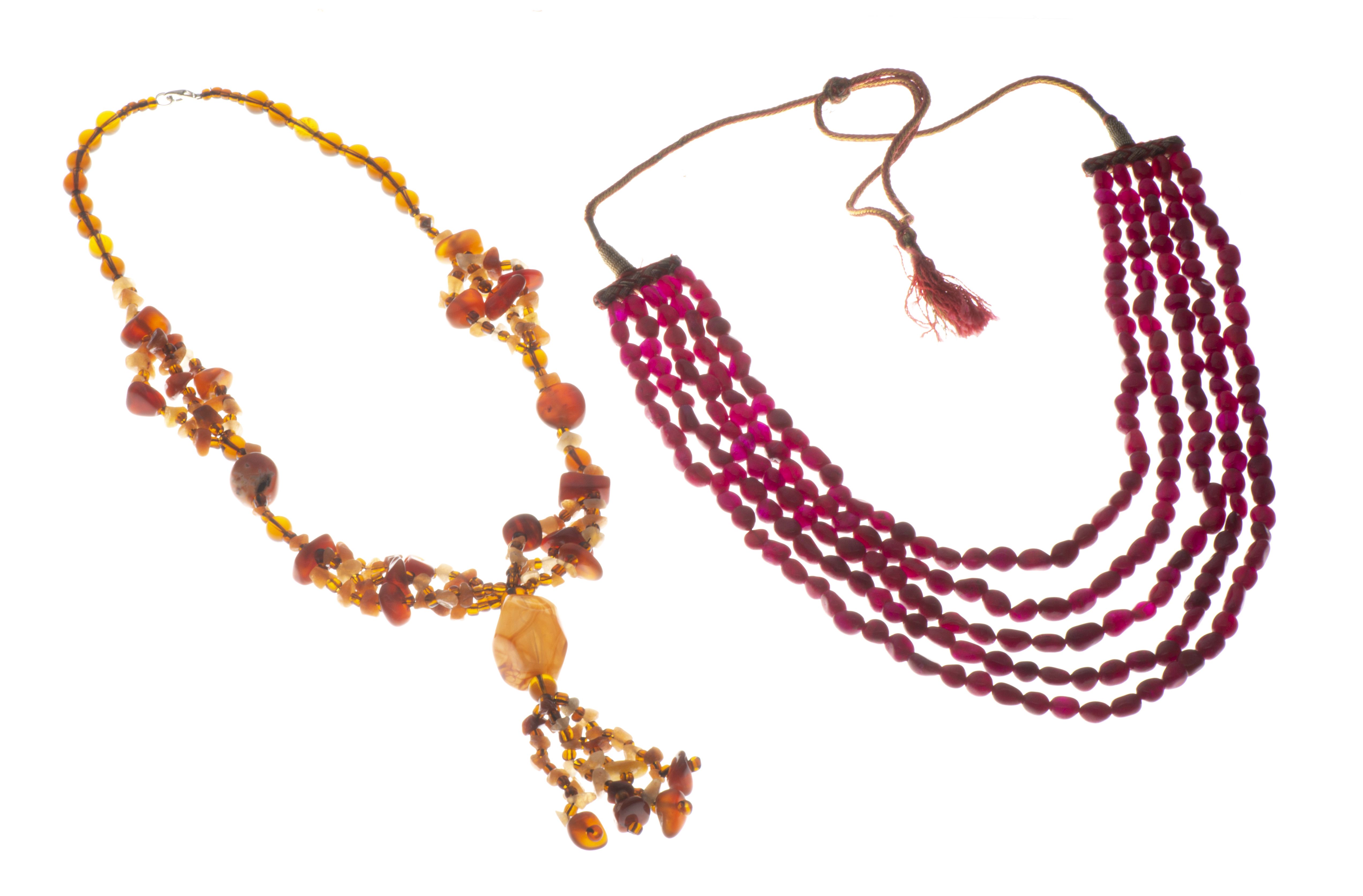 Lot de quatre colliers en ambre, péridot et rubis teinté