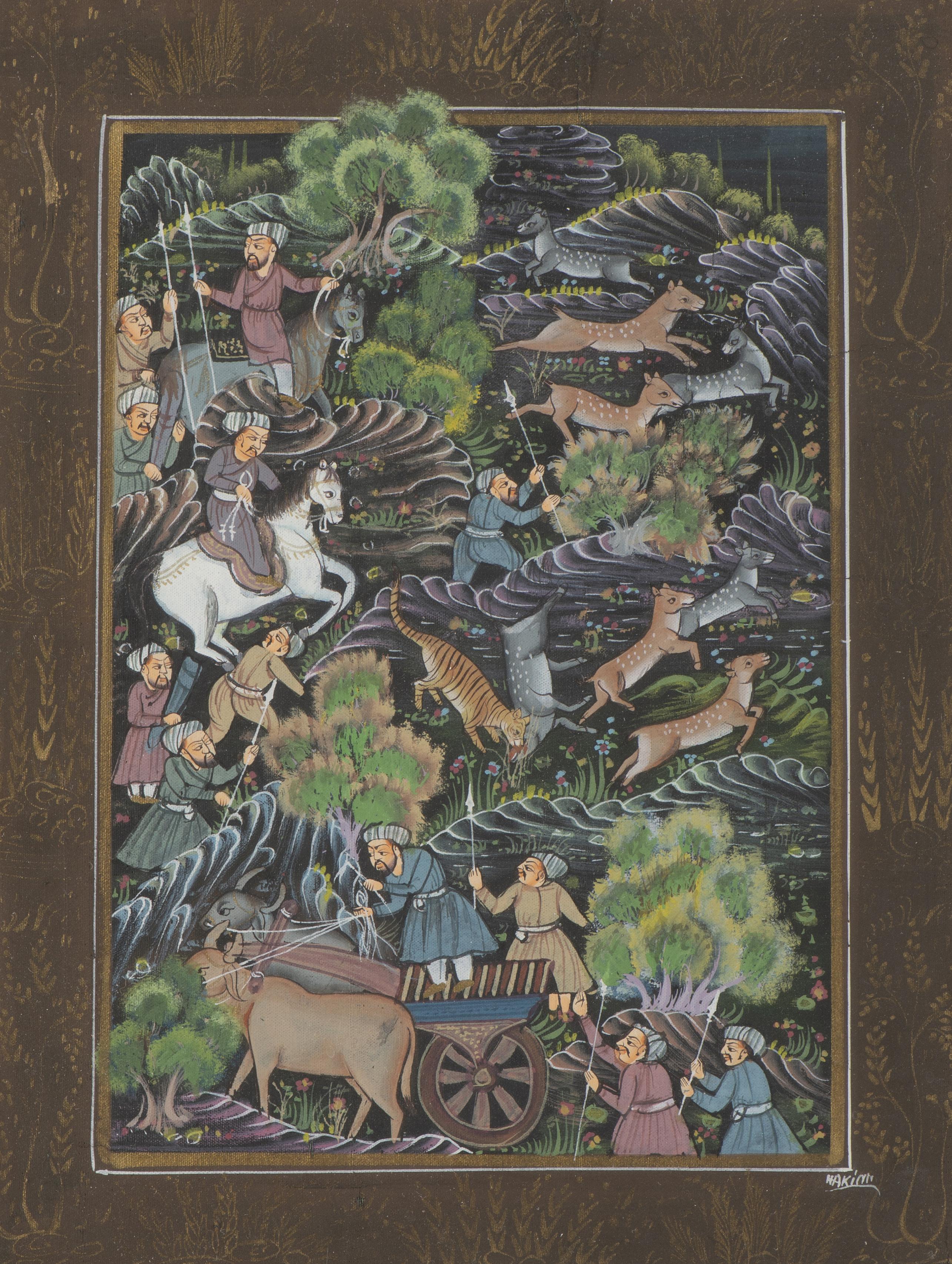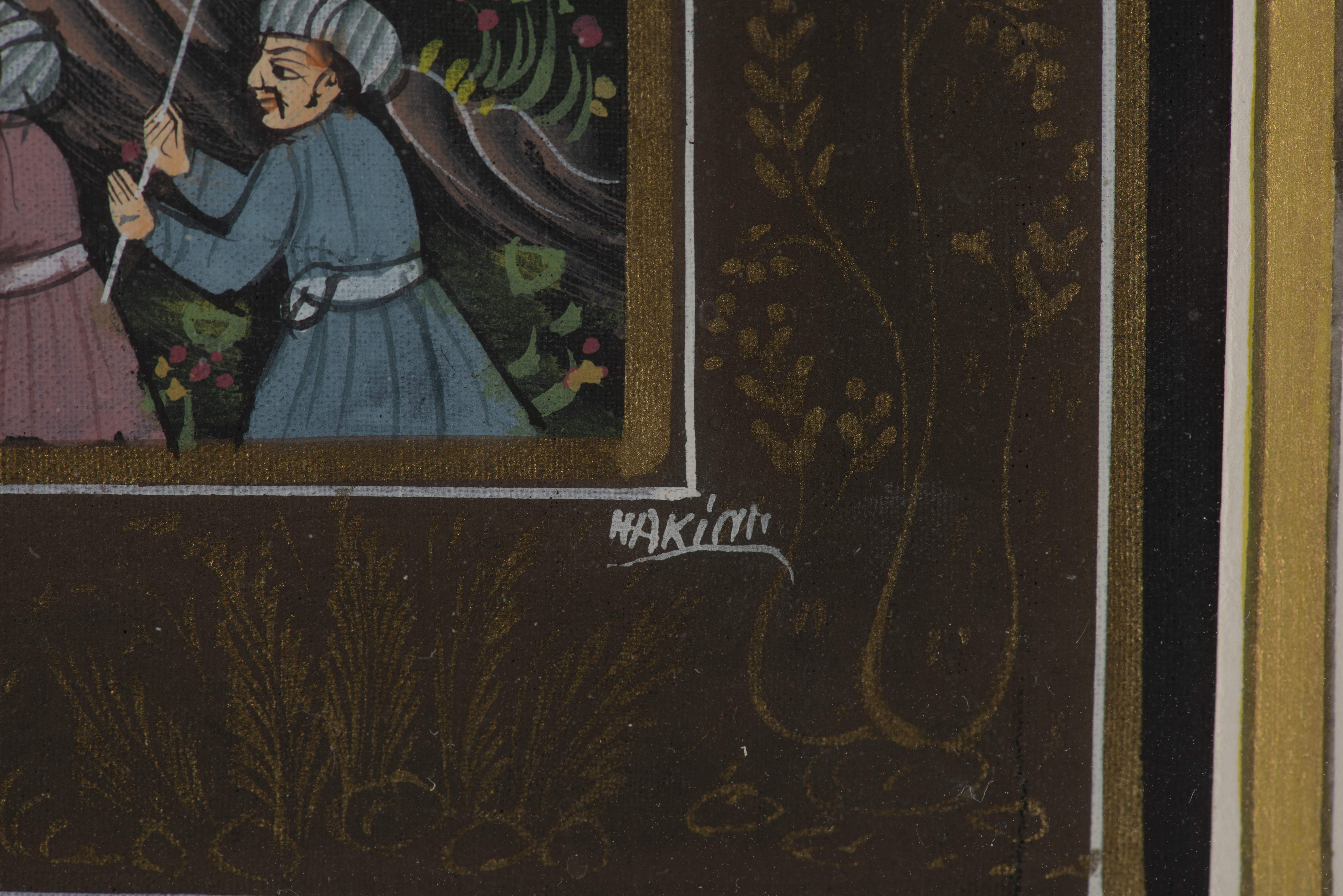 Quatre miniatures indiennes, deux représentant des musiciens, une autre, une scène dans la campagne et une dernière présentant un portrait de jeune femme sbd HAKIM.
