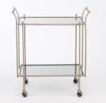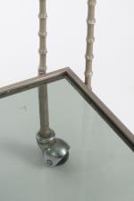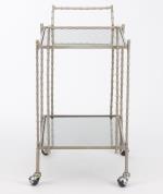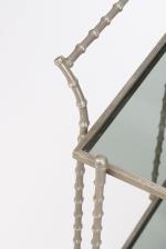 Maison BAGUES, dans le goût de, servir-boy ou table roulante à structure en laiton, laiton nickelé façon bambou à double plateaux en verre teinté. Circa 1970.