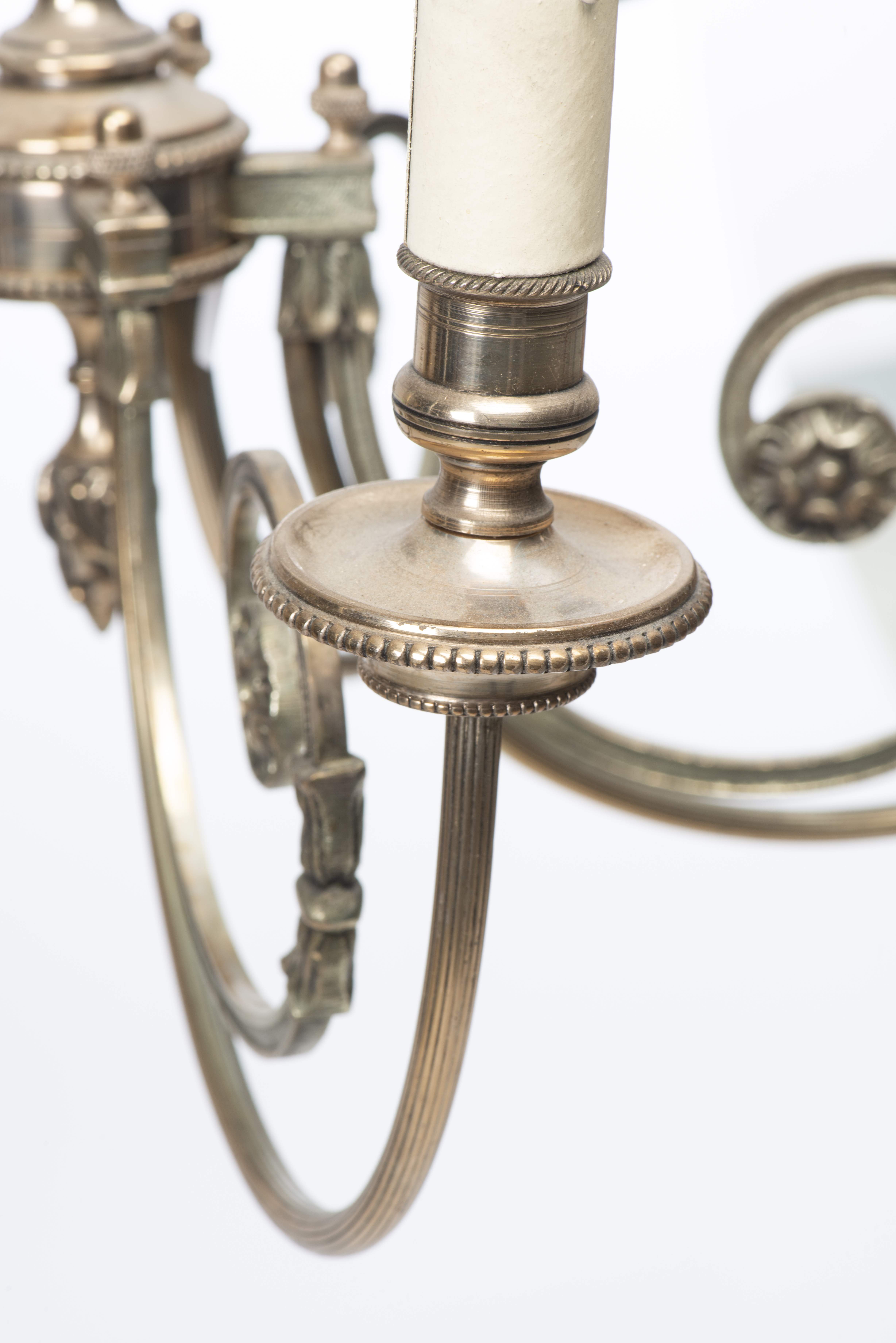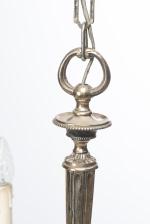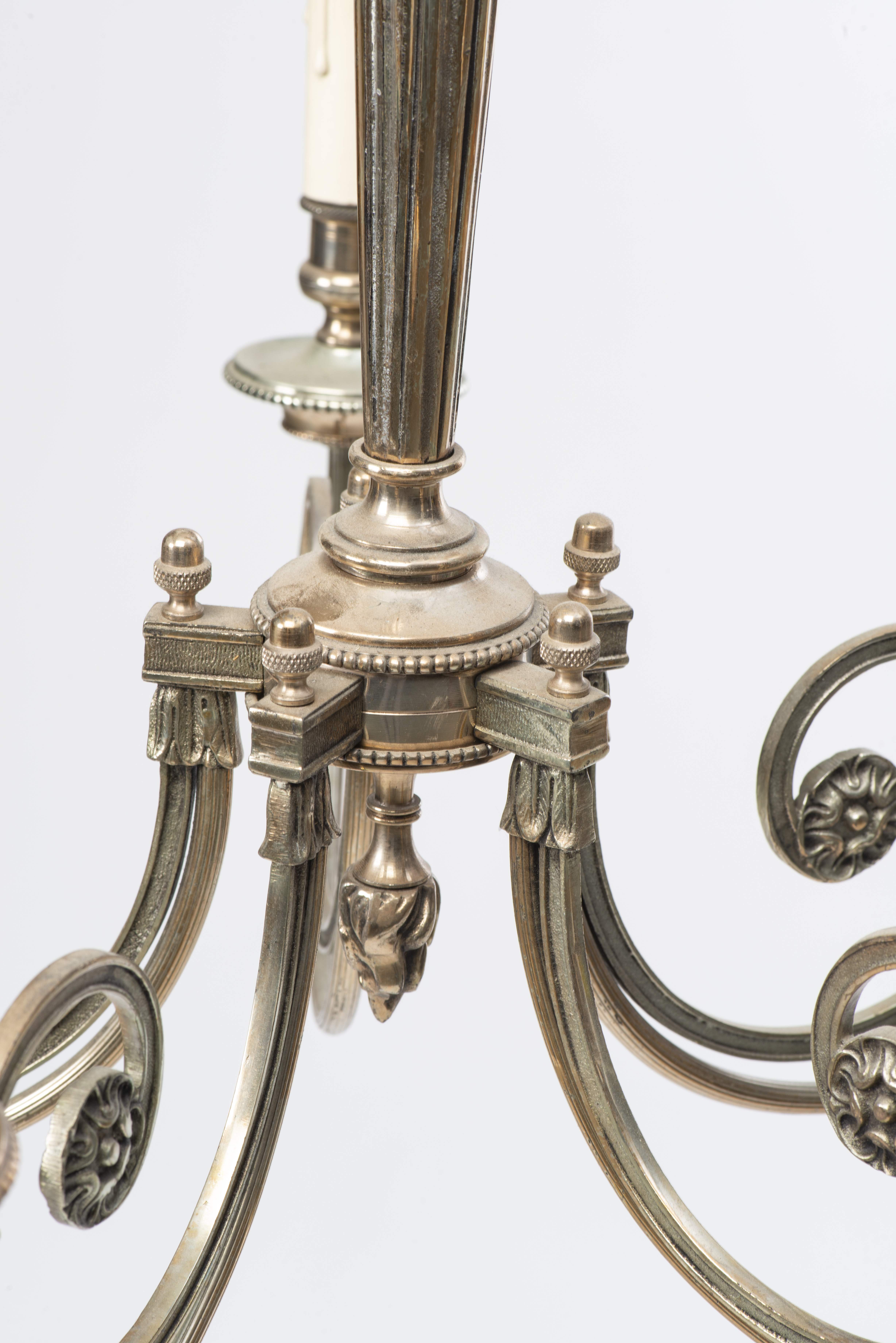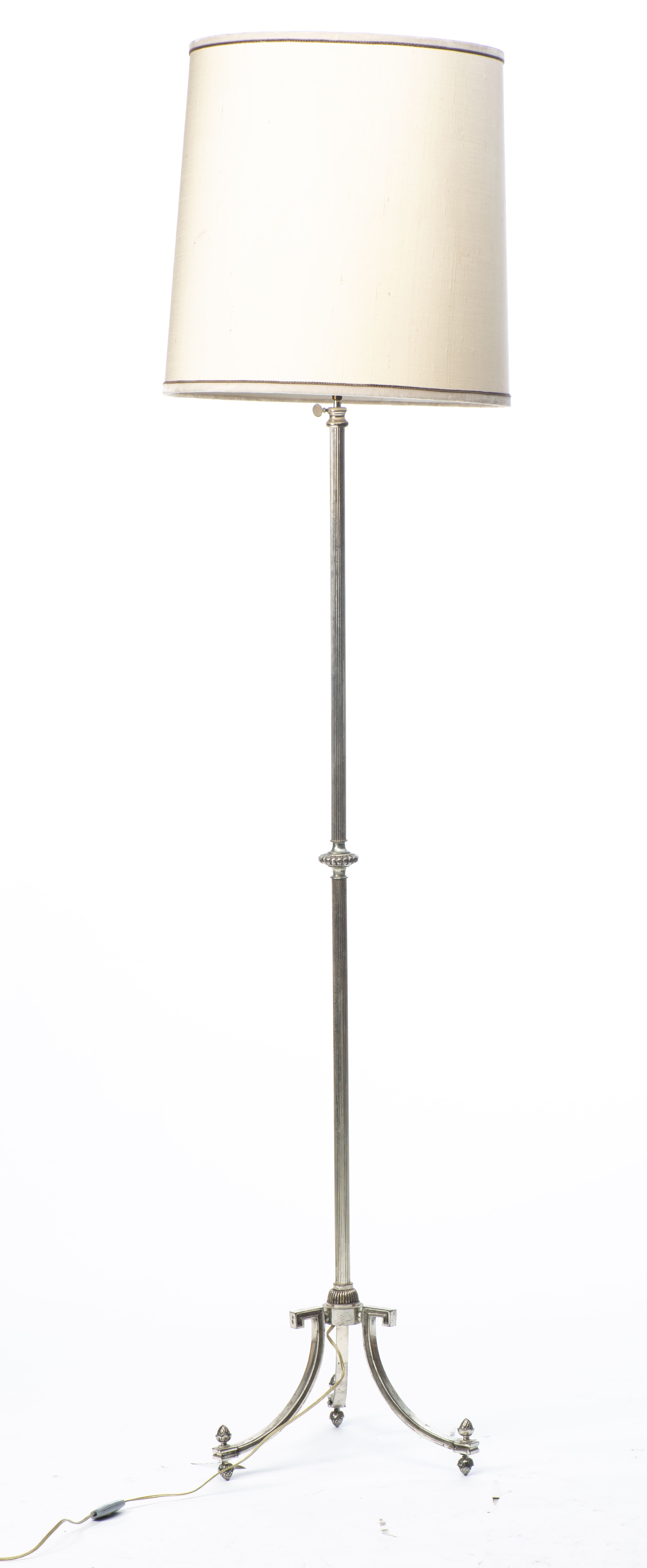Maison JANSEN (dans le goût de), Lampadaire tripode et lustre à cinq feux à patine argentée de style Louis XVI.