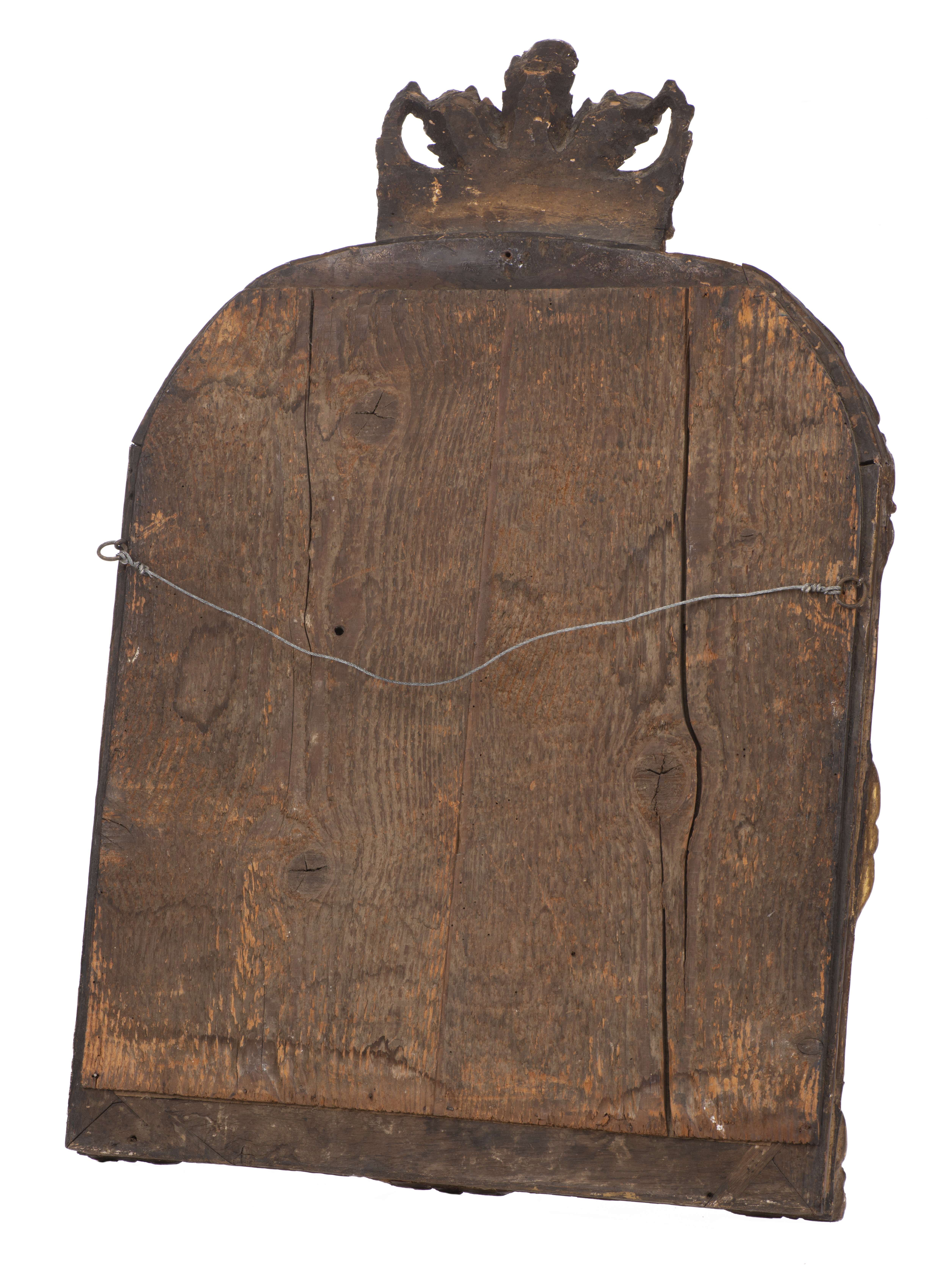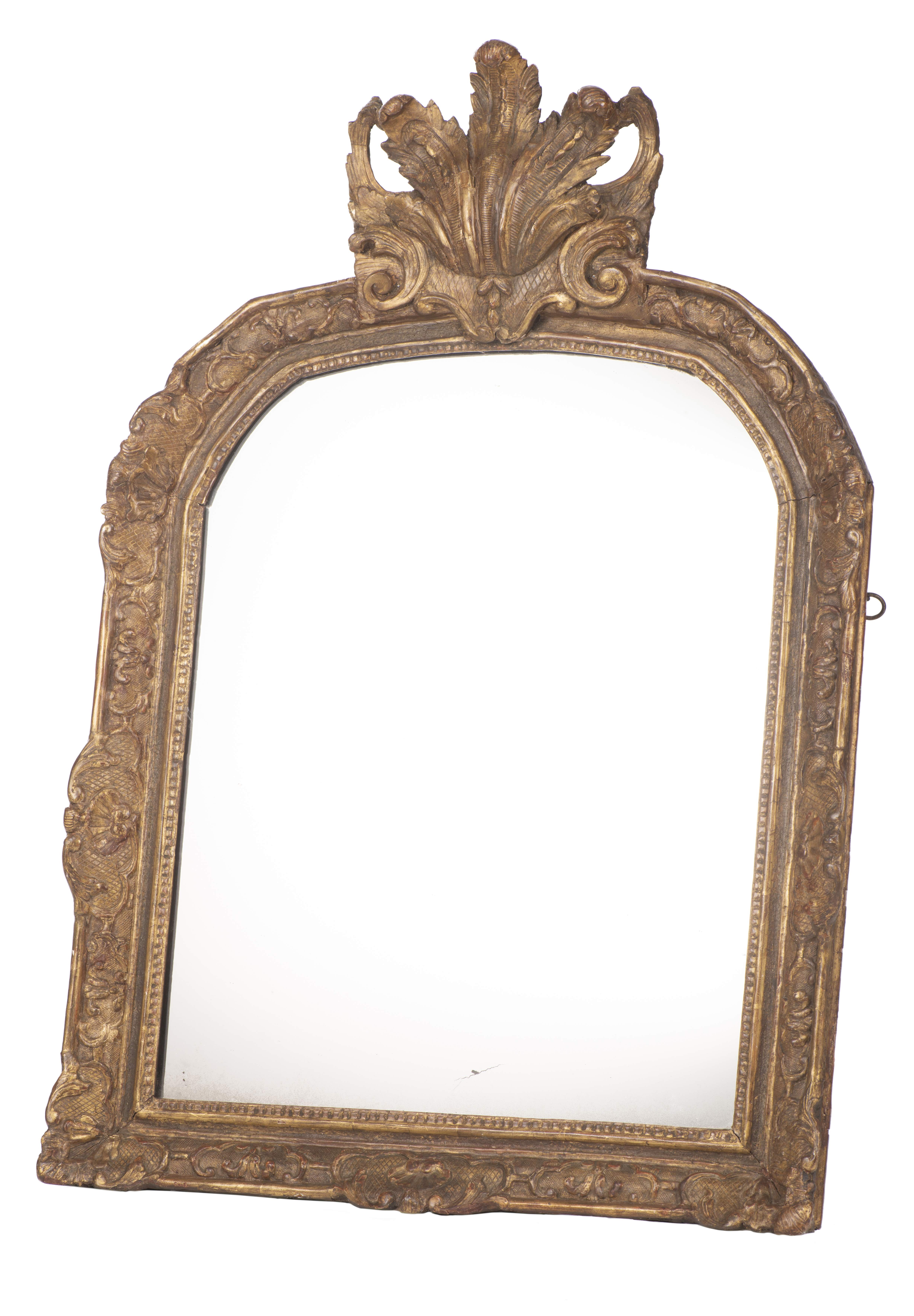 Miroir ancien en arc de cercle, glace au mercure, encadrement en bois et stuc doré de style Louis XV à la coquille, fronton en forme de panache.