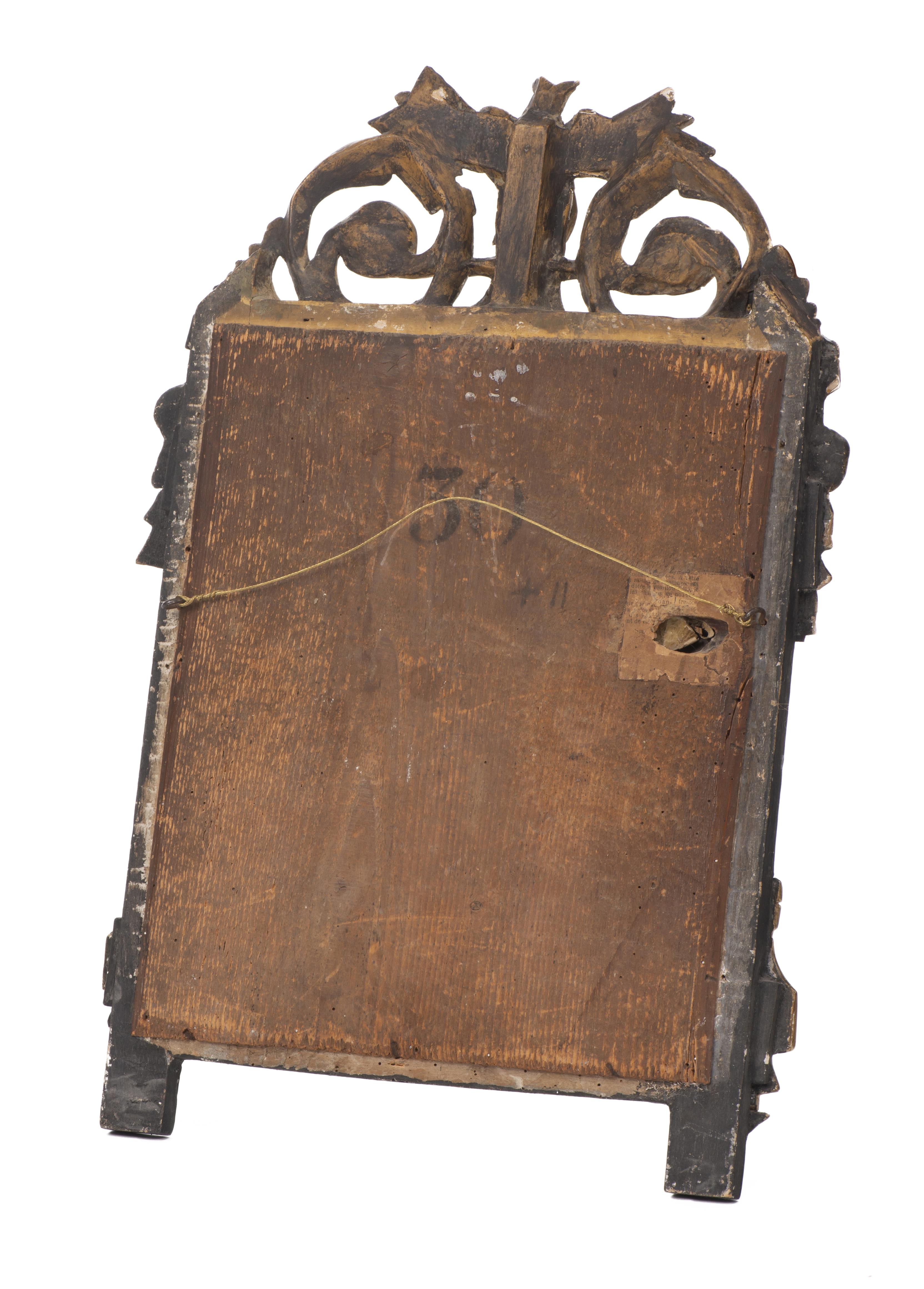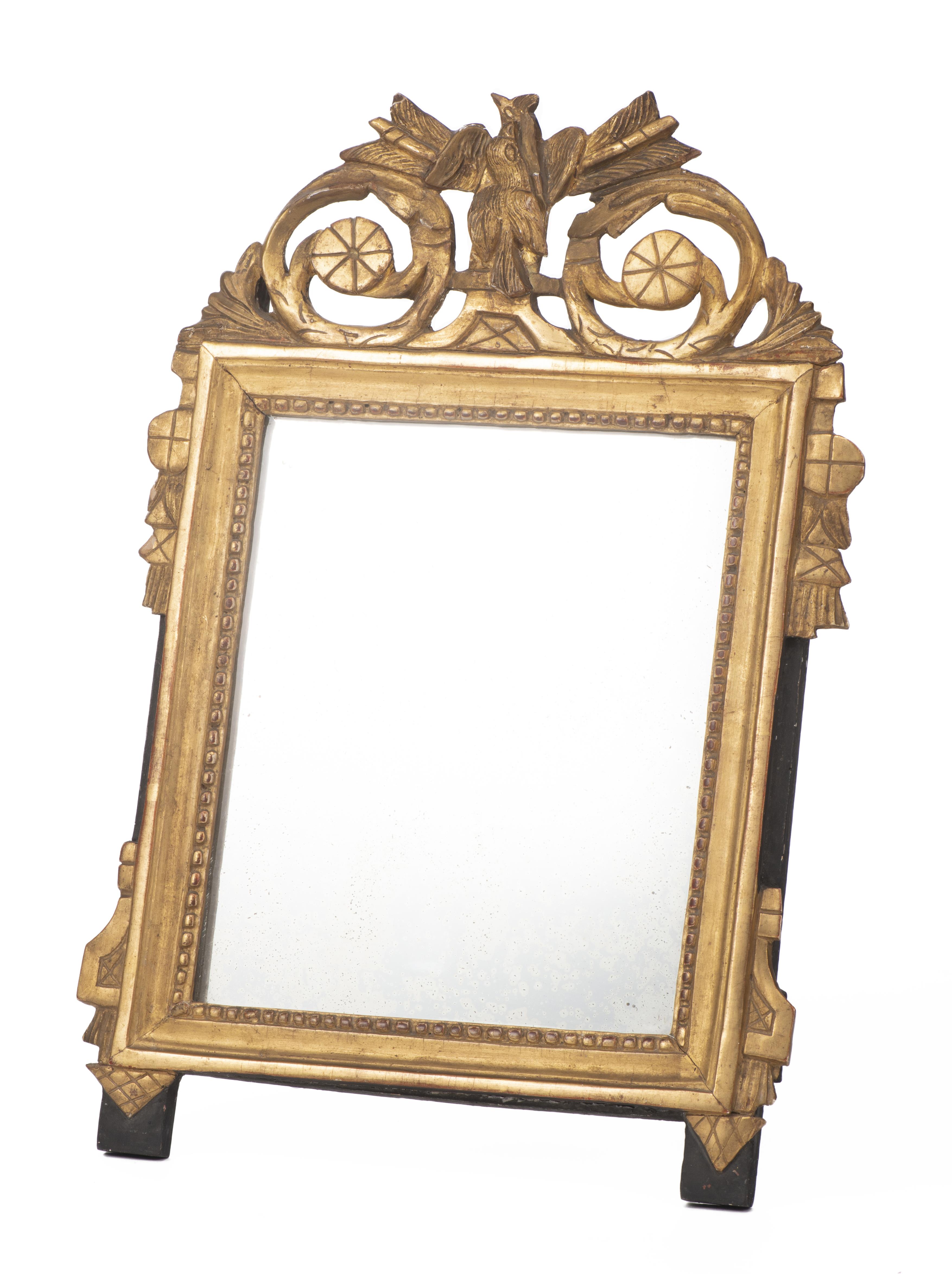 Miroir de mariage de style Louis XVI, glace au mercure, encadrement en bois et stuc doré, fronton aux flèche et à l'oiseau, côtés à pompons.