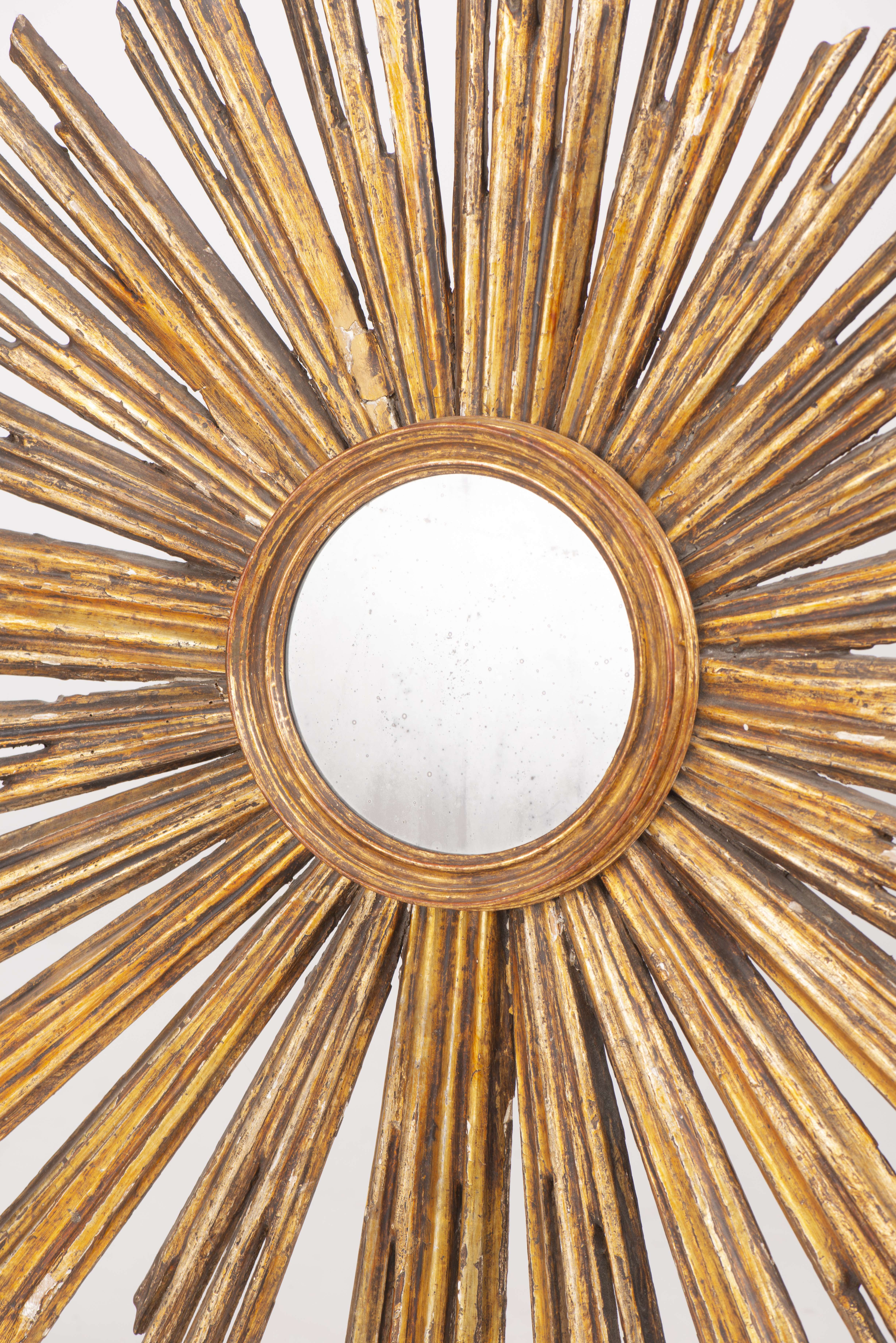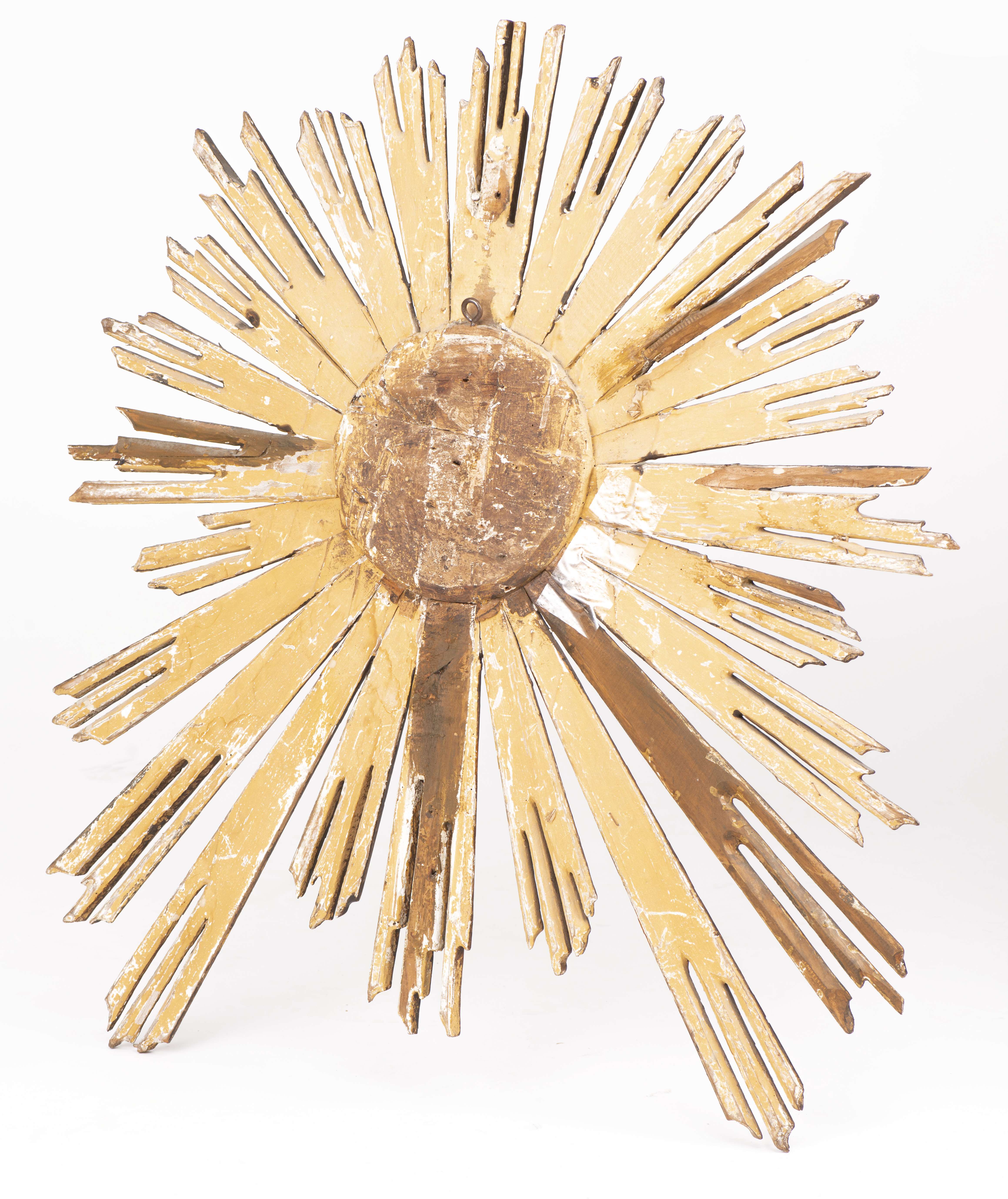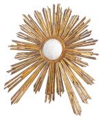 Miroir soleil à cadre rayonnant en bois doré ancien. Italie.