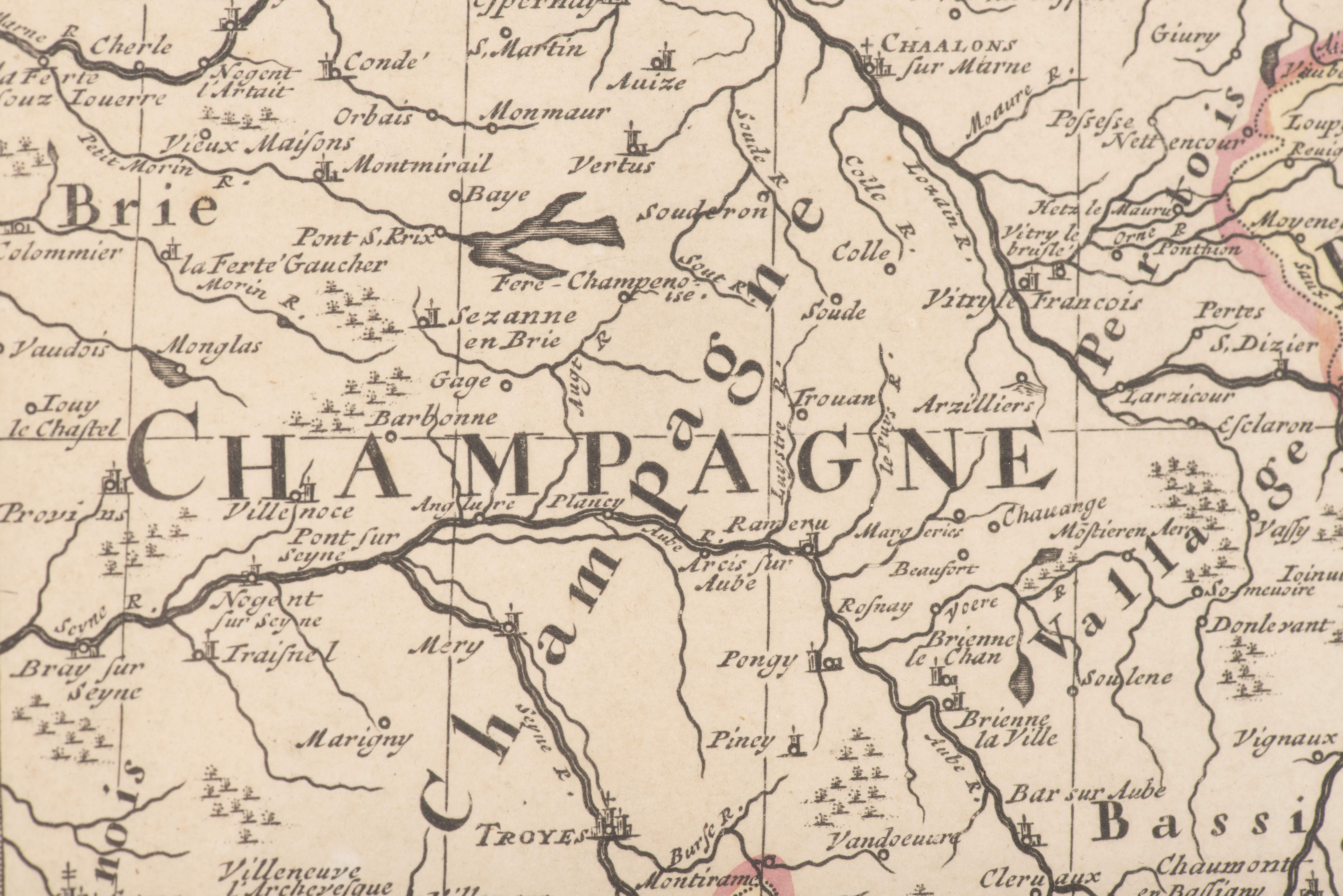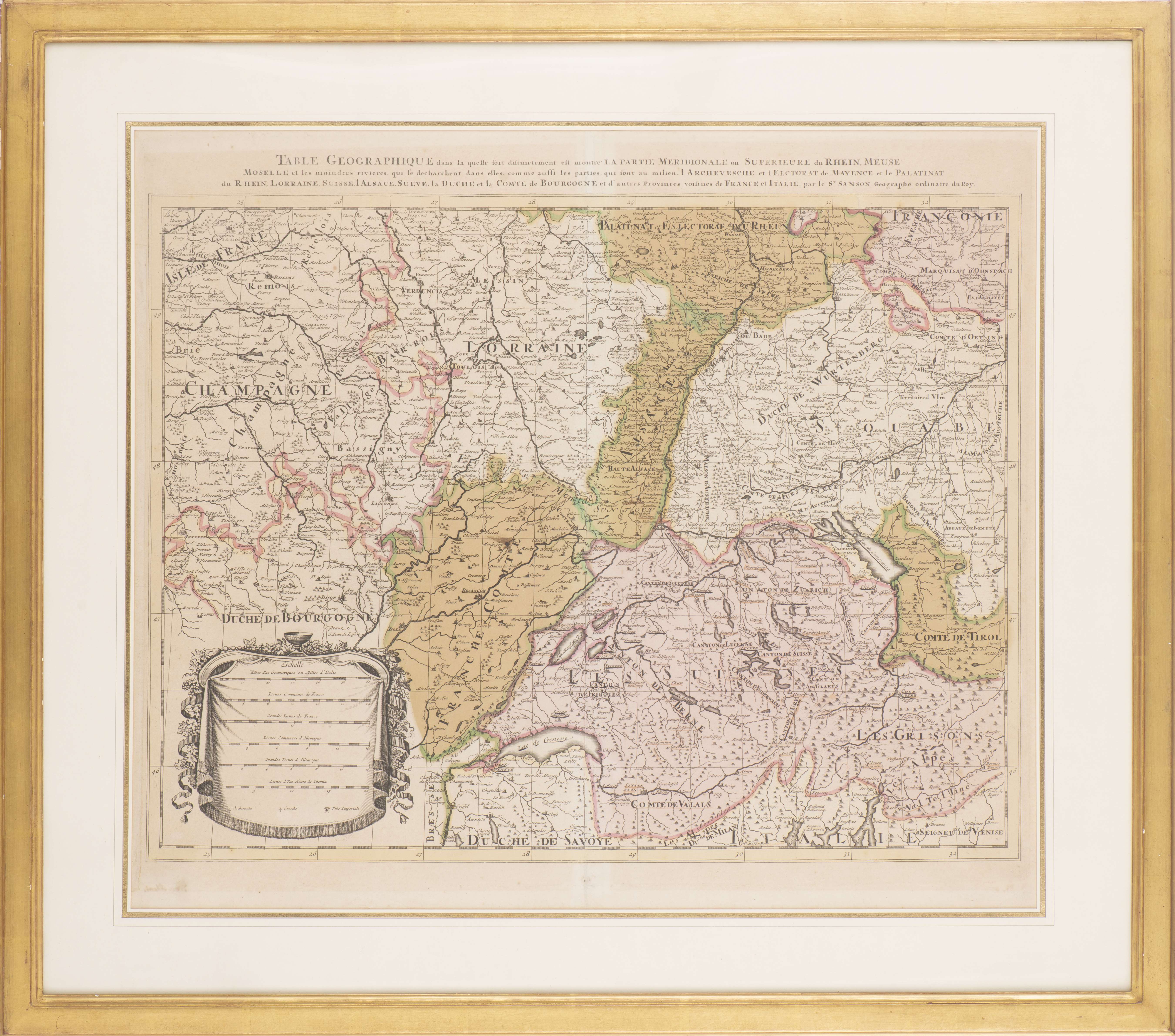 Nicolas Sanson d'Abbeville (1600-1667) "Table géographique dans la quelle fort distinctement est montré LA PARTIE MERIDIONALE ou SUPERIEURE du RHEIN, MEUSE Moselle et les moindres rivières, qui se déchargent dans elles, comme aussi les parties, qui sont au milieu, L'ARCHEVESCHE et L'ELCTORAT de MAYENCE et le PALATINAT du RHEIN, LORRAINE, SUISSE. L'ALSACE. SUEVE, la DUCHé et la COMTE de BOURGOGNE, et d'autres provinces, voisines de France et d'Italie, par le Sr SANSON Géographe ordinaire du Roy." Gravure rehaussée à la couleur non datée et ns.