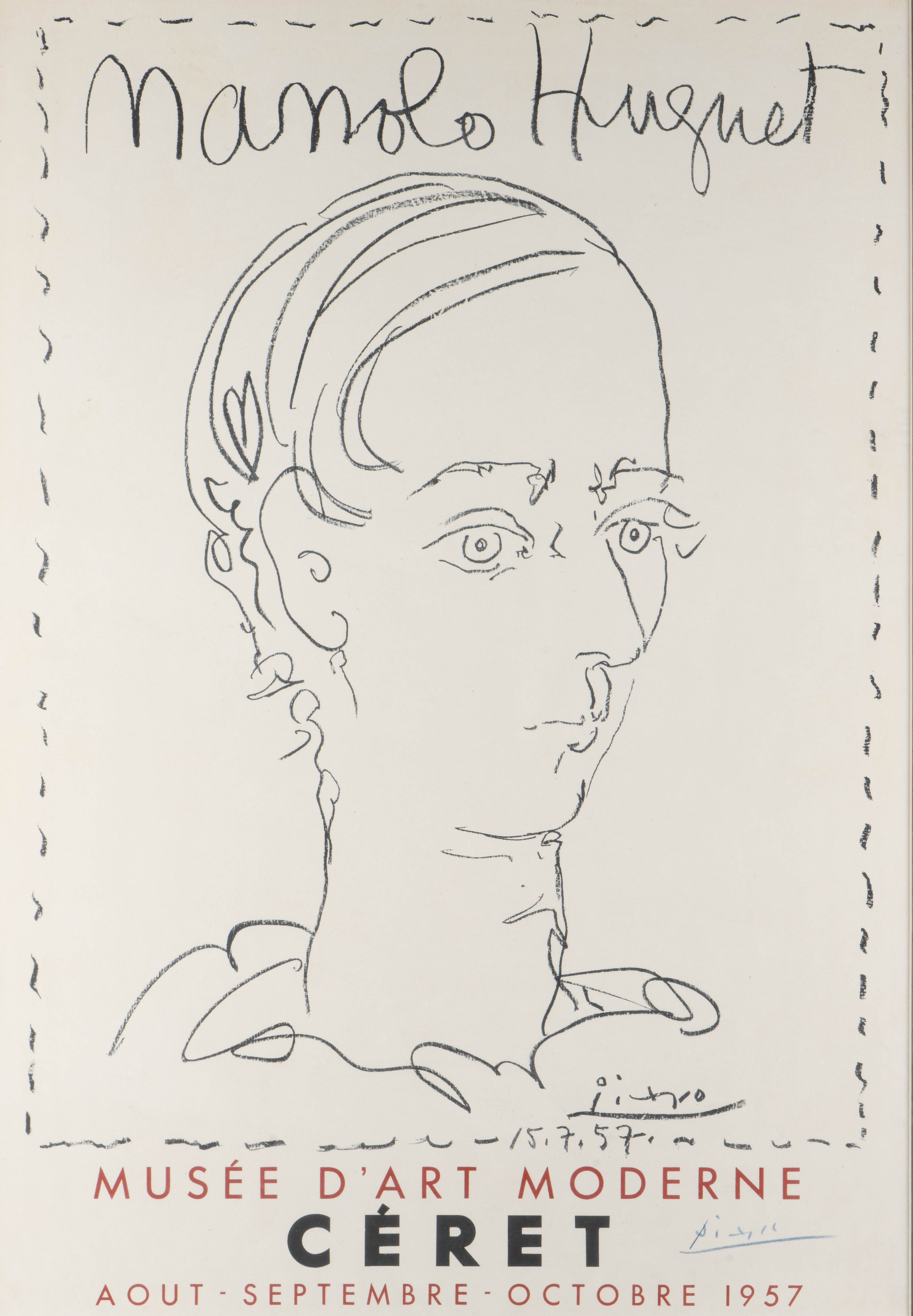 Pablo PICASSO (1881-1973) "Manolo Huguet", affiche lithographique en deux couleurs pour une exposition au Musée d'art moderne de Céret (août-septembre-octobre) (1957) Imp. Mourlot, datée et signée dans la planche 15.7.57 en bas à droite et contresignée au crayon bleu en bas à droite.