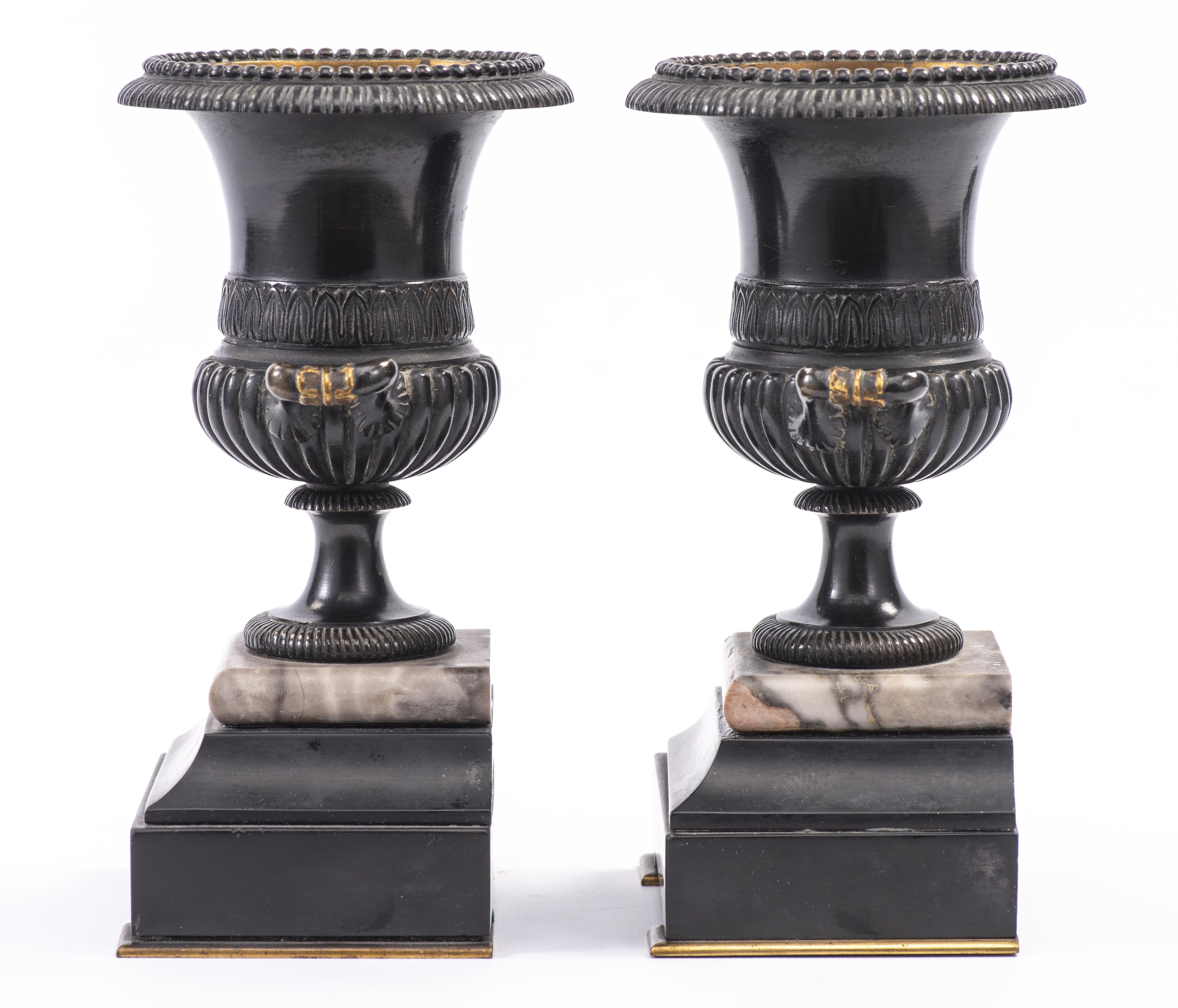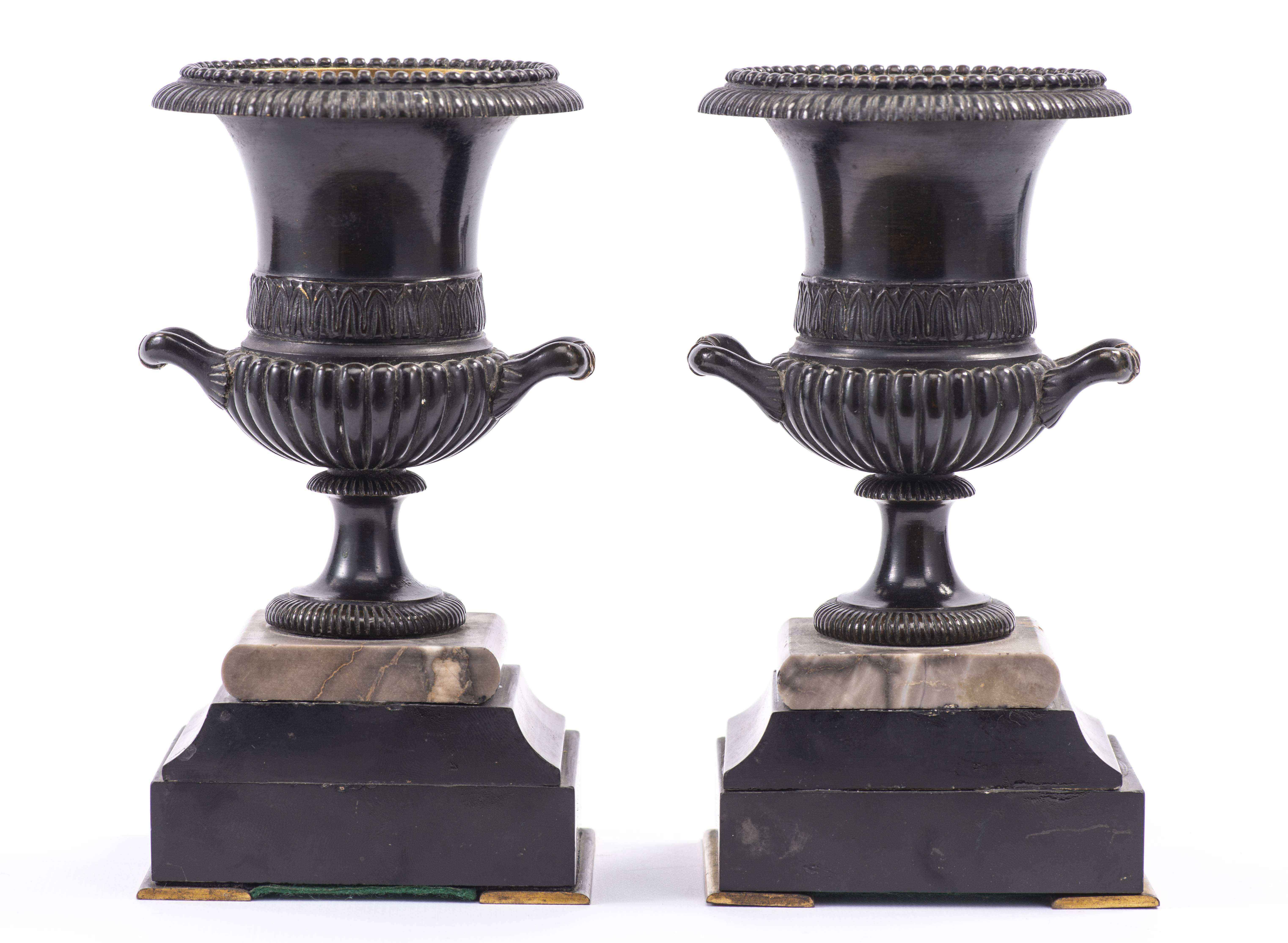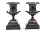 Paire d'urnes en bronze à patine noire sur socle en marbre
