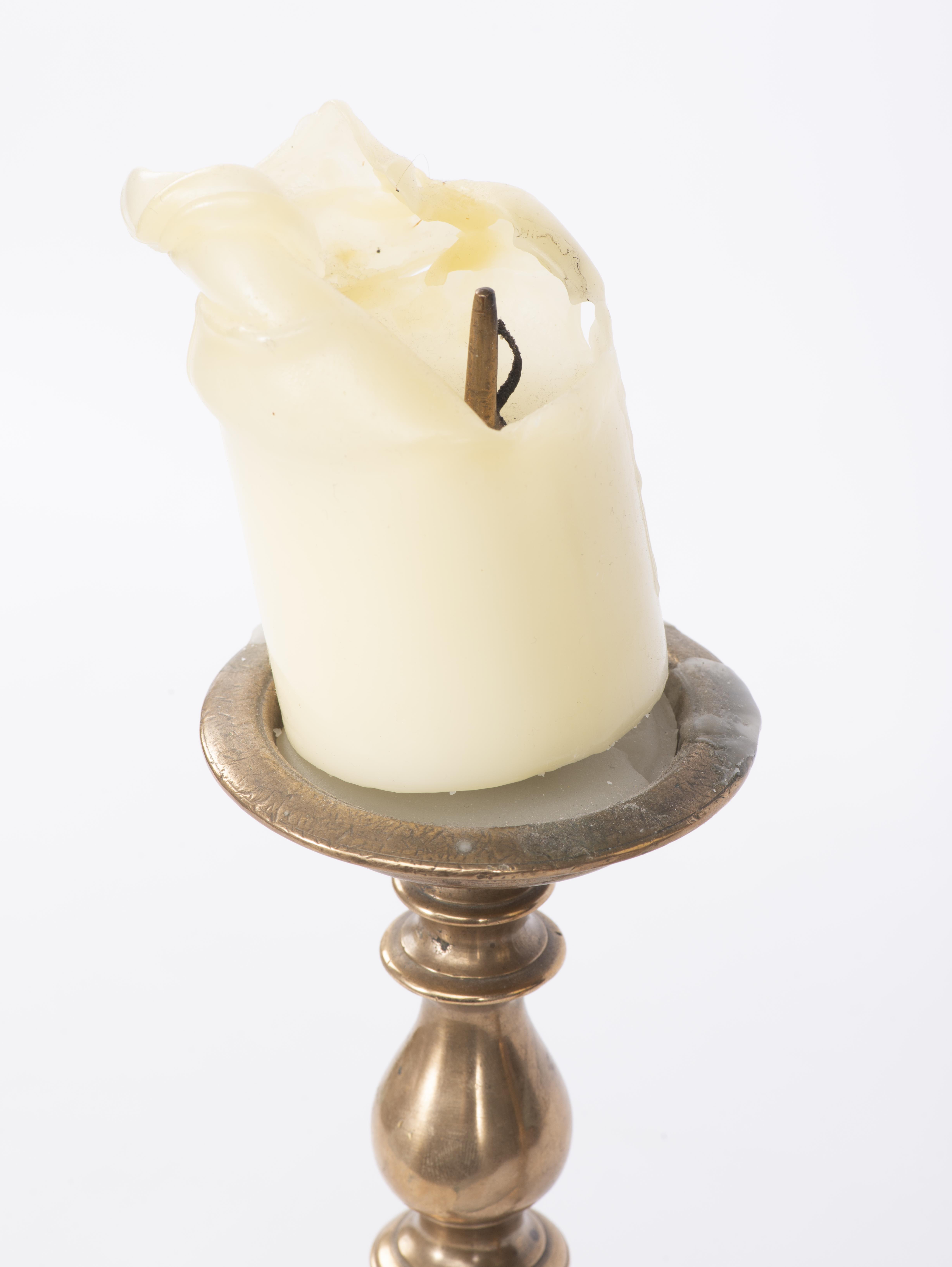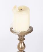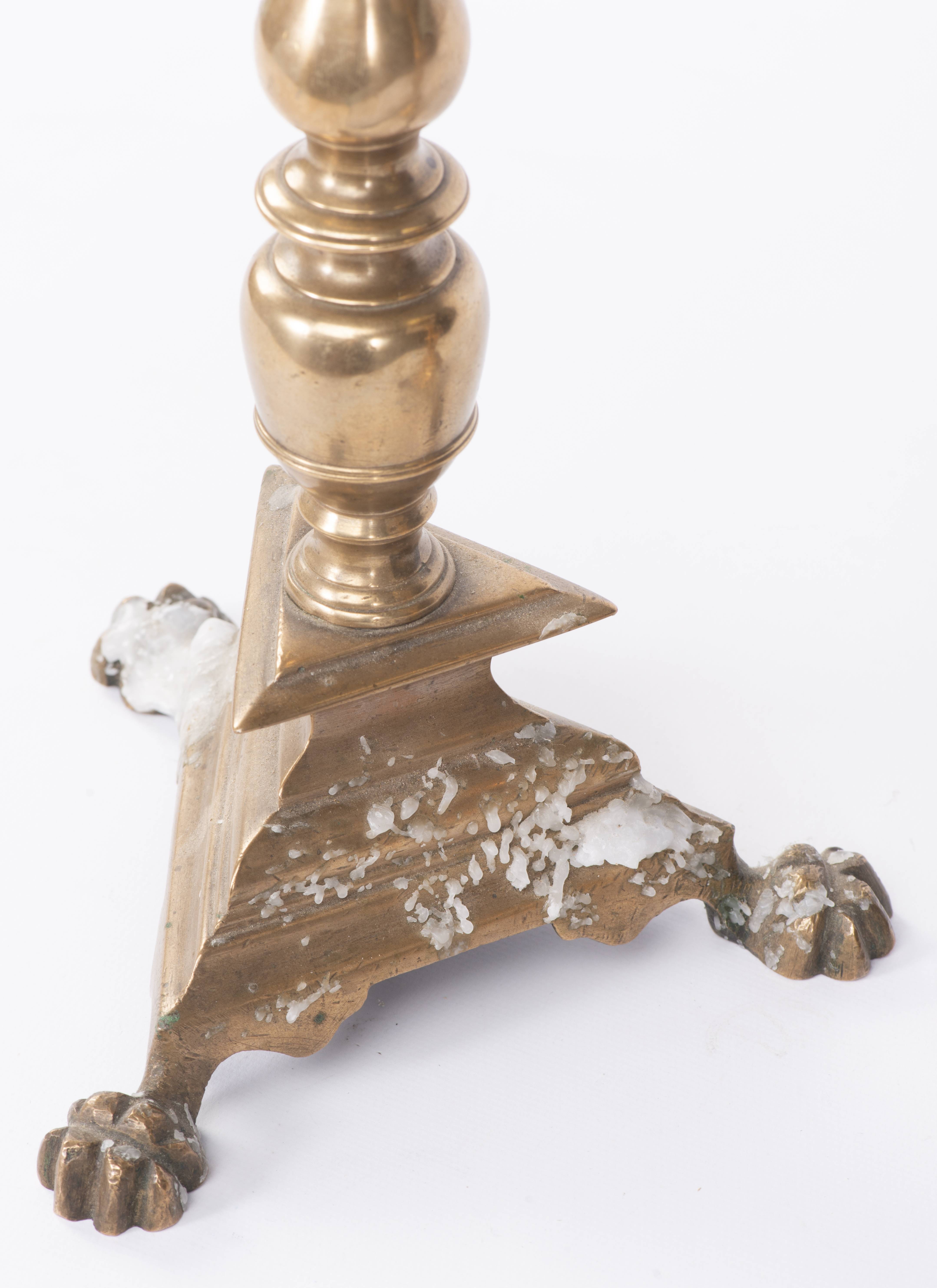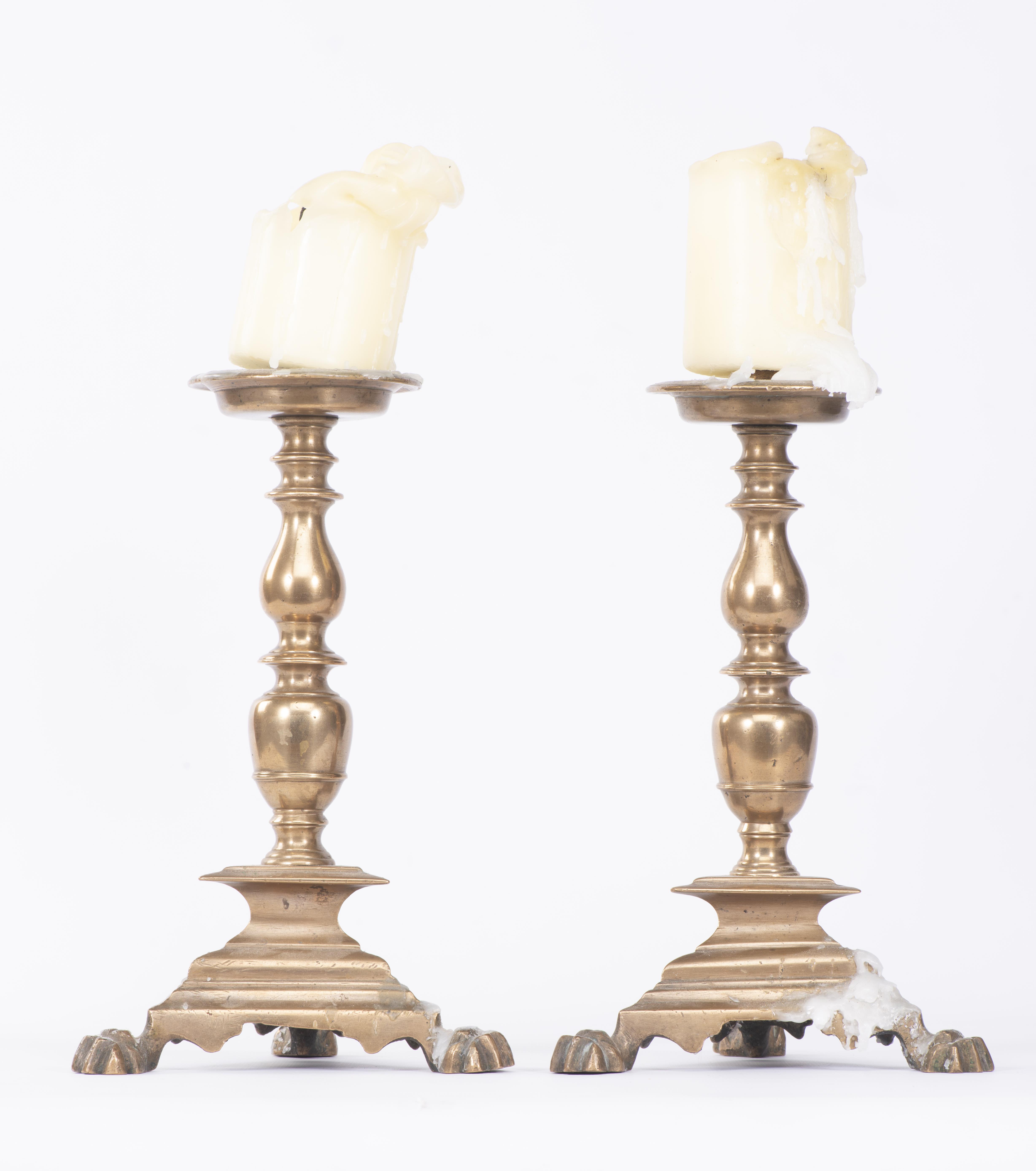 Paire de bougeoirs, Haute époque en bronze doré reposant sur trois pieds griffes.