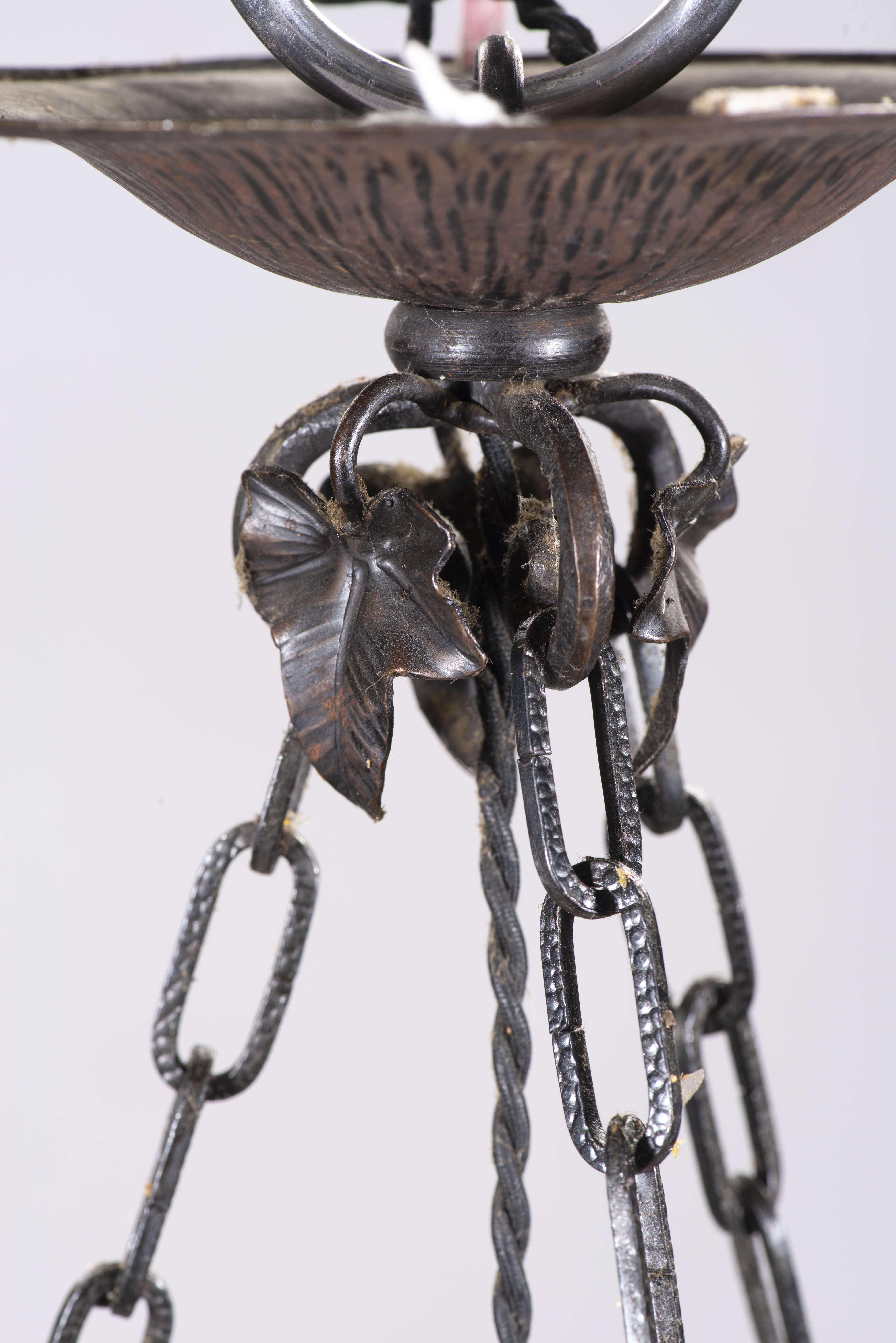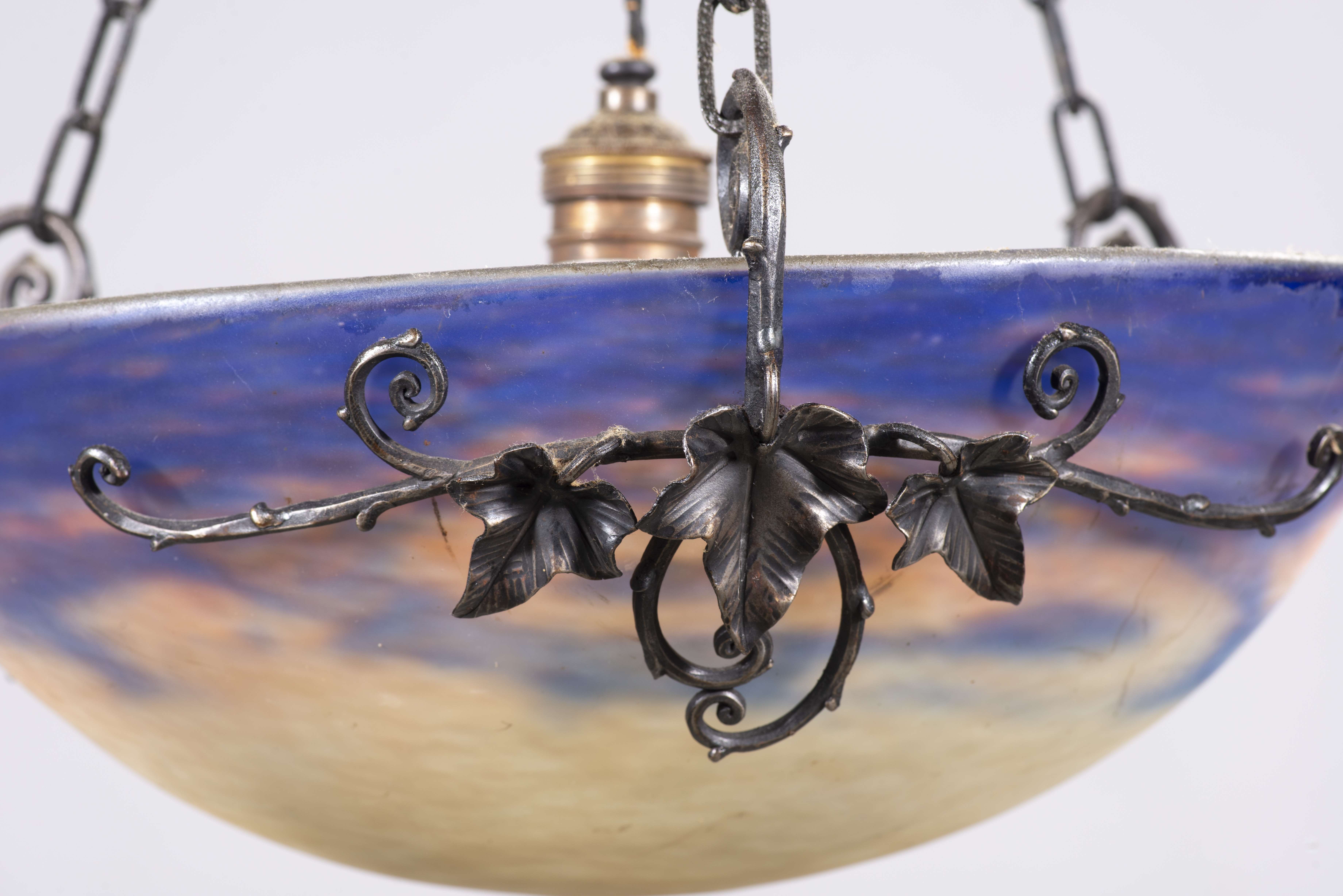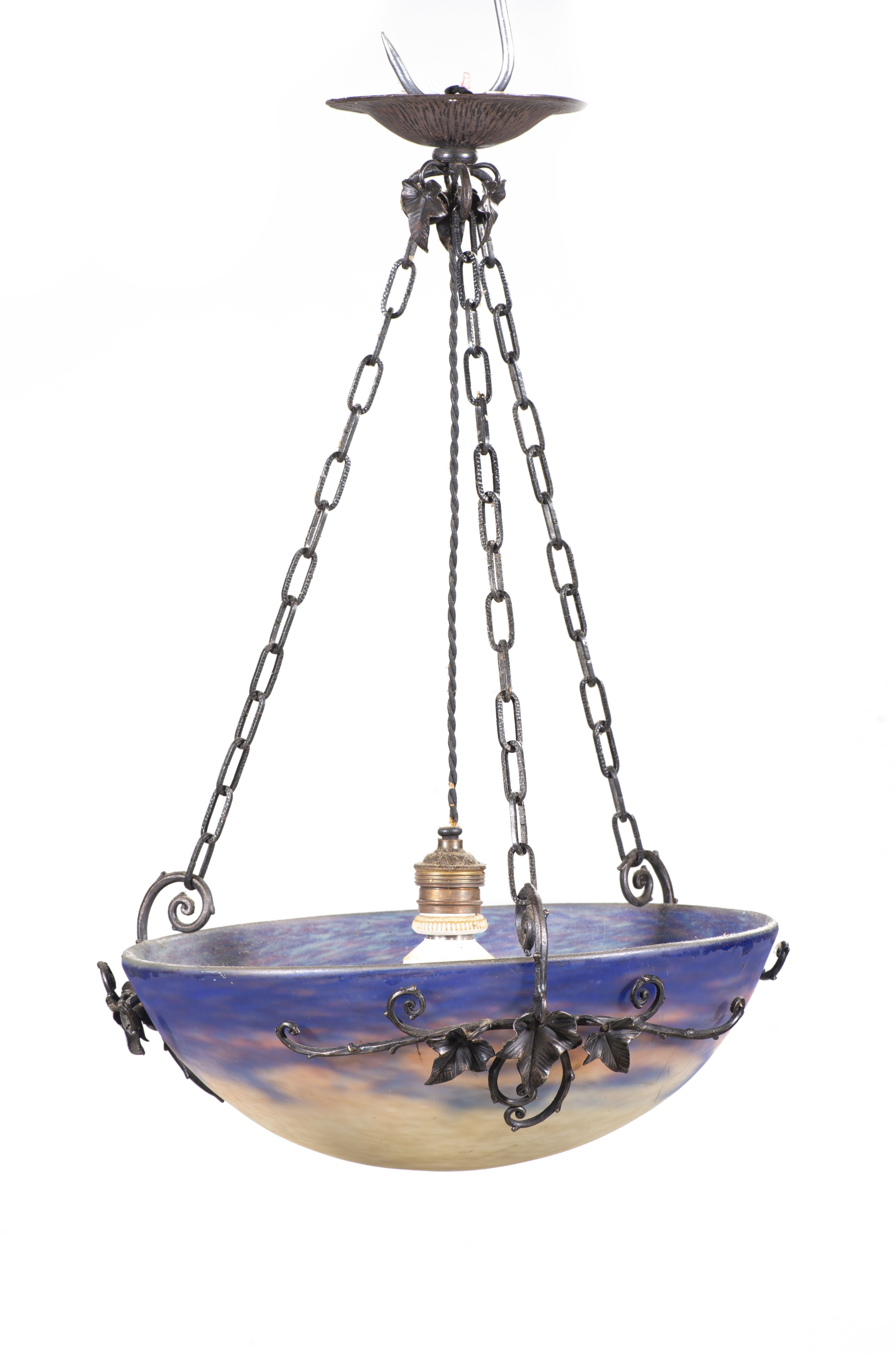 Plafonnier Art déco par Muller Frères Lunéville avec armature en fer forgé noir à décor de feuilles (vers 1920) Le verre est signé Muller Frères.