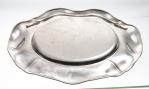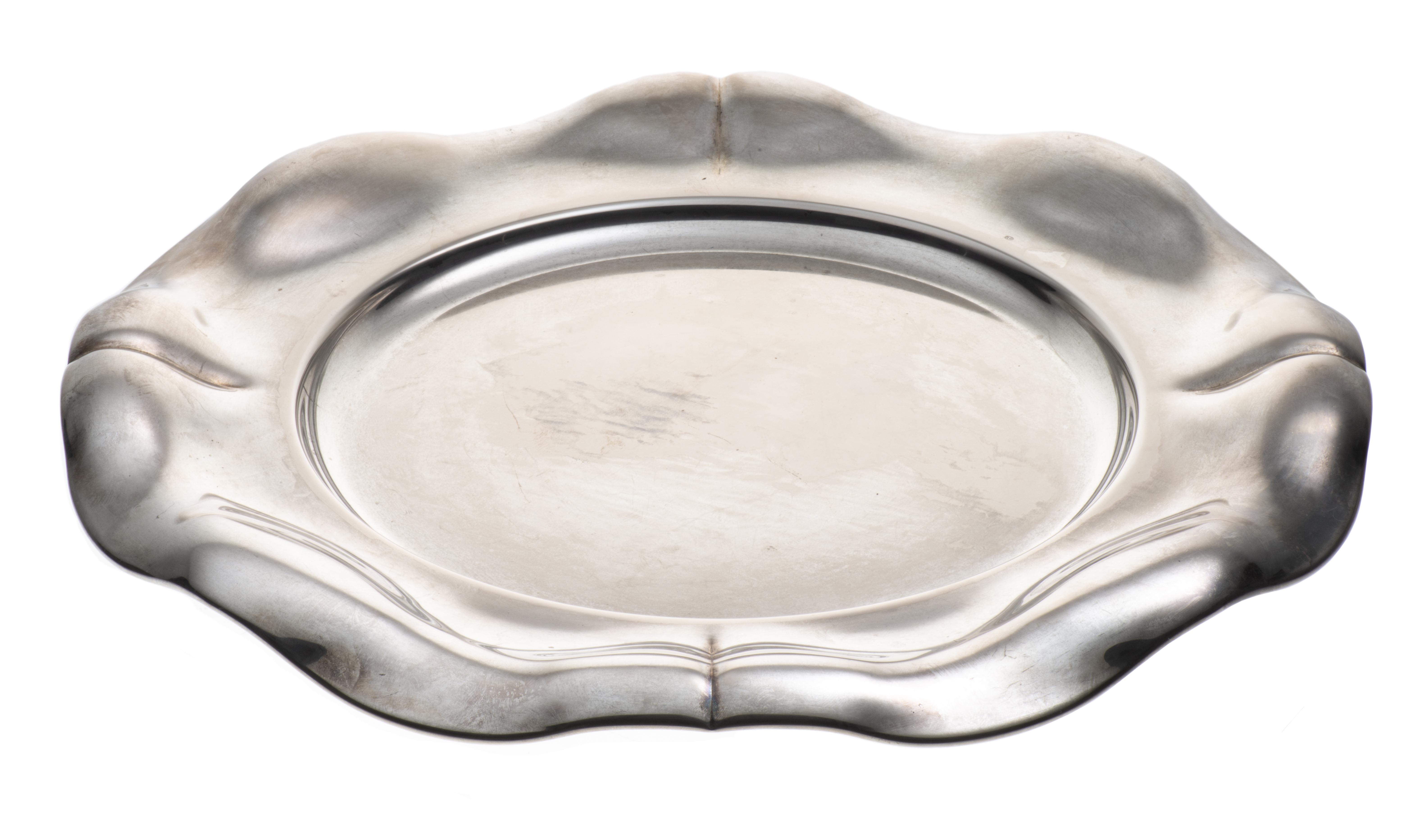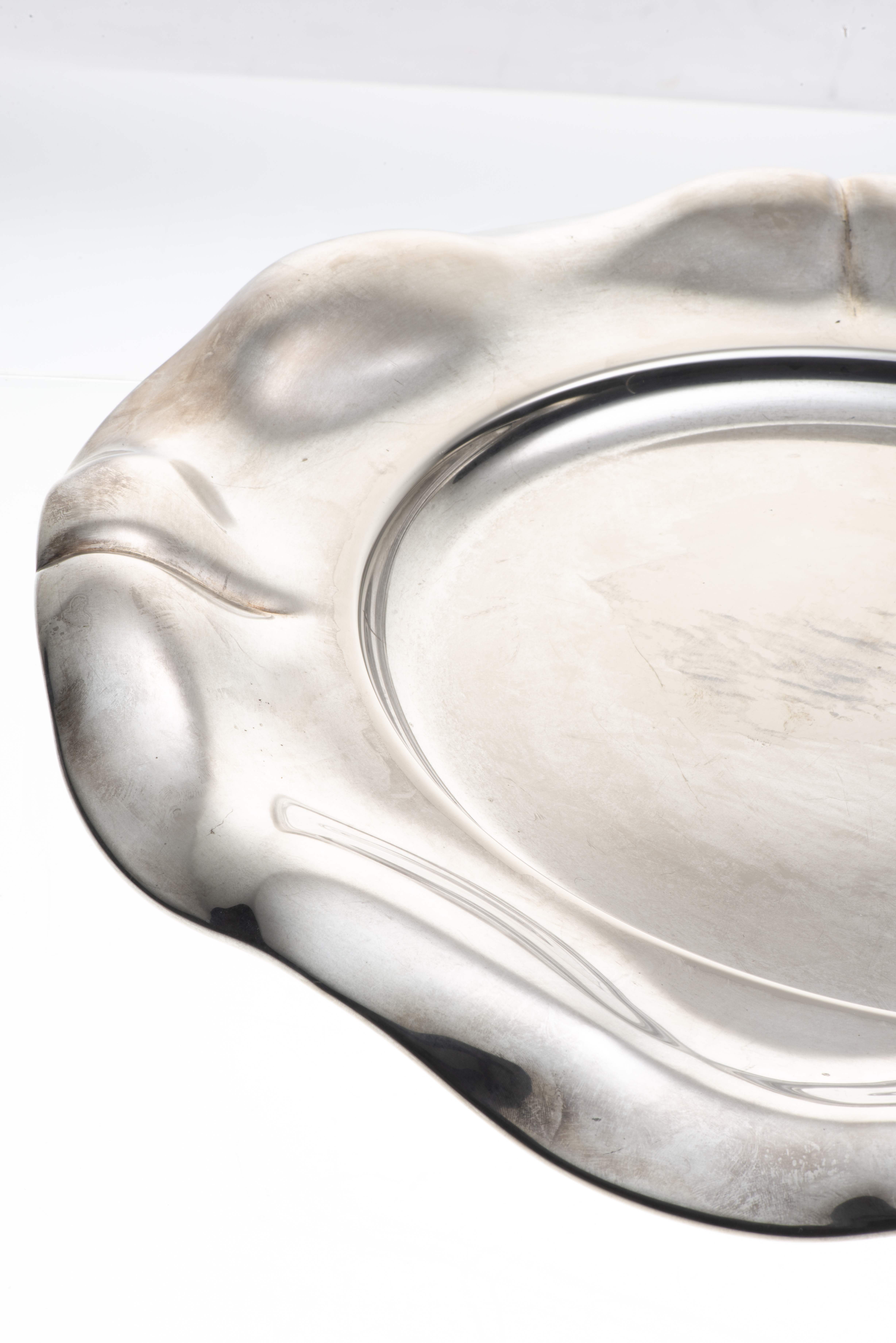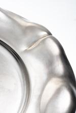 Plateau rond en métal argenté par OLRI à à bordure mouvementée.