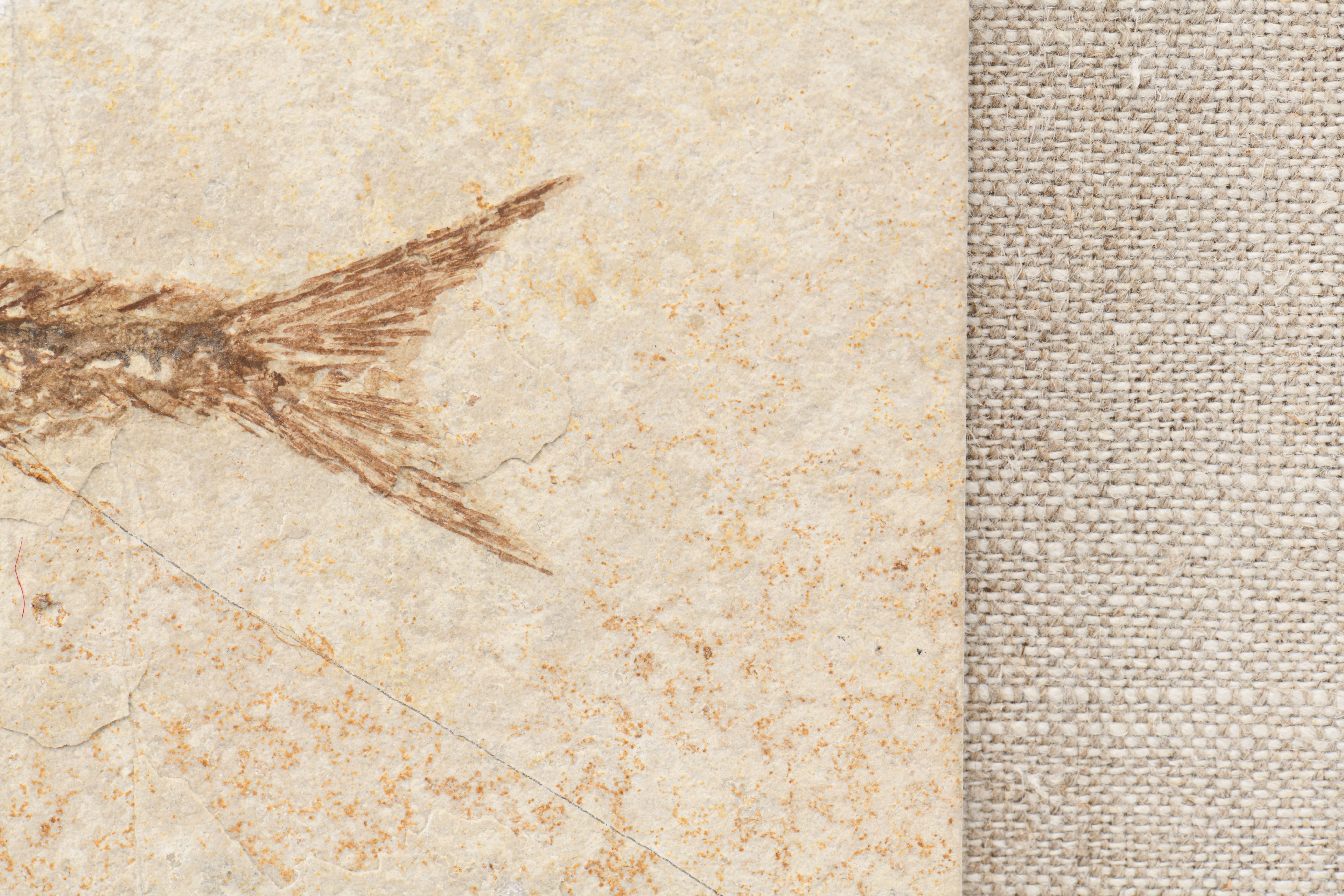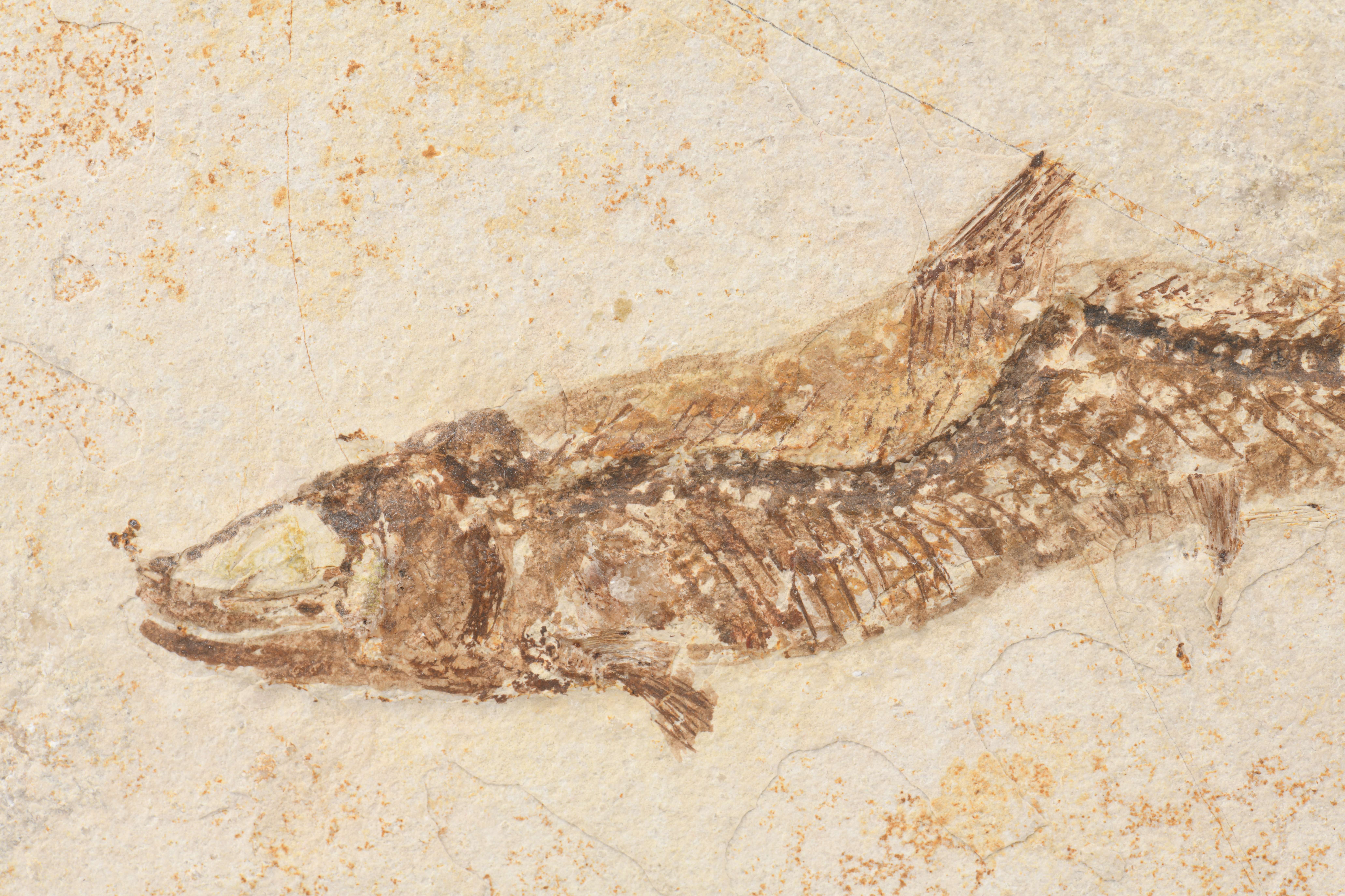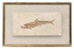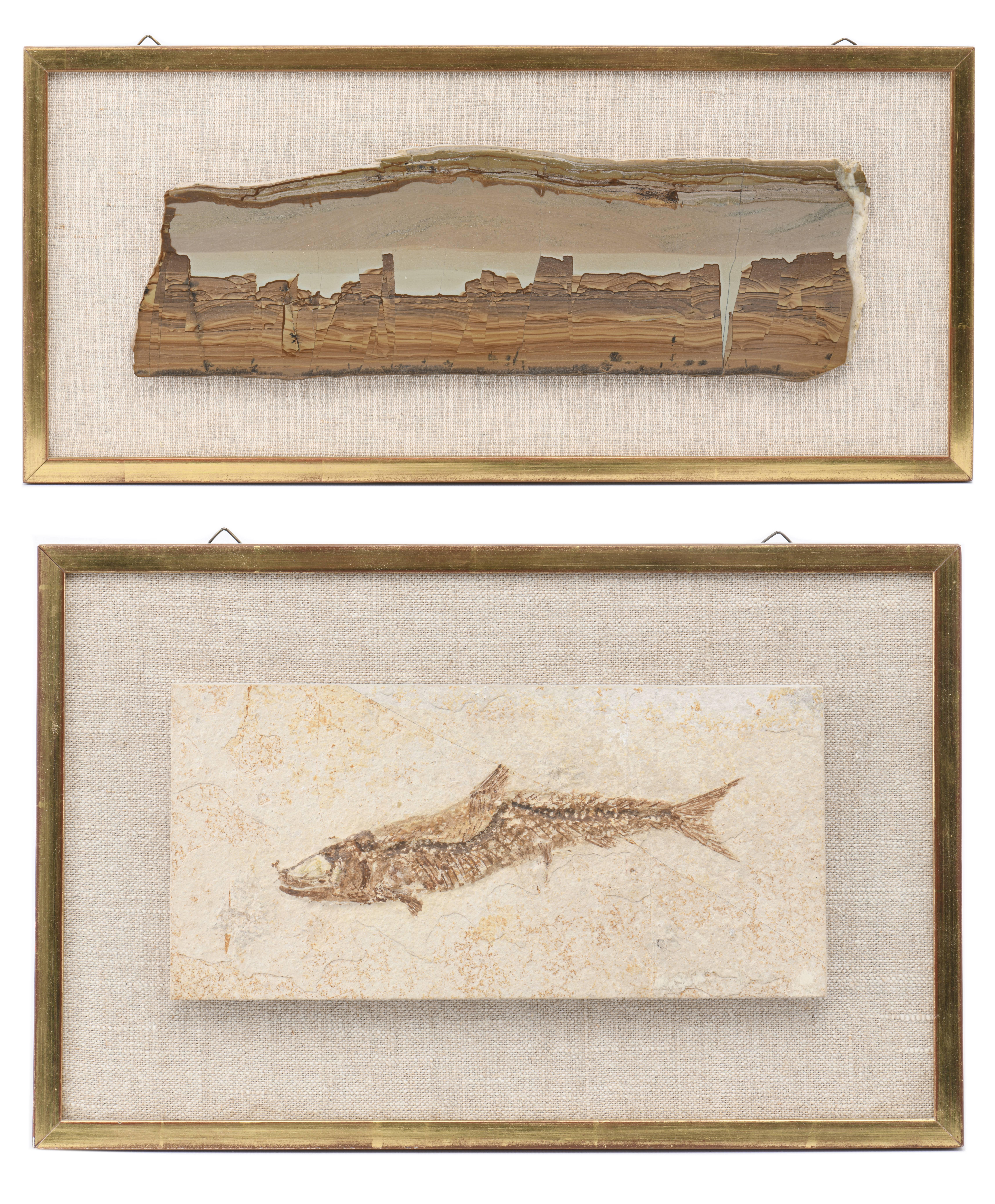 Ensemble de deux encadrés, l'un d'un fossile de poisson. L'autre d'un bois fossilisé représentant un personnage.