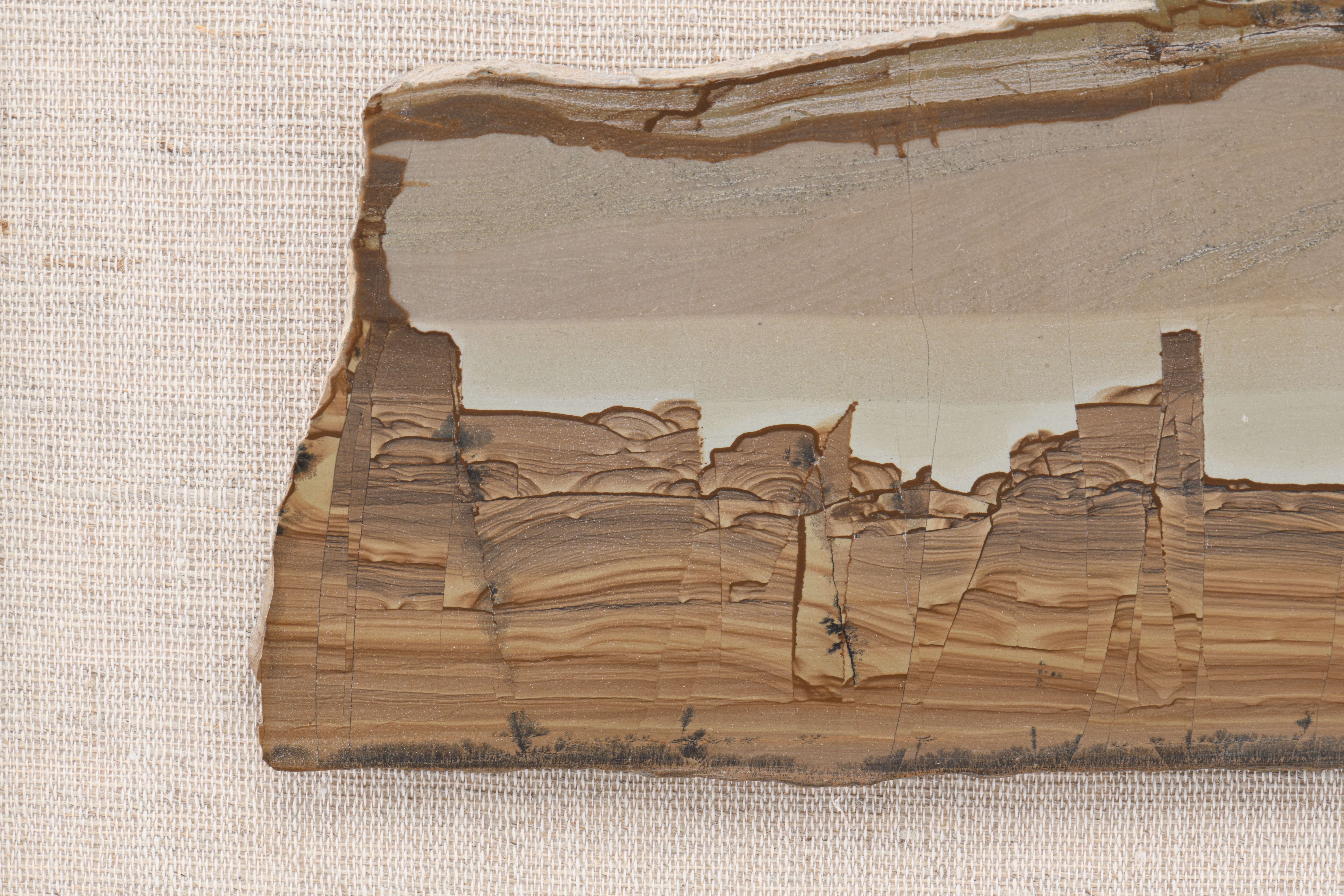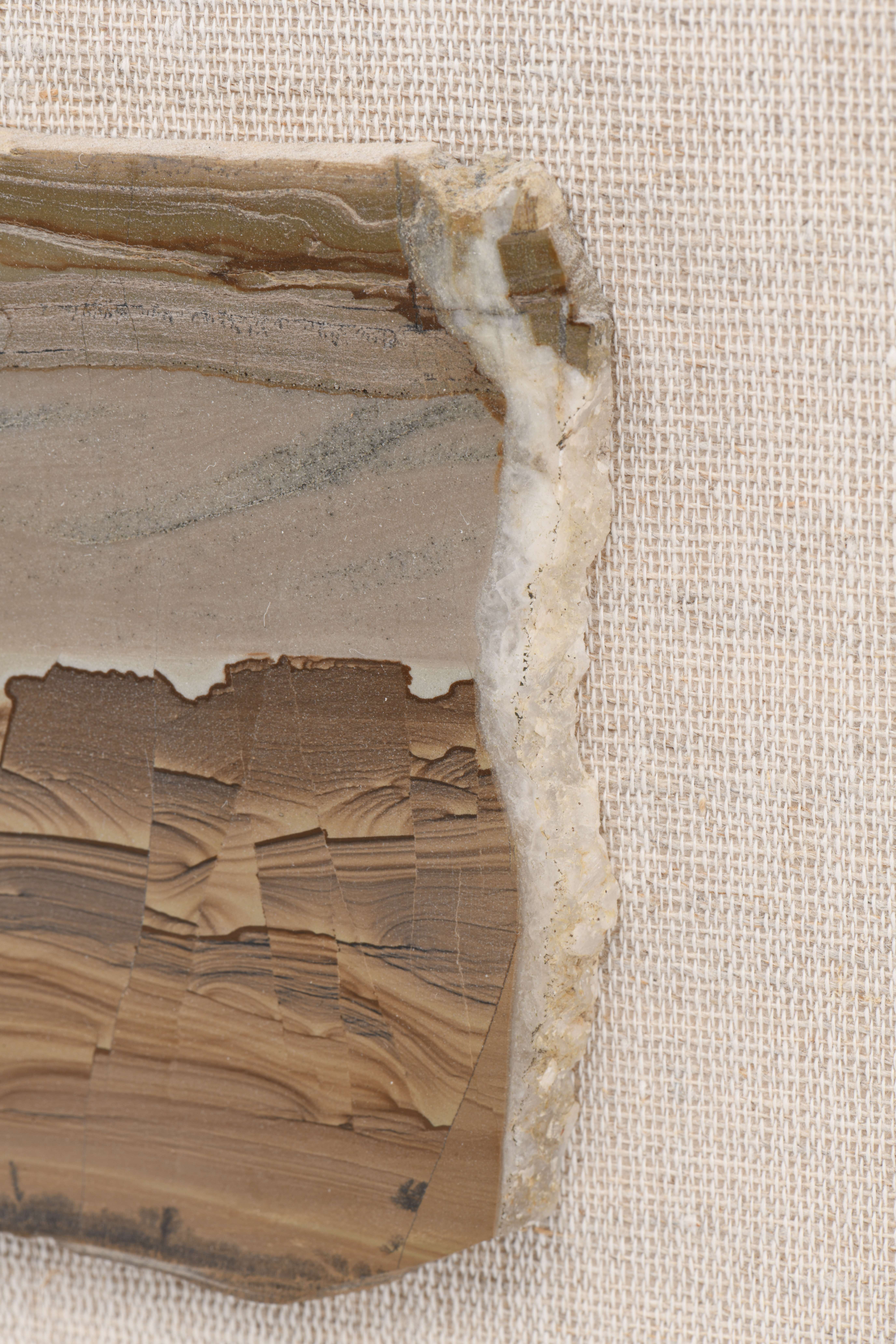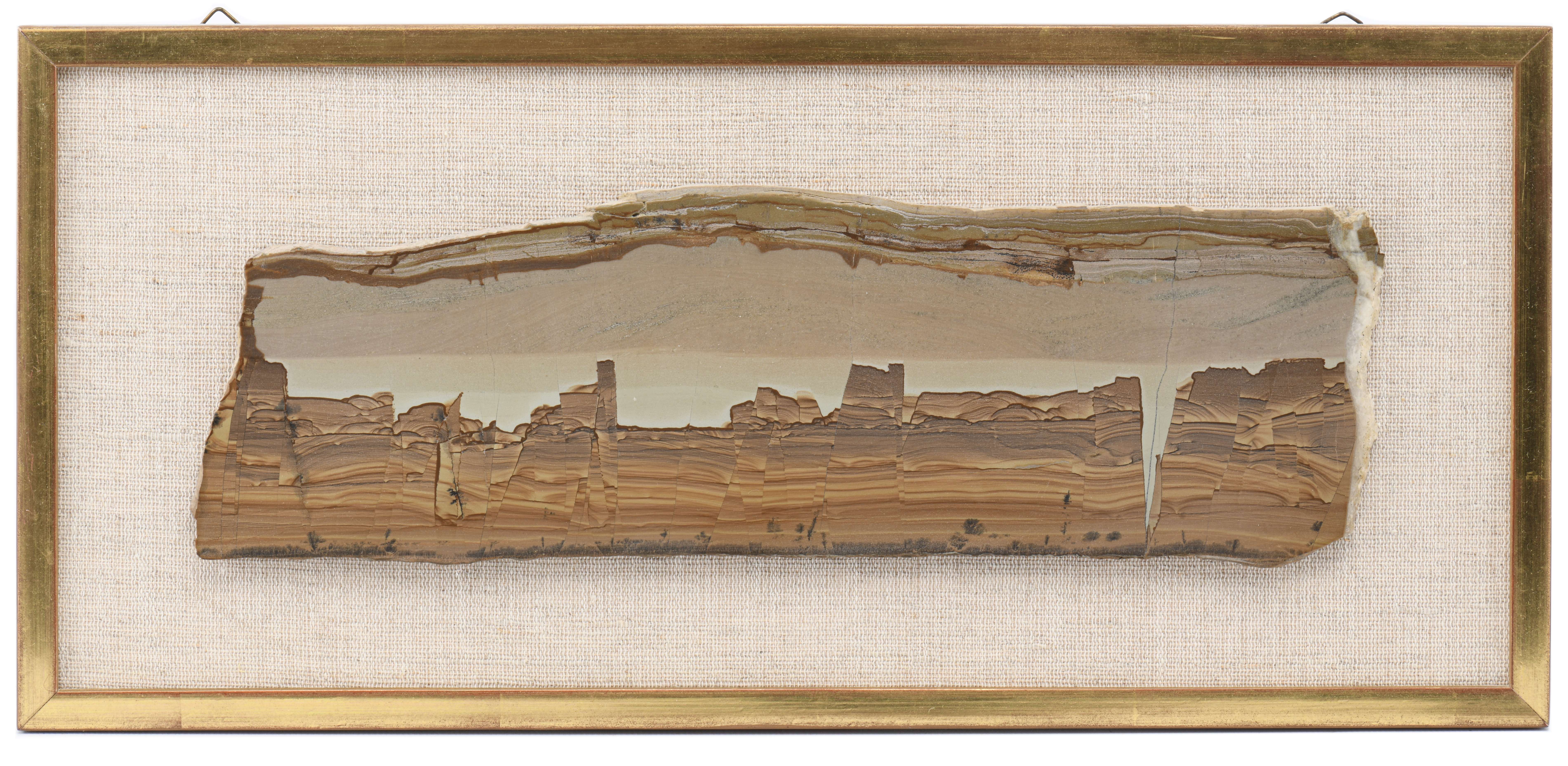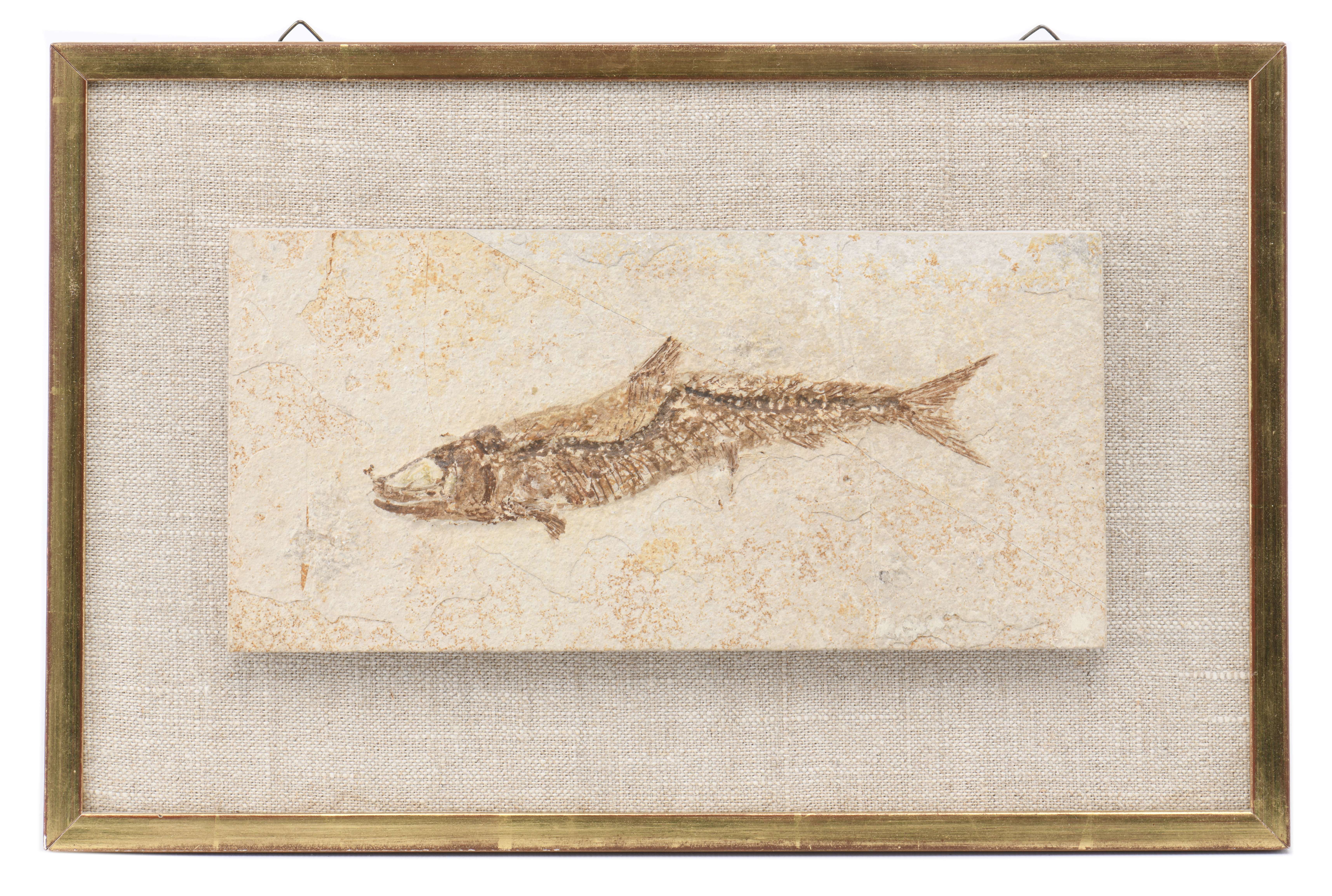 Ensemble de deux encadrés, l'un d'un fossile de poisson. L'autre d'un bois fossilisé représentant un personnage.