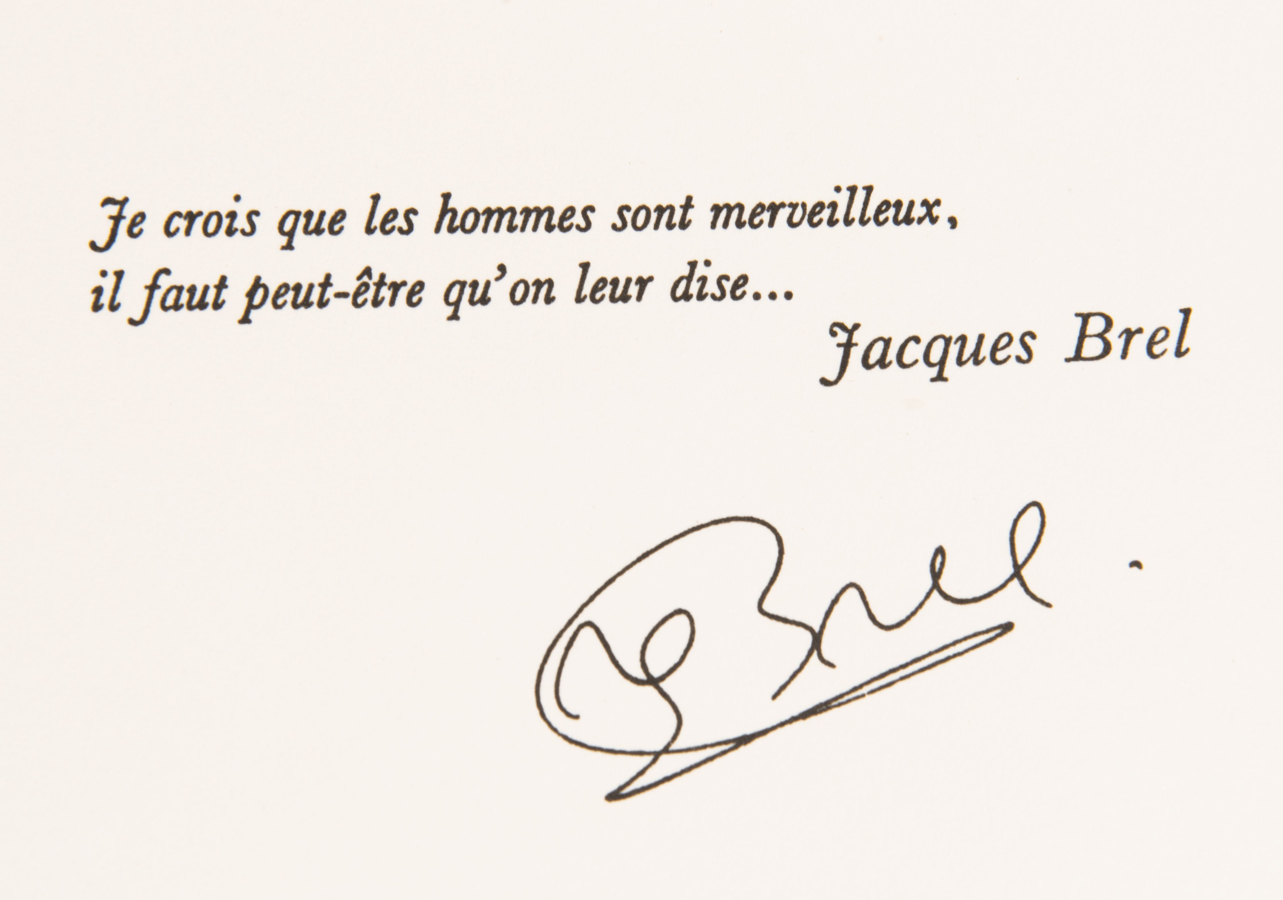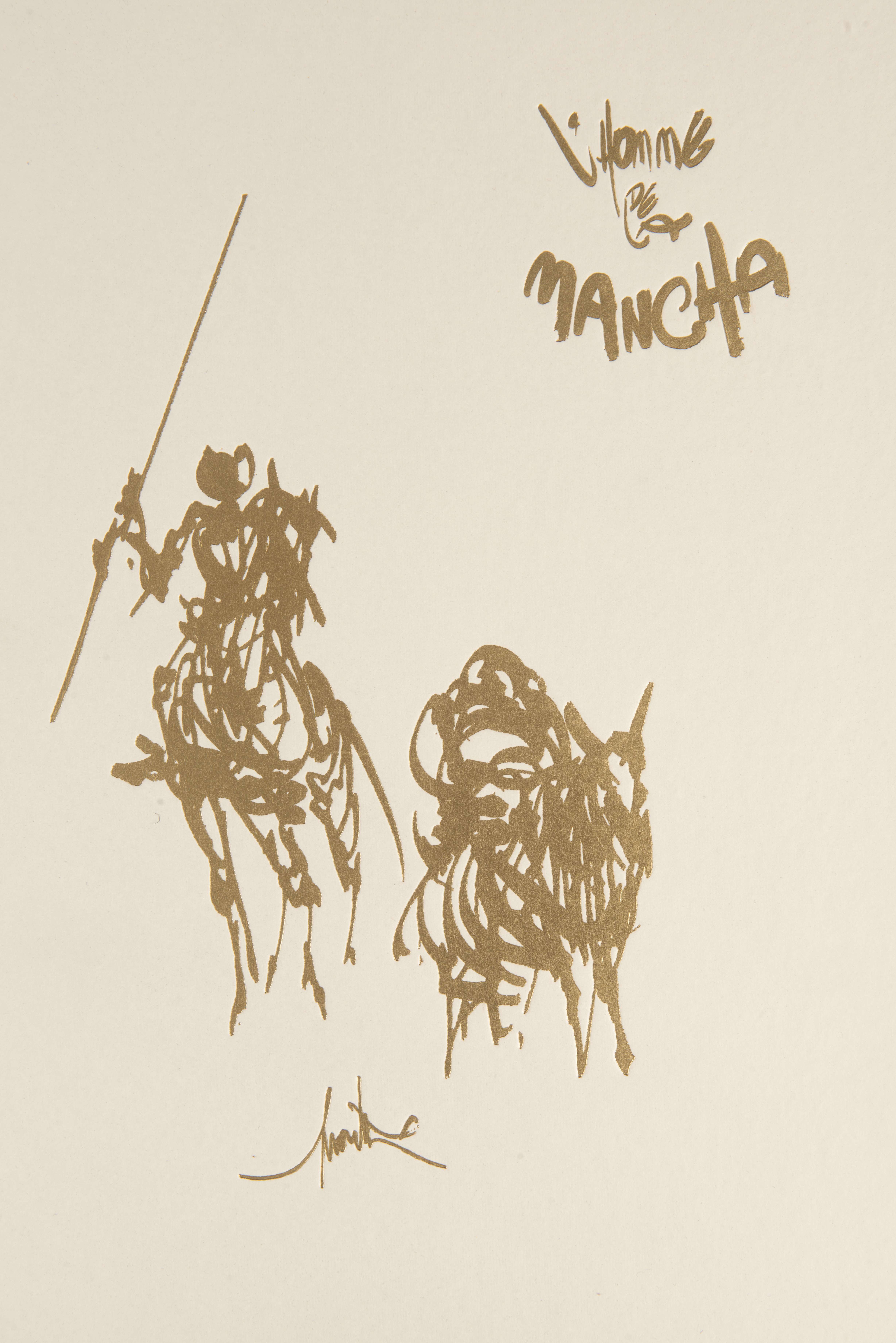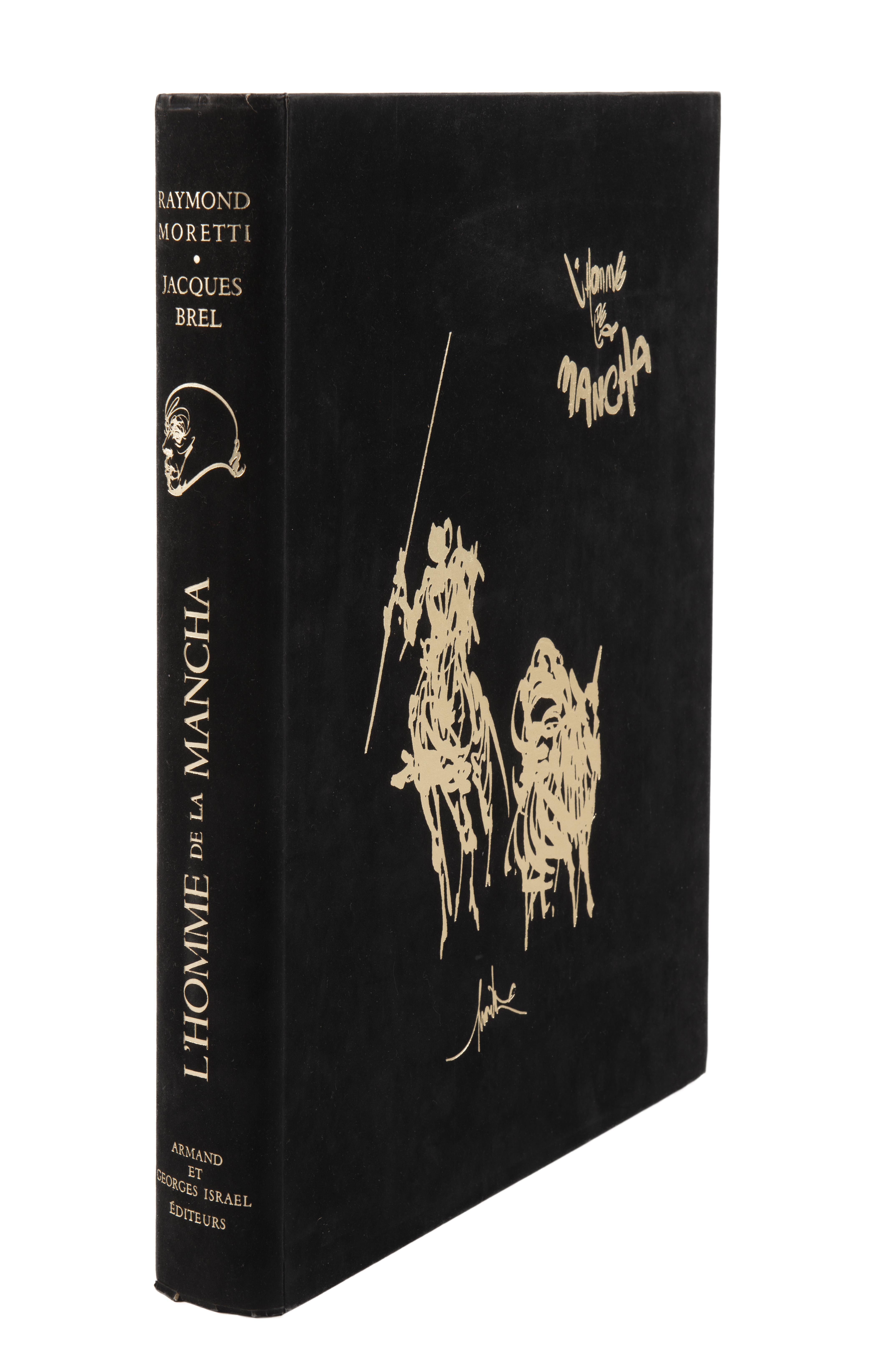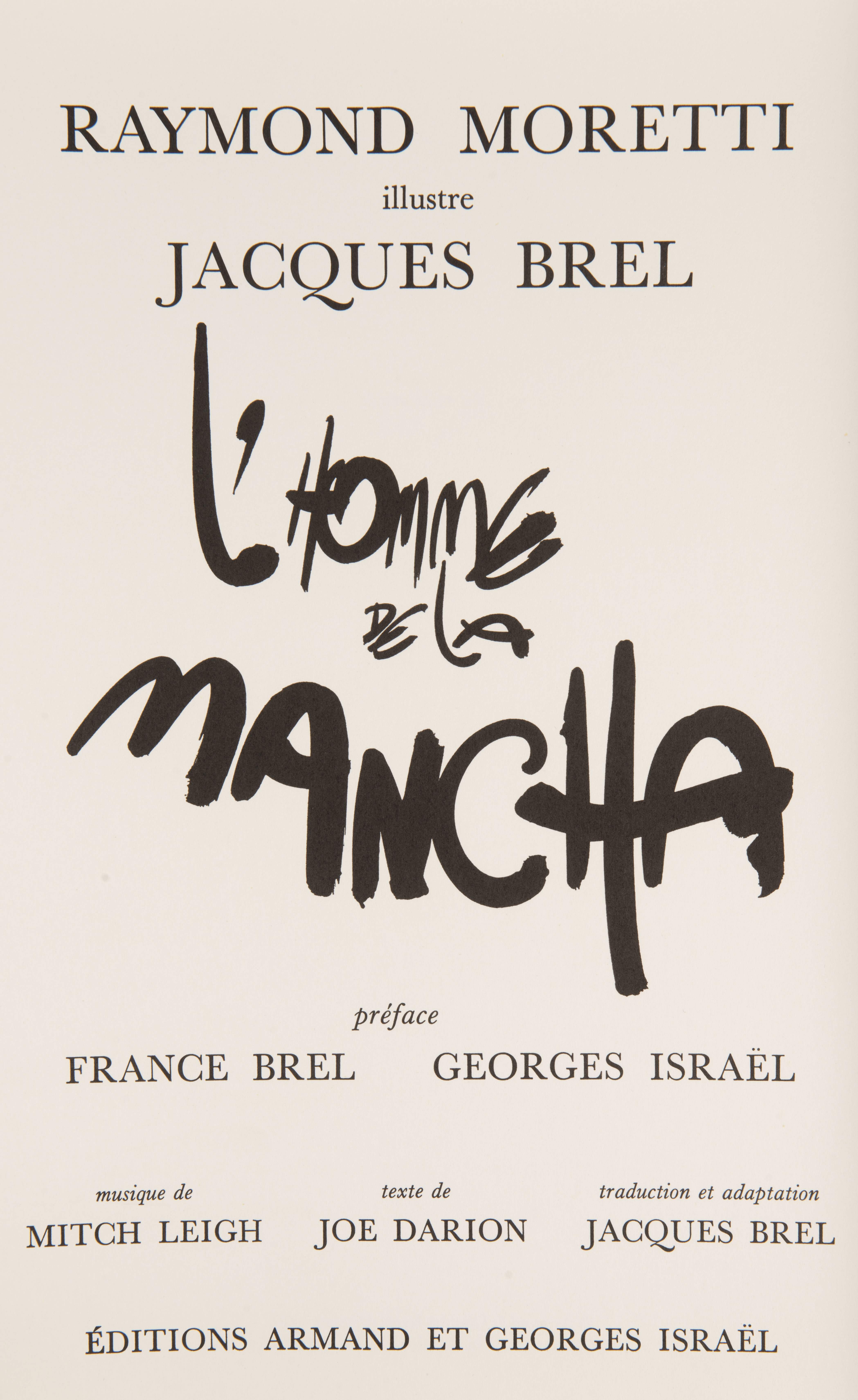 Raymond Moretti illustre Jacques Brel "L'homme de la Mancha" Préface de France Brel & George Israël, musique de Mitch Leigh, texte de Joe Darion, traduction et adaptation de Jacques Brel, éditions Armand et Georges Israël, 1 tome sur grand vélin d'Arches pur chiffon et grand vélin de Lana.