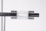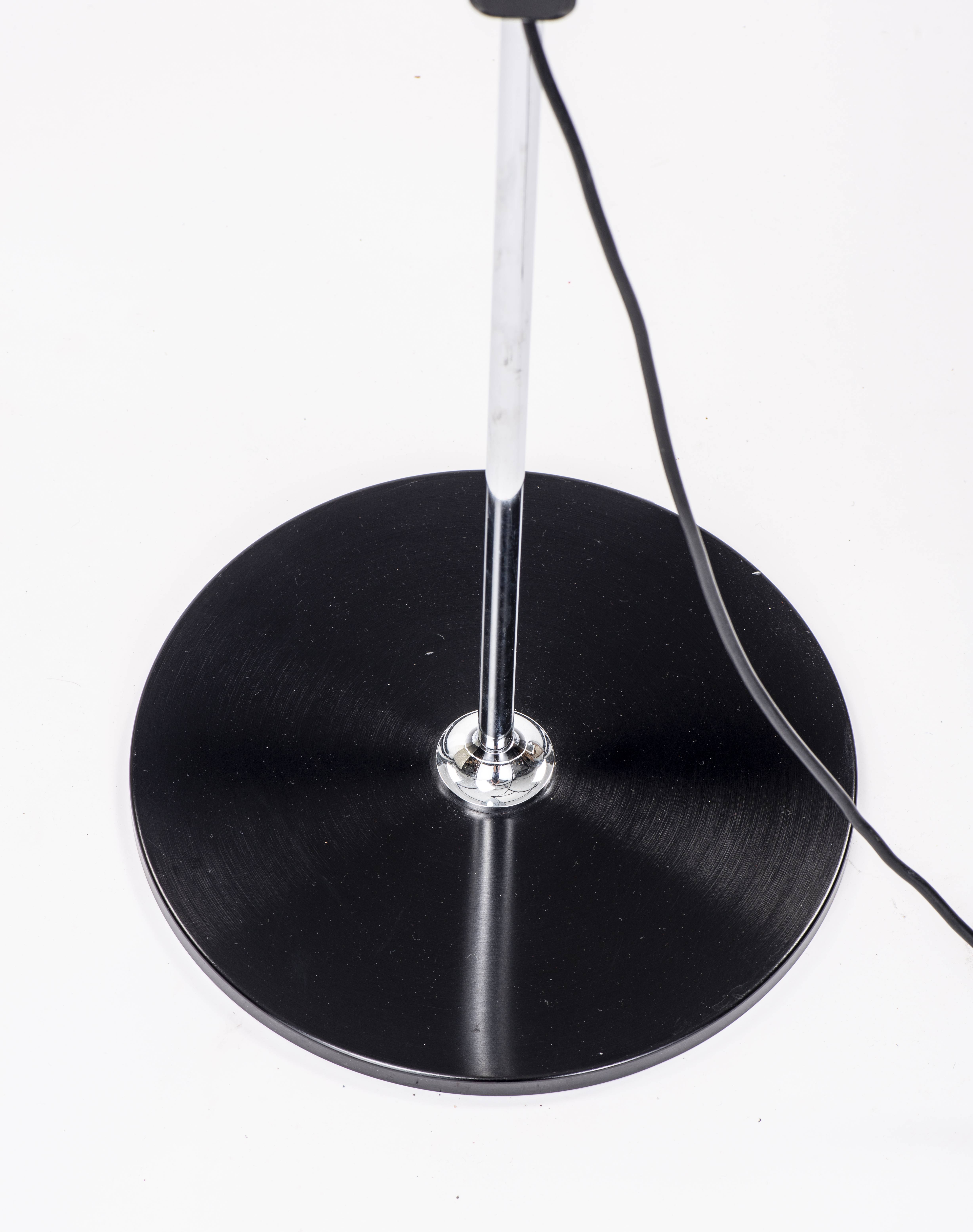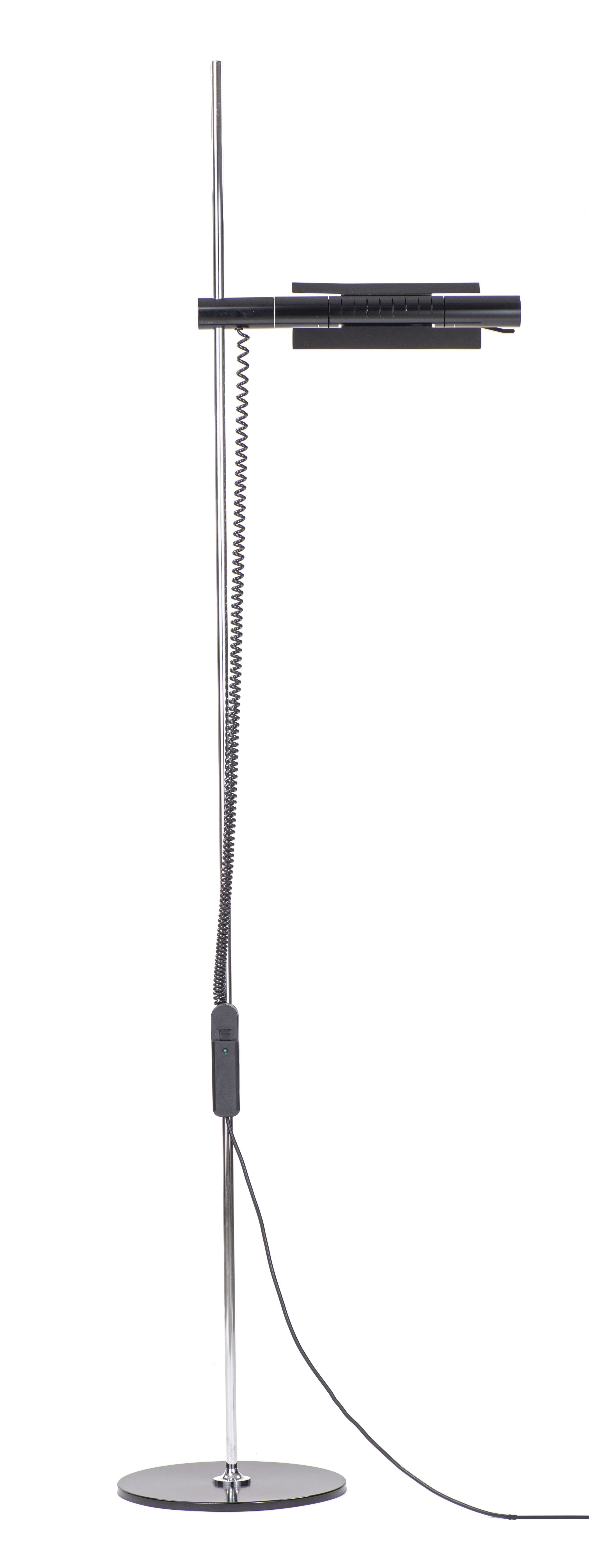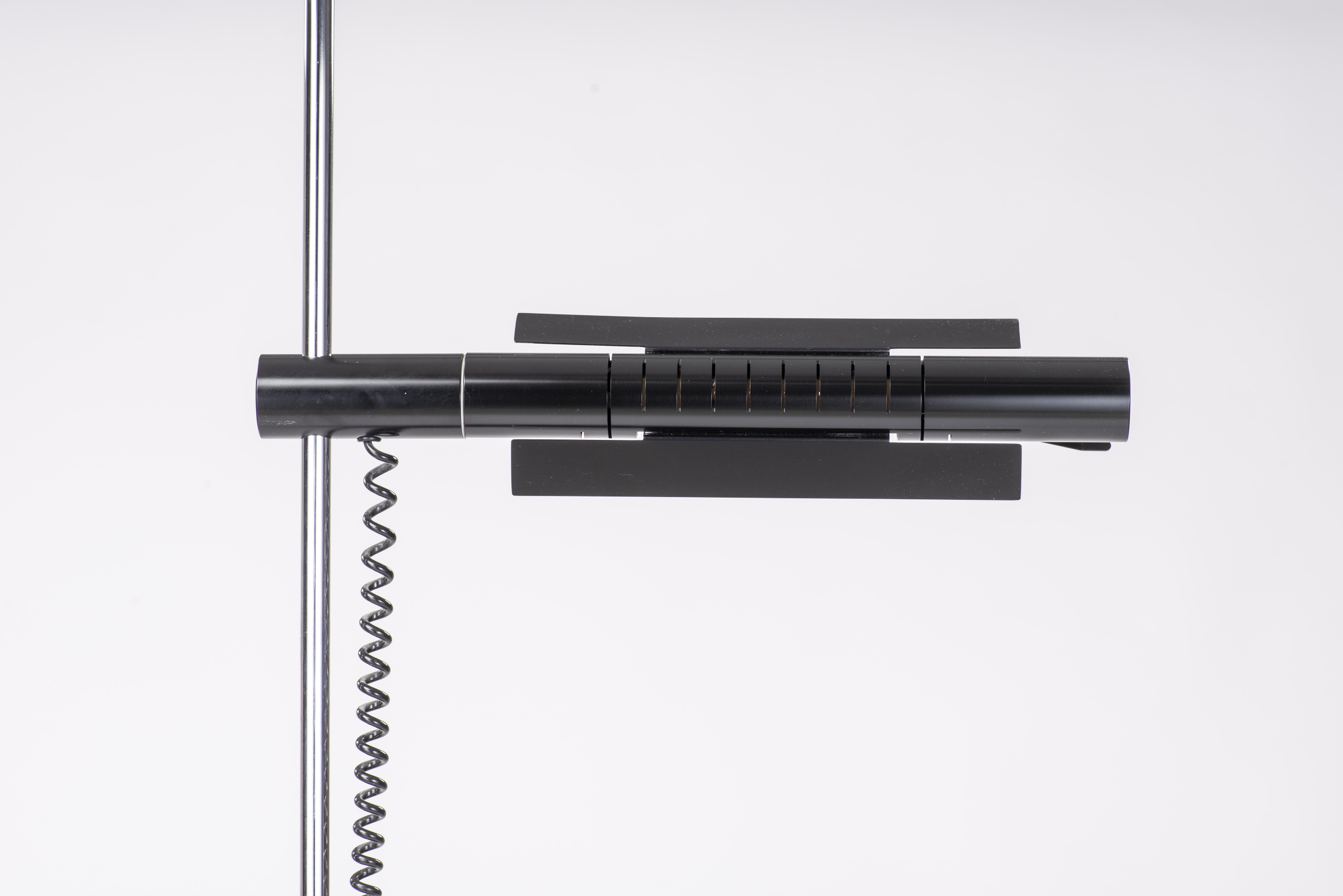 Rosemarie & Rico Baltensweiler, lampadaire Halo à led en métal chromé et noir, interrupteurs coulissants reliés par un câble spiralé noir. Design des années 1970.