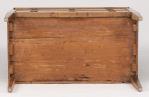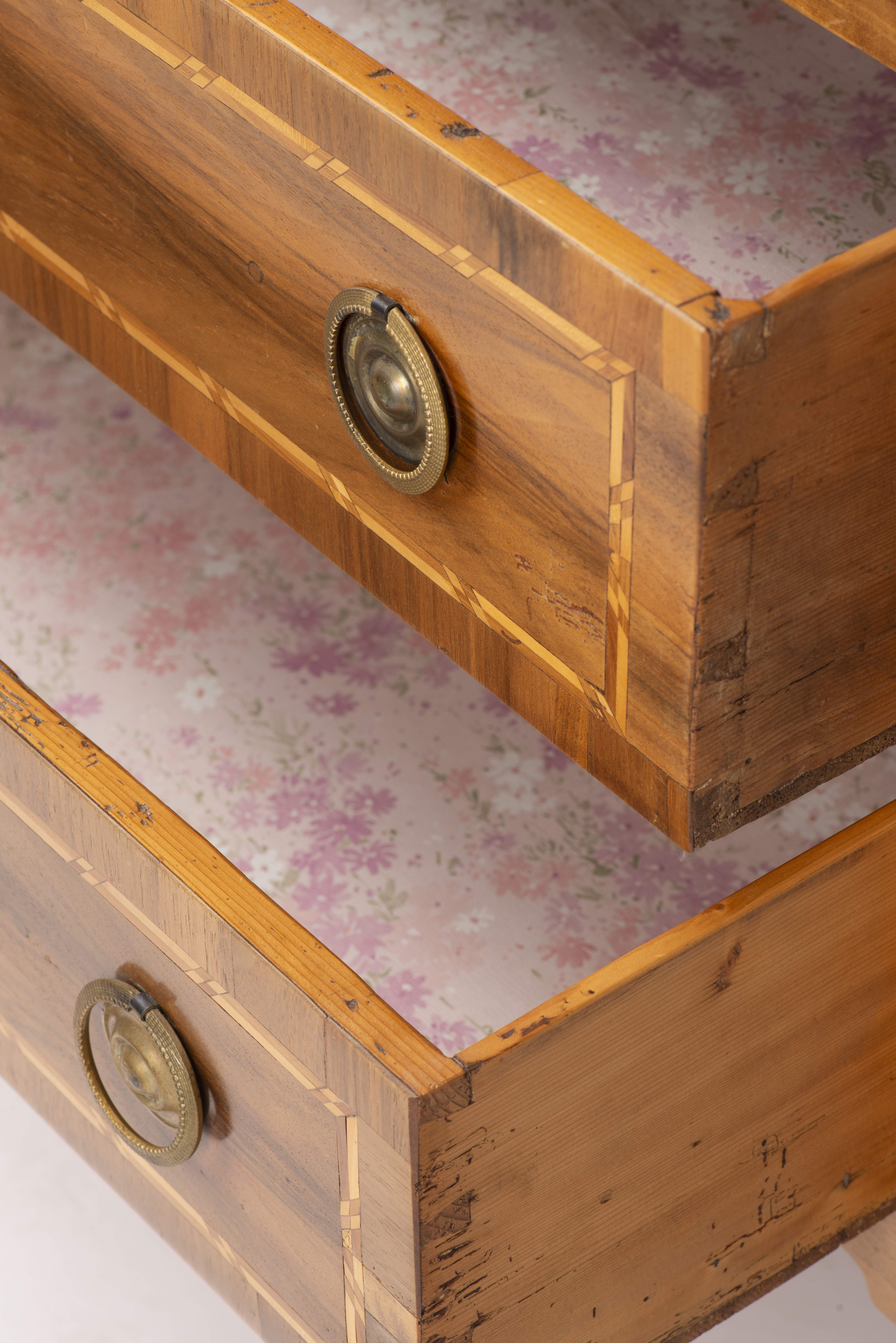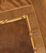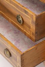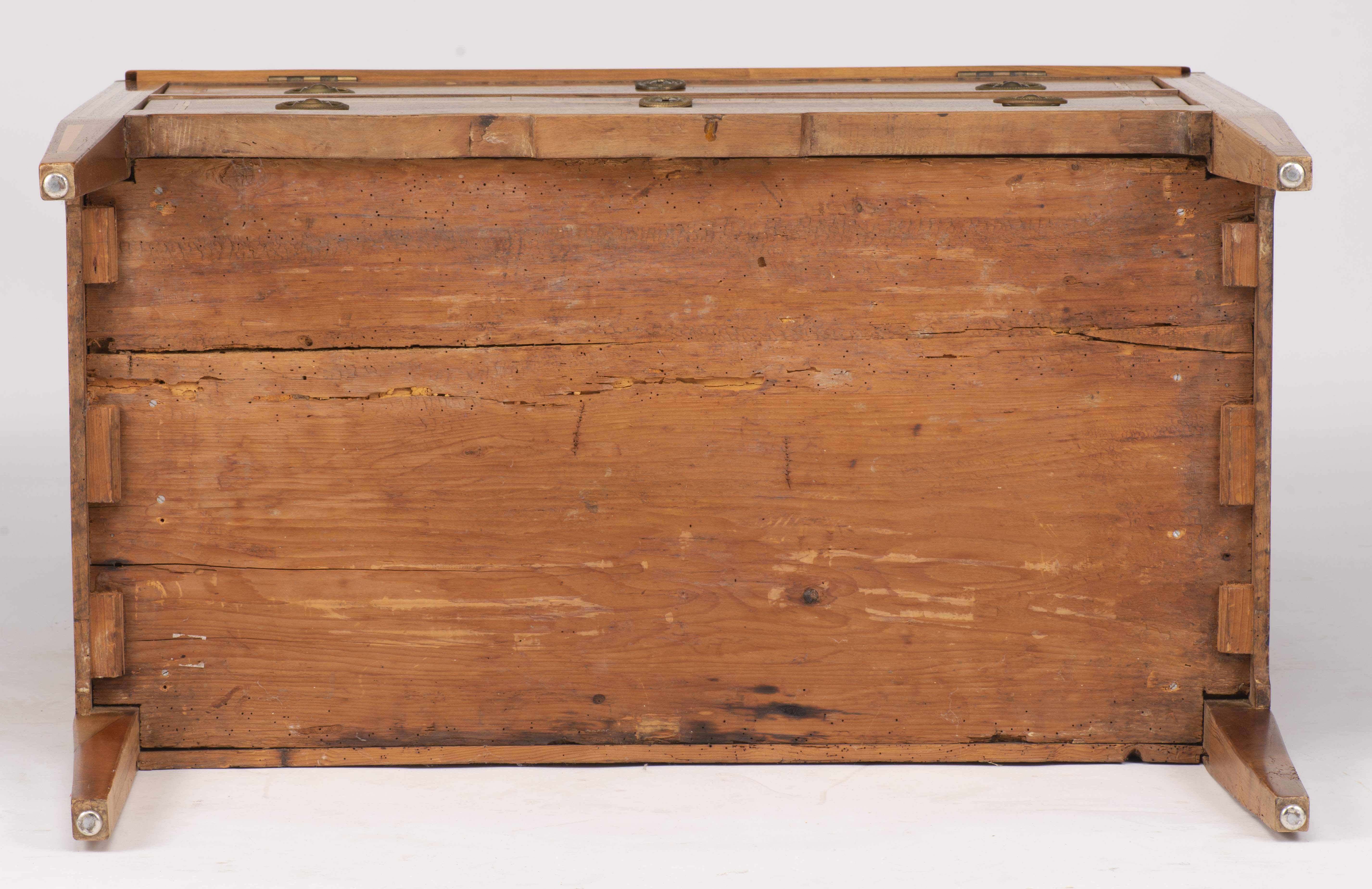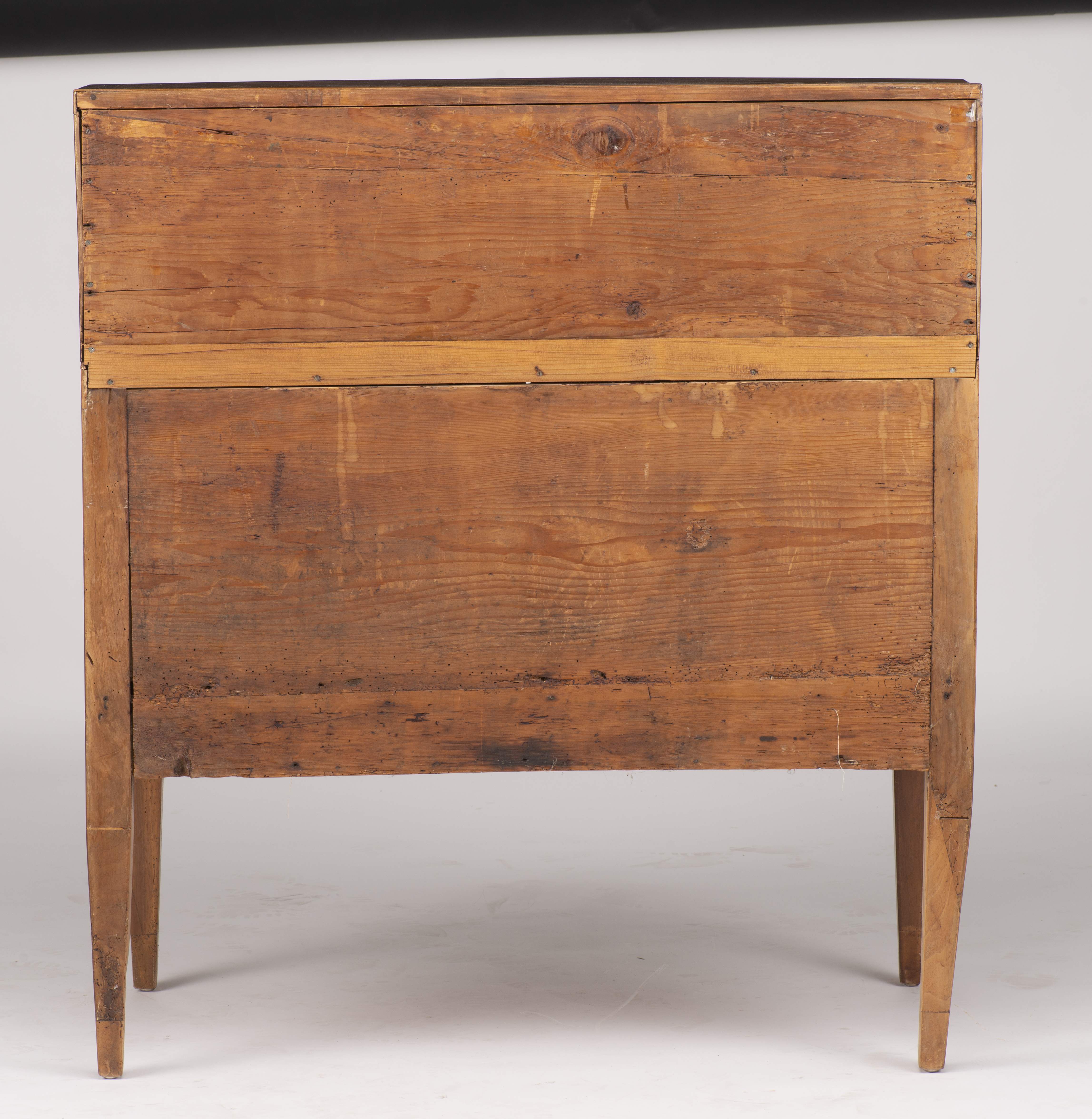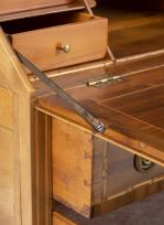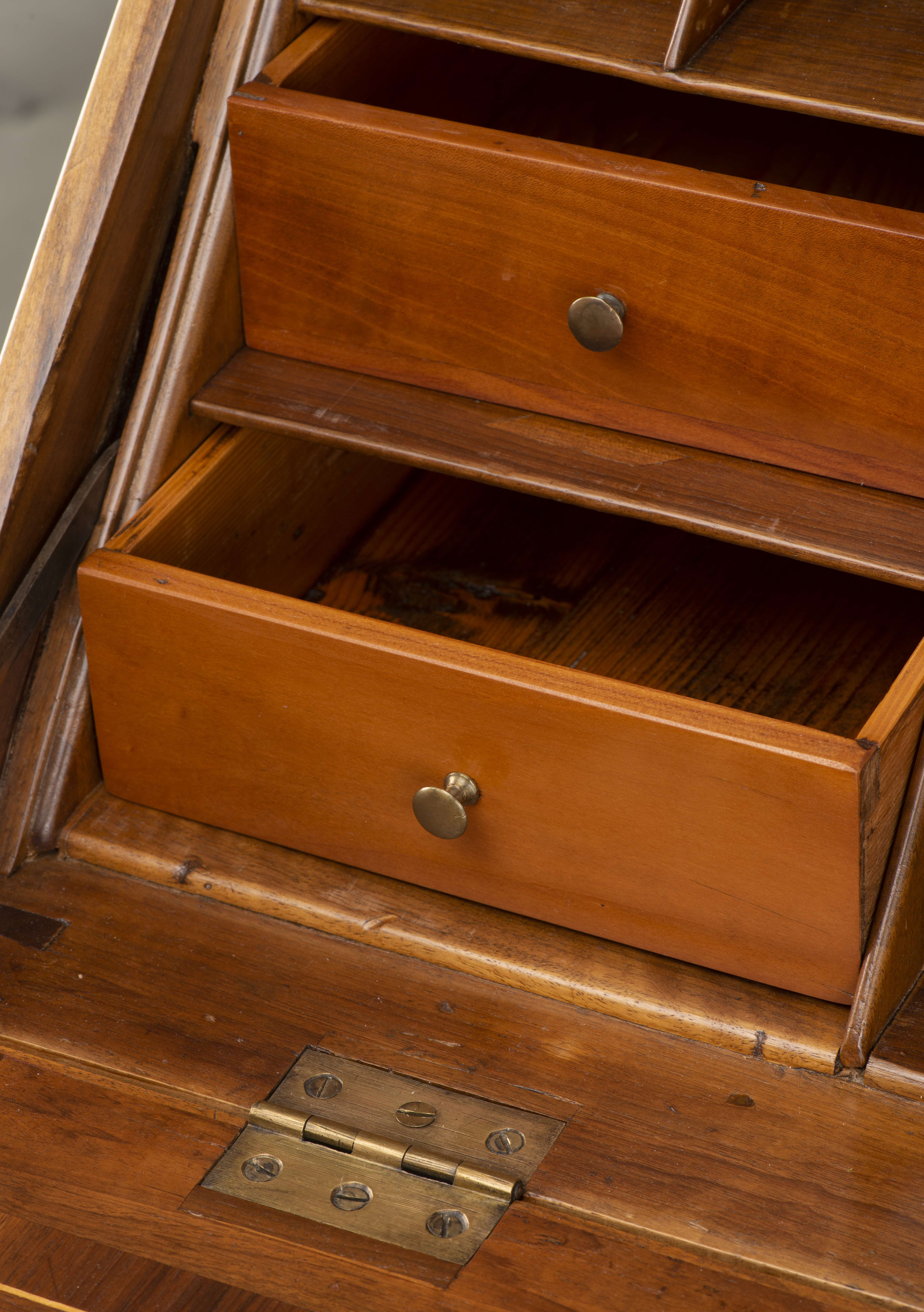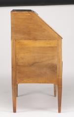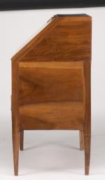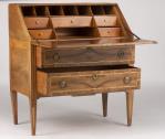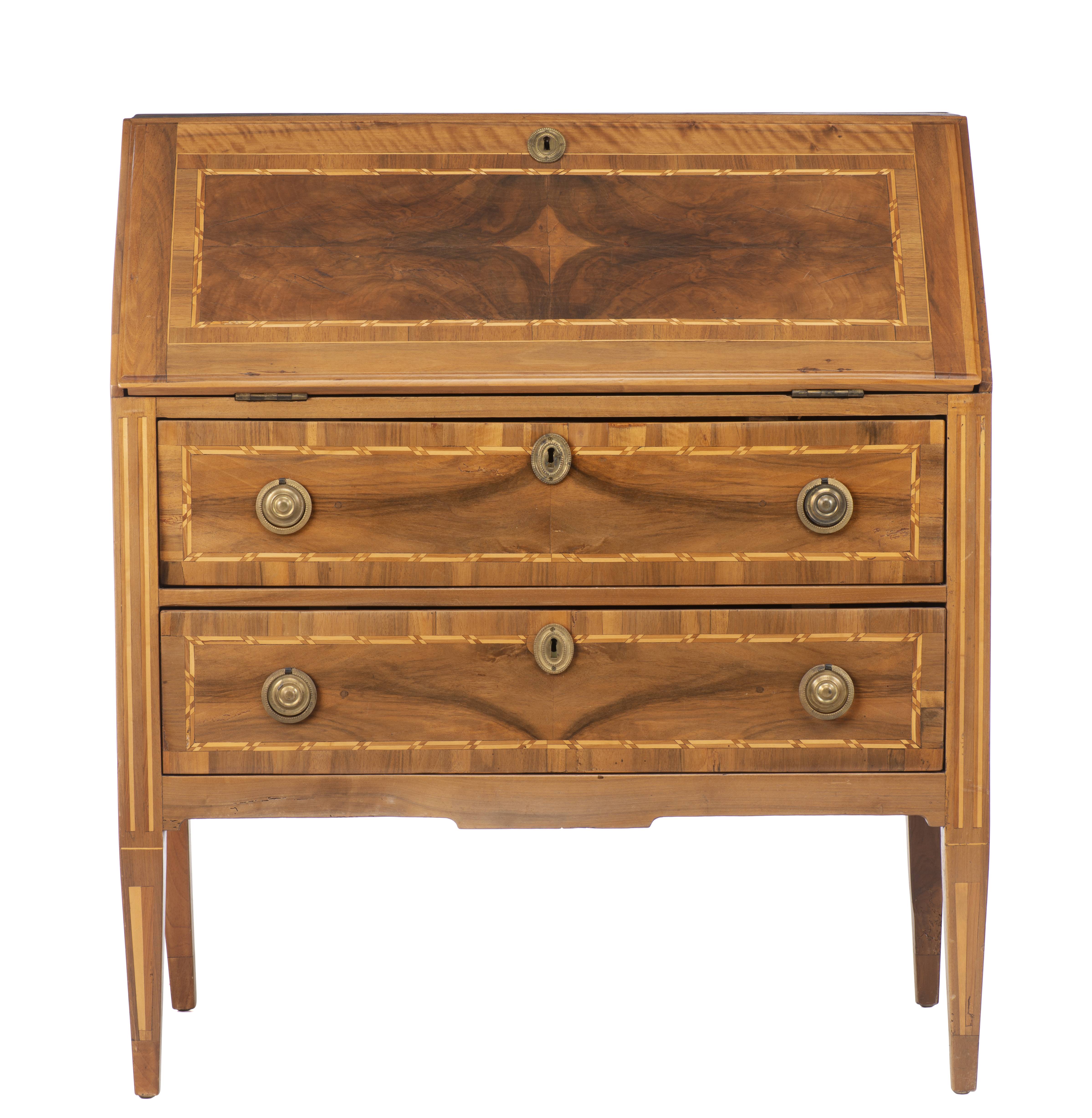 Secrétaire de pente d'époque Louis XVI à 2 tiroirs faisant commode, plateau faisant rabat laissant découvrir 5 tiroirs et 8 niches, 4 pieds fuseaux à fausses cannelures, filets de marqueterie claire sur un champ de noyer.