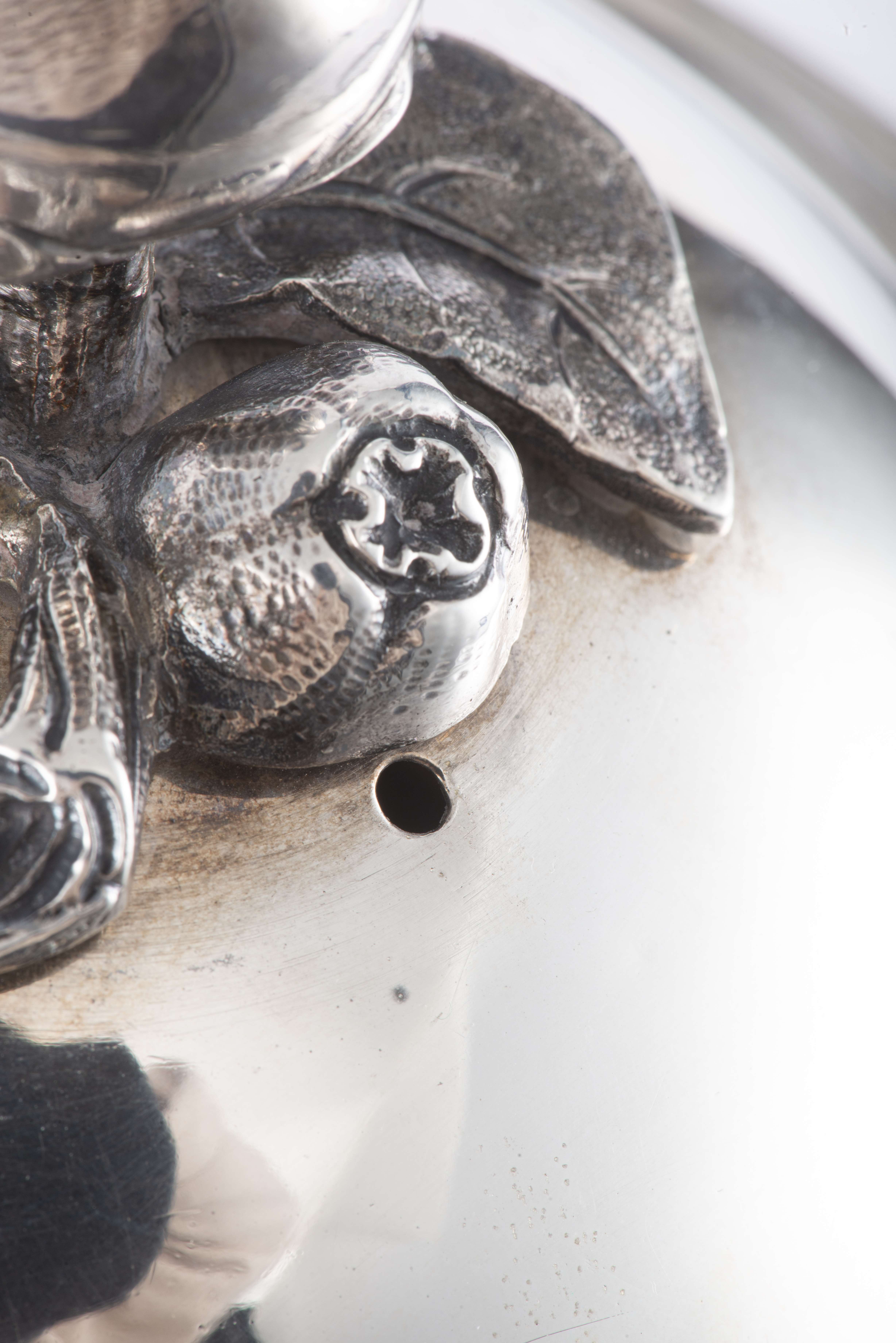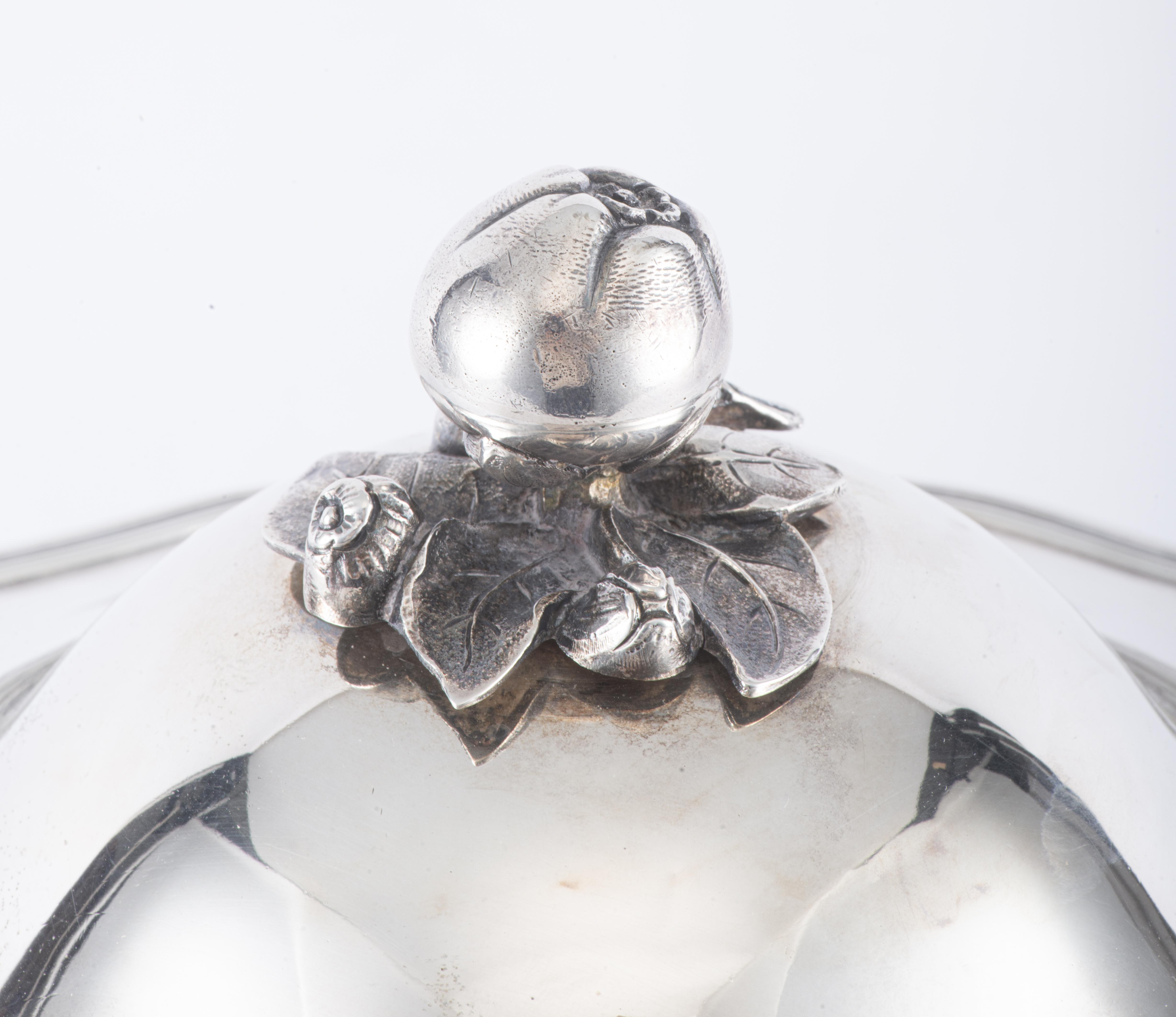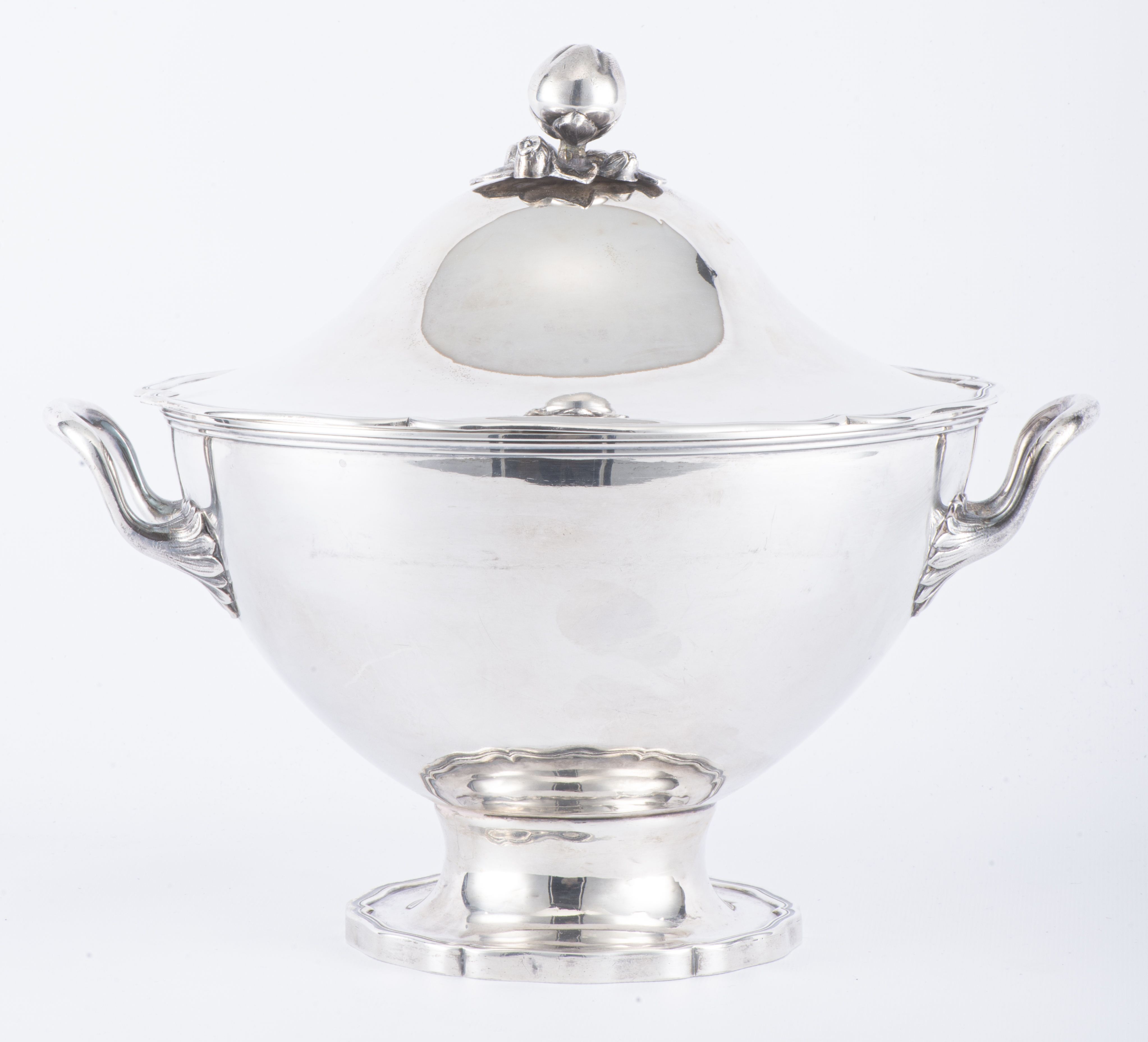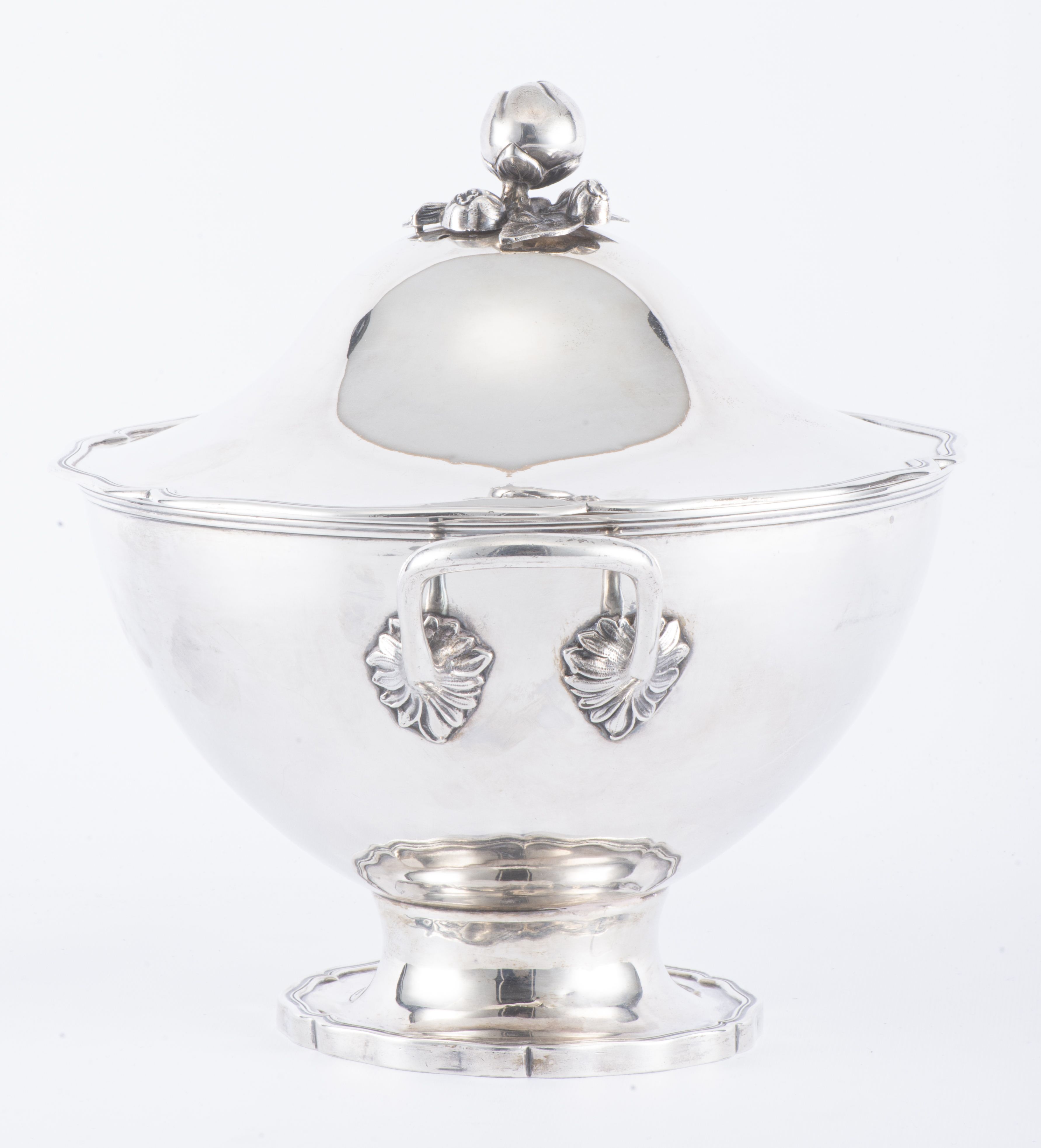 Soupière sur piédouche Régence en argent bernois du XIXe à 2 anses et couvercle à prise en forme de fruits et bordure mouvementée Régence, Monogramme MD pour Marc Dufour (ophtalmologue du XIXe). Poinçons bernois par P+F *IX+