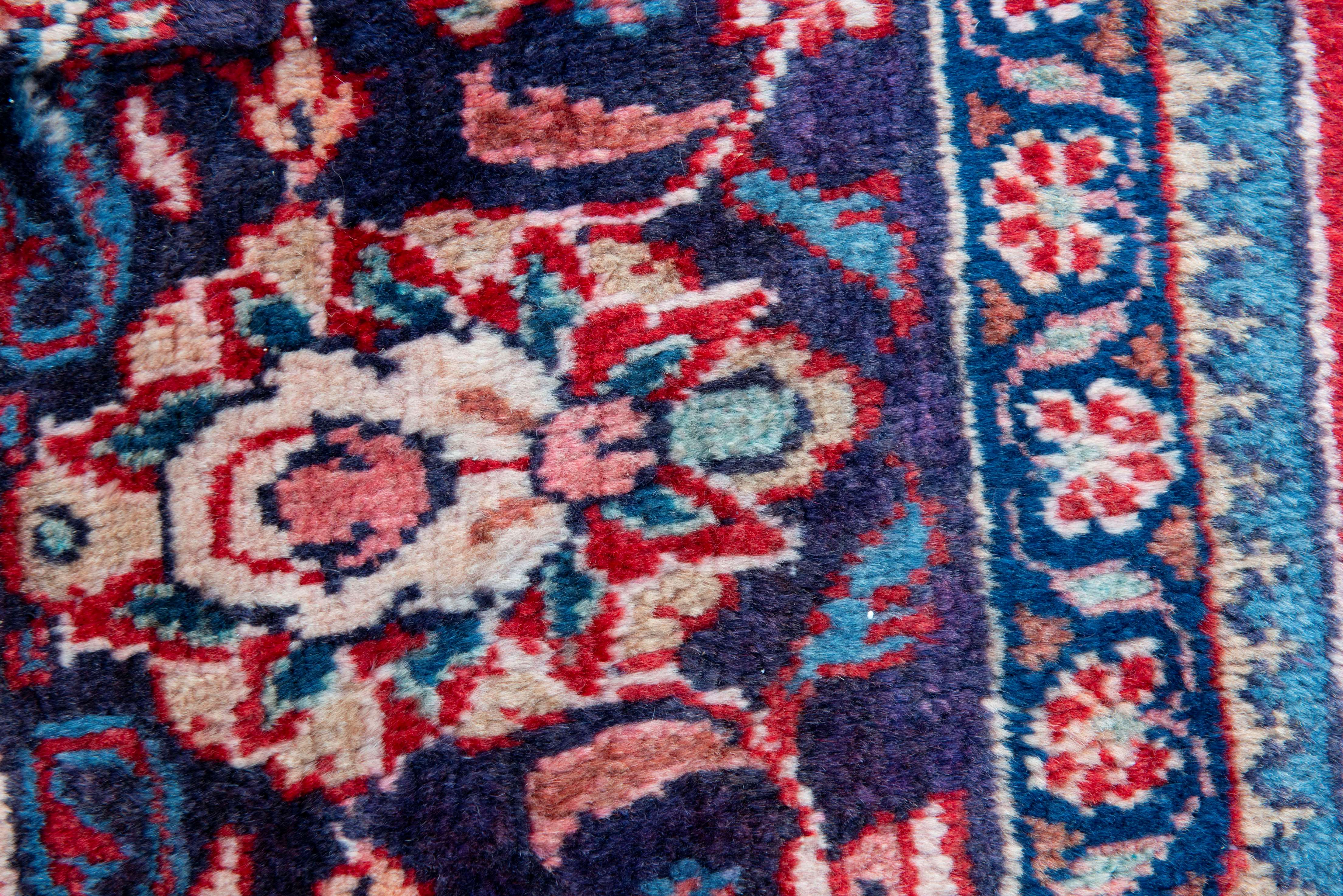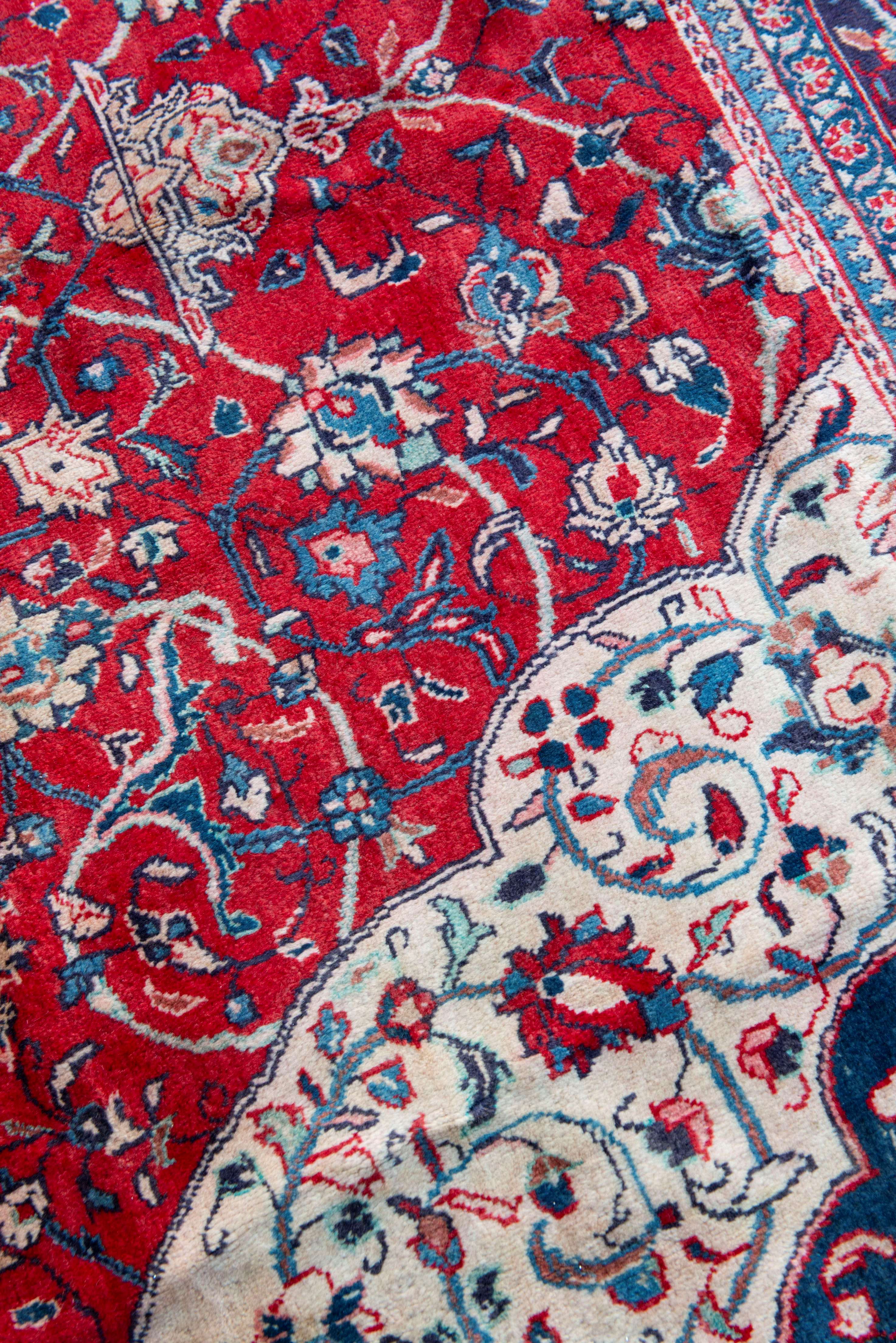 Tapis Hamadan en laine soyeuse sur trame coton à médaillon central étoilé beige et bleu, champ principal rouge à entrelacs de fleurs de lotus, double encoin beige et bleu à décor floral, bordure principale à frise de lotus sur champ bleu.